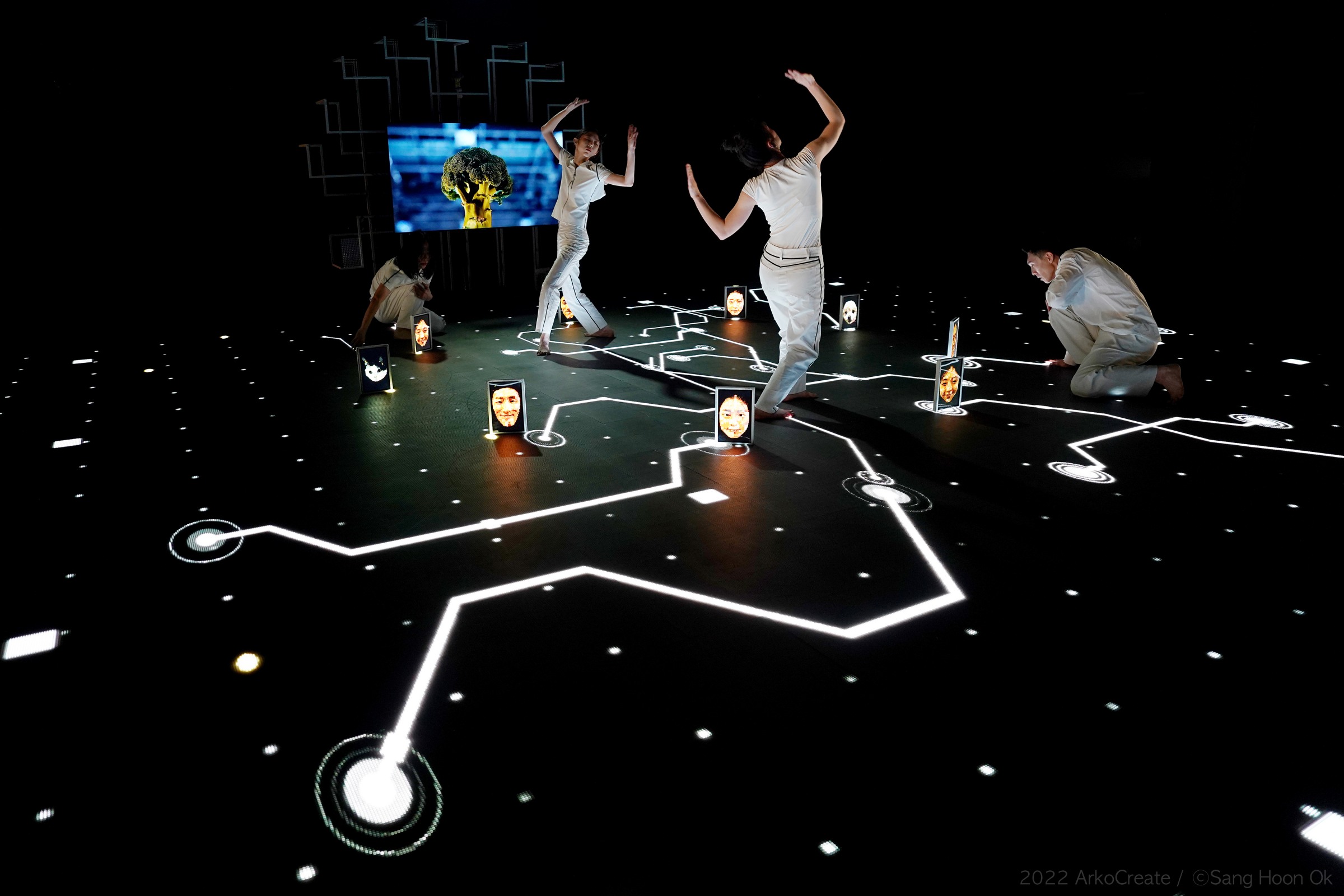 그럼에도/그렇지만 이미지에 복속되는(?) 또는 이미지와 결합하는 신체들과 다른 지위로서, 아마 〈hello world〉에서 가장 인상적인 건 곽유하 무용수의 타자로서의 신체이다. 하지만 이 신체는 곧 움직임 그 자체이기도 하다. 그것은 이미지이기도 하겠지만 독립적인 움직임이다, 이미지를 가장한. 태블릿 PC를 든 신체가 저절로 바뀌는 이미지 이후, 이를 확인시키는 마술사라는 존재로 재위치하는 것과는 다르게, 아무것도 손에 들지 않은 채 발화하는 몸은 인지적 소통의 범위 바깥에 있다. 분절되며 연장되는 신체는 기능적이기보다 순수 움직임을 재현하는 유사 로봇 신체에 가깝다. 물론 이는 가상 환경에서 이미지의 떠다님 아래 위치한 신체의 행위적 특질과 그 궤도를 같이 하면서, 곧 그것이 비인간적 존재의 실천이라는 것을 인지하게 하면서, 동시에 이미지를 인지하는 중간자적 존재들과의 차이 아래 이러한 몸의 양태가 지닌 다른 궤적이 인지될 수 있다.