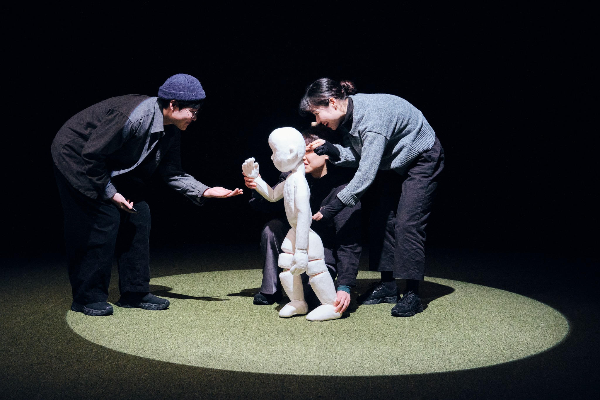 (사진 좌측부터) 박세련 연출, 이진경 배우, 정대진 배우. 해와 바람의 다툼, 그리고 이를 방관하는 구름으로 인해 비가 내리고 제어되지 않고 홍수가 나서 생물들이 죽고 무덤으로 뒤덮인 세상이 된다. 이제 세상의 수많은 구멍은 갖은 생명체의 무덤이 된다. 또는 세상은 구멍 자체가 된다. 죽음을 삶으로 분리하는 게 아니라 끊임없이 삶의 일부로 통합하는 데서 나아가 죽음으로 삶이 흡수되는 반복으로서의 서사는, 생명이 없는 것, 곧 초반에 죽음으로 지정된 인형을 생명으로 만들거나 이를 모사해 인형의 움직임을 따라 하는 두 배우의 삶과 죽음의 ‘접촉’, 또는 호환으로의 의지로 연장된다. 죽음을 만지기도 하지만 그 죽음에 동화되기도 한다.