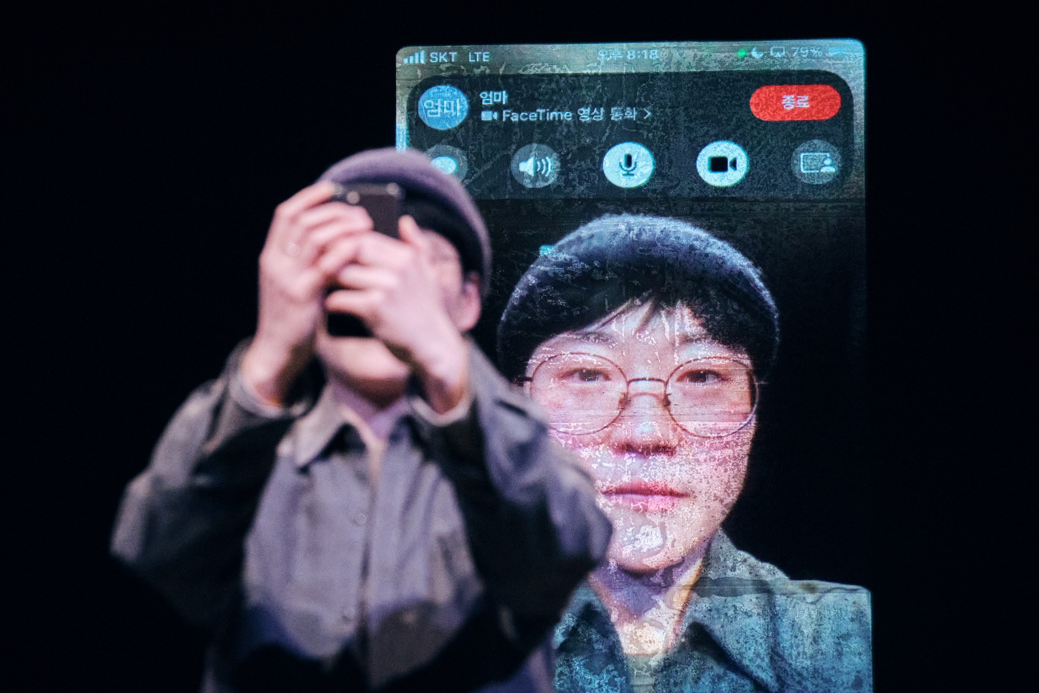 창작집다 ‘여기에 있다’, 〈페이스 타임〉[사진 제공=두산아트센터](이하 상동). 박세련 연출. 창작집다 ‘여기에 있다’의 〈페이스 타임〉은 박세련 연출의 사라지지 않은 어머니의 번호로부터 영상 통화—“페이스 타임”—가 걸려 온다는 가정에서 시작한다. 여기서 전화번호라는 흔적은 부재를 현재로 기입하고 있으며, 이를 눌렀을 때 뜨는 빈 화면은 과거를 미래로 위치시킨다. 물론 이 화면은 가능하지 않을 것이고, 결말에는 정대진과 이진경 두 배우의 얼굴이 대체한다. 배우들의 발화와 극중극으로 투여되는 인형극 형식의 교차로 진행되는 극에서, 가상의 차원에서 이뤄진 현전은 후자와 관련되는 듯하다.