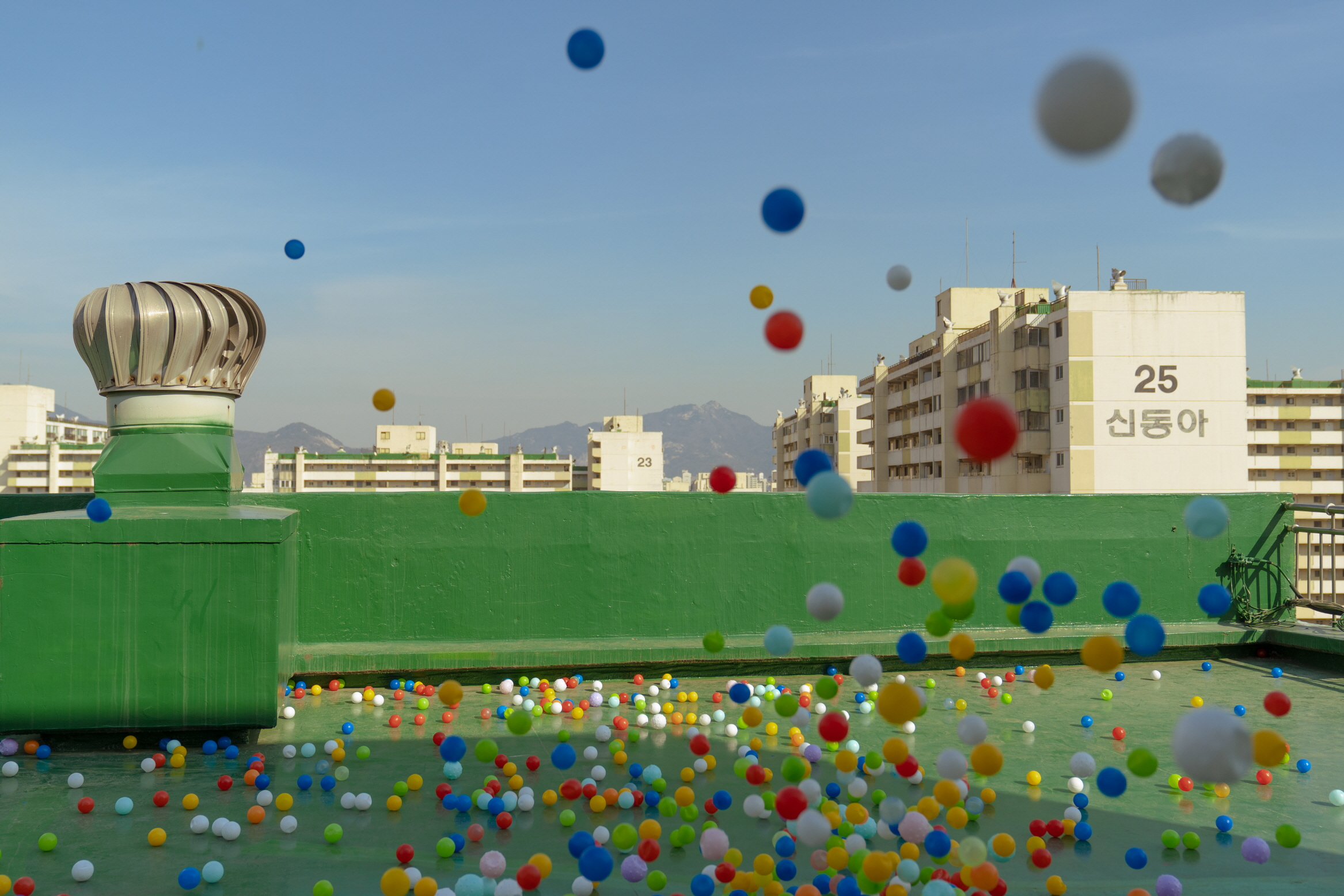 모든 퍼포머가 집산하며 관객과 인사를 나누는 마지막 옥상 공간에서는 건물 안쪽의 양옆 벽 사이의 공간에서 다시 관객이 있는 쪽으로 이동하며 진행되는데, 사이 공간을 통한 극적인 장면의 연출은 종국에 옥상 꼭대기에서 관객에게 떨어뜨리는 공들과 함께 서로를 마주하는 커뮤니케이션으로 전환된다. 이러한 장면들은 앞선 계단과 계단 틈의 기이한 커뮤니케이션의 거리감을 재확인시키는 한편, ‘이웃’ 자체로 서로를 현상하기에 이른다.