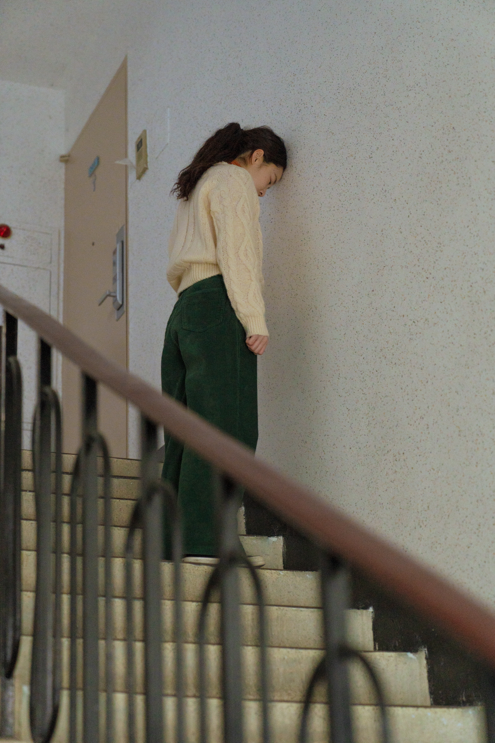 이러한 내용적인 서사를 뚫고 나오는 건 몸과 공간의 유착이다. 실제 그곳에 함께 위치하기, 이동과 봄이라는 수행이 동반된 퍼포먼스는 의미를 배반하거나 역전하며 독특한 정동으로 부상한다. 대면 접촉과 이웃의 긴밀한 관계성이라는 내용의 예외로서 손이라는 형식은 신비하게 출현한다. 이는 계단과 계단 사이를, 나아가 “인사”에 대한 일상적인 이야기 녹음을 비집고 나오며, 계단과 계단 사이의 ‘틈” 자체를 지각 가능한 것으로 만든다. 건물을 더듬어 가는 몸들은 사실상 공간 안에 자리하기보다 공간을 자리하게 한다. 이러한 공간은 물리적인 영역과 경계이며 수직 상승해 가는 건물의 ‘역량’으로 연장된다. 따라서 그 틈 바깥의 보이지 않는 신체는 이 공간의 신체를 뛰어넘는 아득한 거리감과 함께 그것과 결합하려는 시각적 충동을 안기며, 아찔함과 아련함 따위의 어떤 감정들을 불러일으킨다.