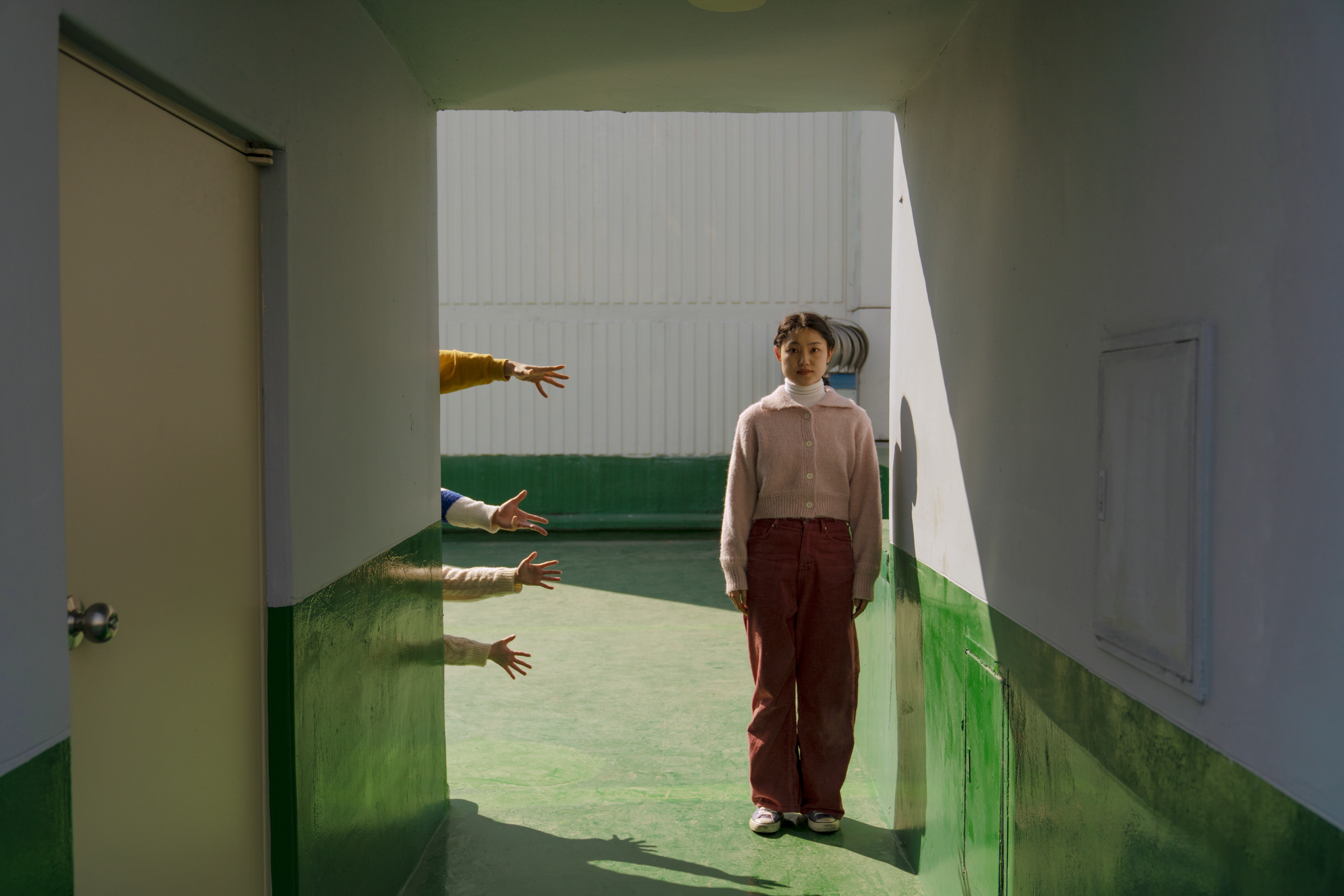 이러한 내용적인 서사를 뚫고 나오는 건 몸과 공간의 유착이다. 실제 그곳에 함께 위치하기, 이동과 봄이라는 수행이 동반된 퍼포먼스는 의미를 배반하거나 역전하며 독특한 정동으로 부상한다. 대면 접촉과 이웃의 긴밀한 관계성이라는 내용의 예외로서 손이라는 형식은 신비하게 출현한다. 이는 계단과 계단 사이를, 나아가 “인사”에 대한 일상적인 이야기 녹음을 비집고 나오며, 계단과 계단 사이의 ‘틈” 자체를 지각 가능한 것으로 만든다. 건물을 더듬어 가는 몸들은 사실상 공간 안에 자리하기보다 공간을 자리하게 한다. 이러한 공간은 물리적인 영역과 경계이며 수직 상승해 가는 건물의 ‘역량’으로 연장된다. 따라서 그 틈 바깥의 보이지 않는 신체는 이 공간의 신체를 뛰어넘는 아득한 거리감과 함께 그것과 결합하려는 시각적 충동을 안기며, 아찔함과 아련함 따위의 어떤 감정들을 불러일으킨다.