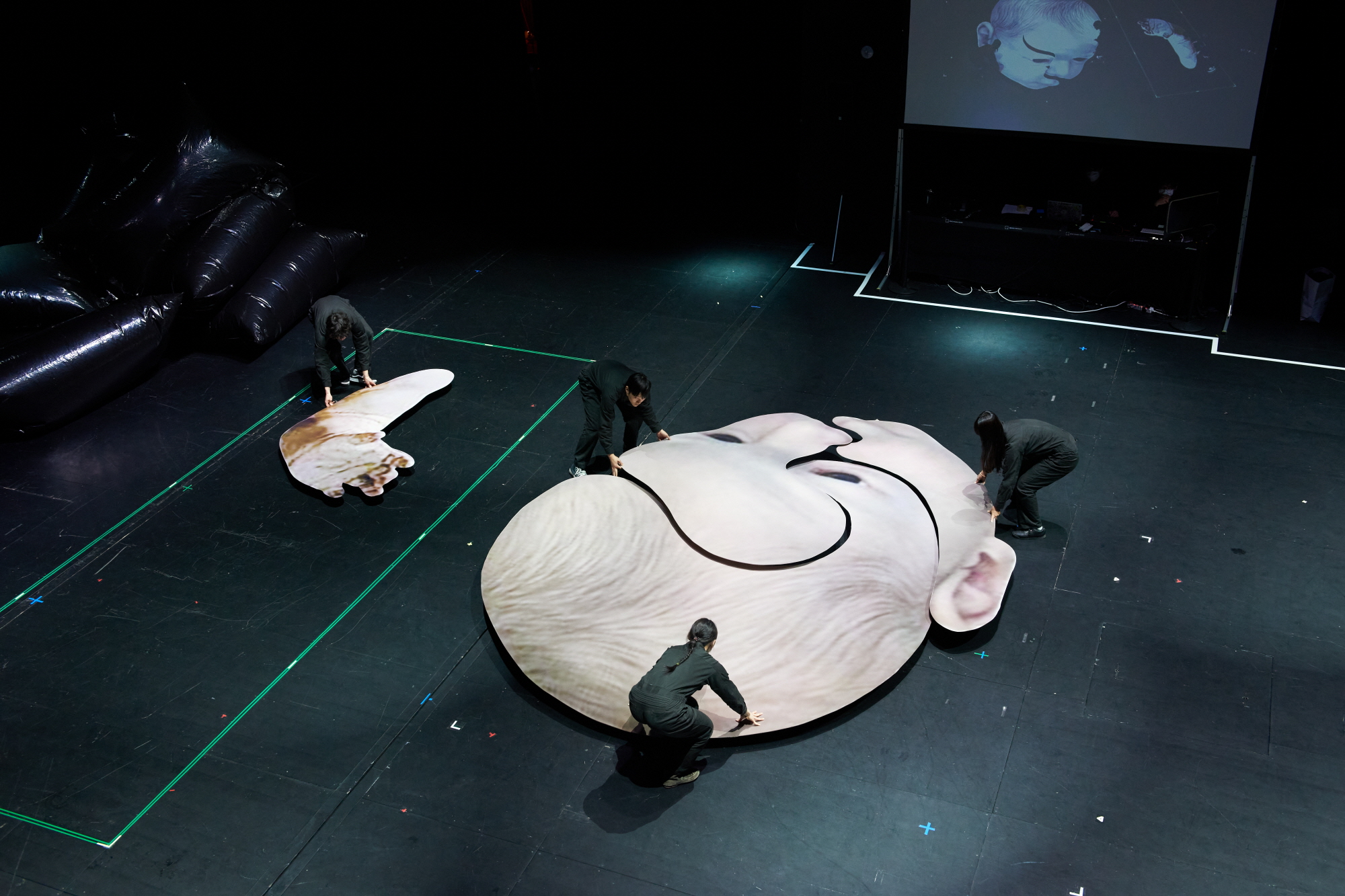 콘셉트/연출/무대미술: 적극, 주최/주관/제작: 서울문화재단 대학로극장 쿼드, 〈다페르튜토 쿼드〉[사진 제공=서울문화재단](이하 상동). 〈다페르튜토 쿼드〉는 어떤 말이 있고, 그것을 수행하는 순서를 가져간다. 프롬프터의 말이 무대로 흘러나오고, 그것이 규칙이 되고 표현의 근거가 된다. 곧 각각 연출의 말과 배우의 수행이 그것이다. 그 말에 따라 관객은 빛과 어둠의 경계를 분별하며 어둠에 자리해야 한다. 마지막에 어둠과 빛의 경계를 무력화하는 것 역시 말이다. 쿼드 극장을 말(제목)과 공간으로 전유한, 〈다페르튜토 쿼드〉는 불, 물, 흙, 공기의 4막으로 태초의 세계를 이야기한다. 하지만 이는 기원을 재현할 수 있으리라는 믿음, 또는 기원을 재현해야 한다는 강박으로부터 자유롭다.