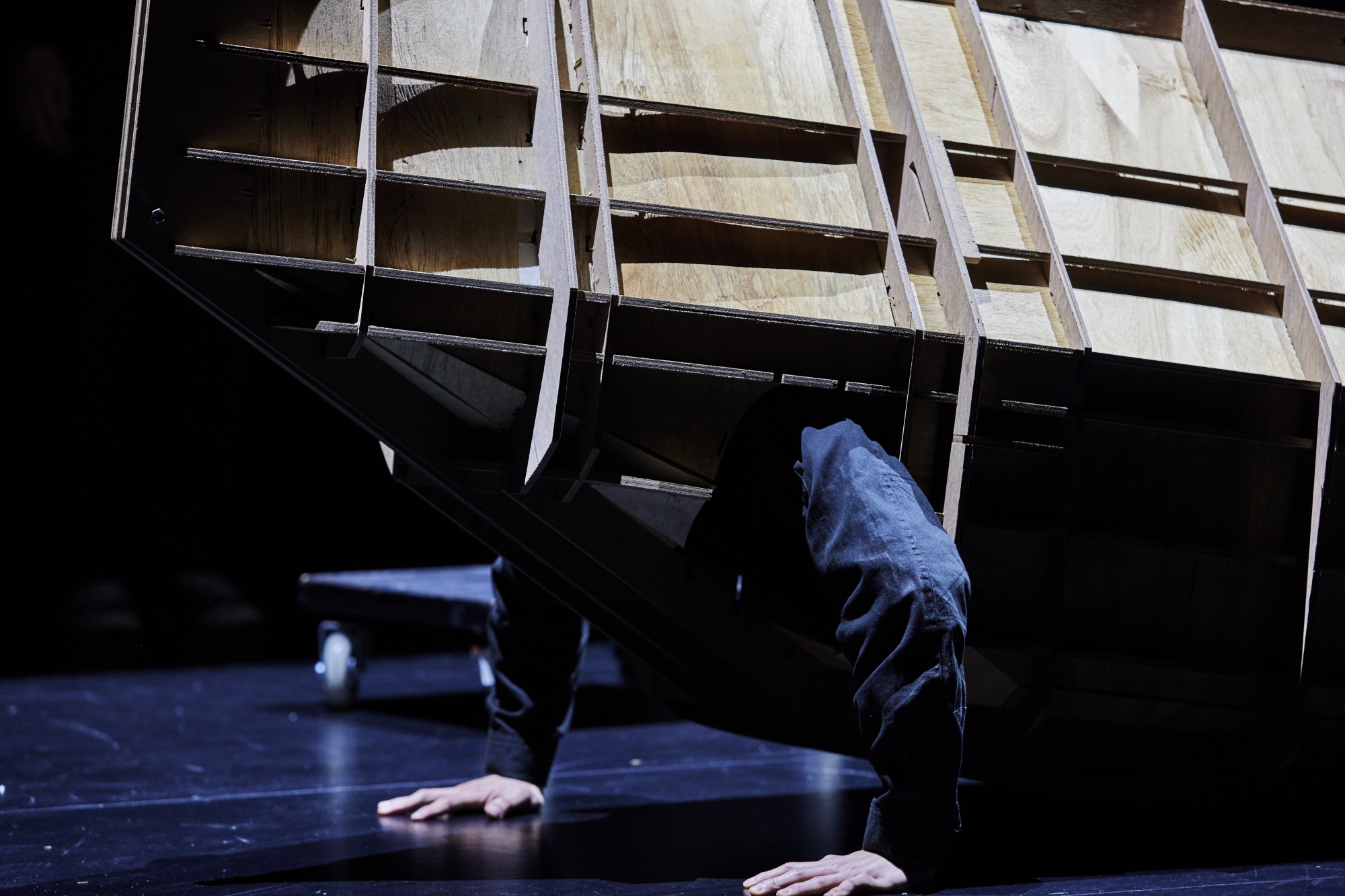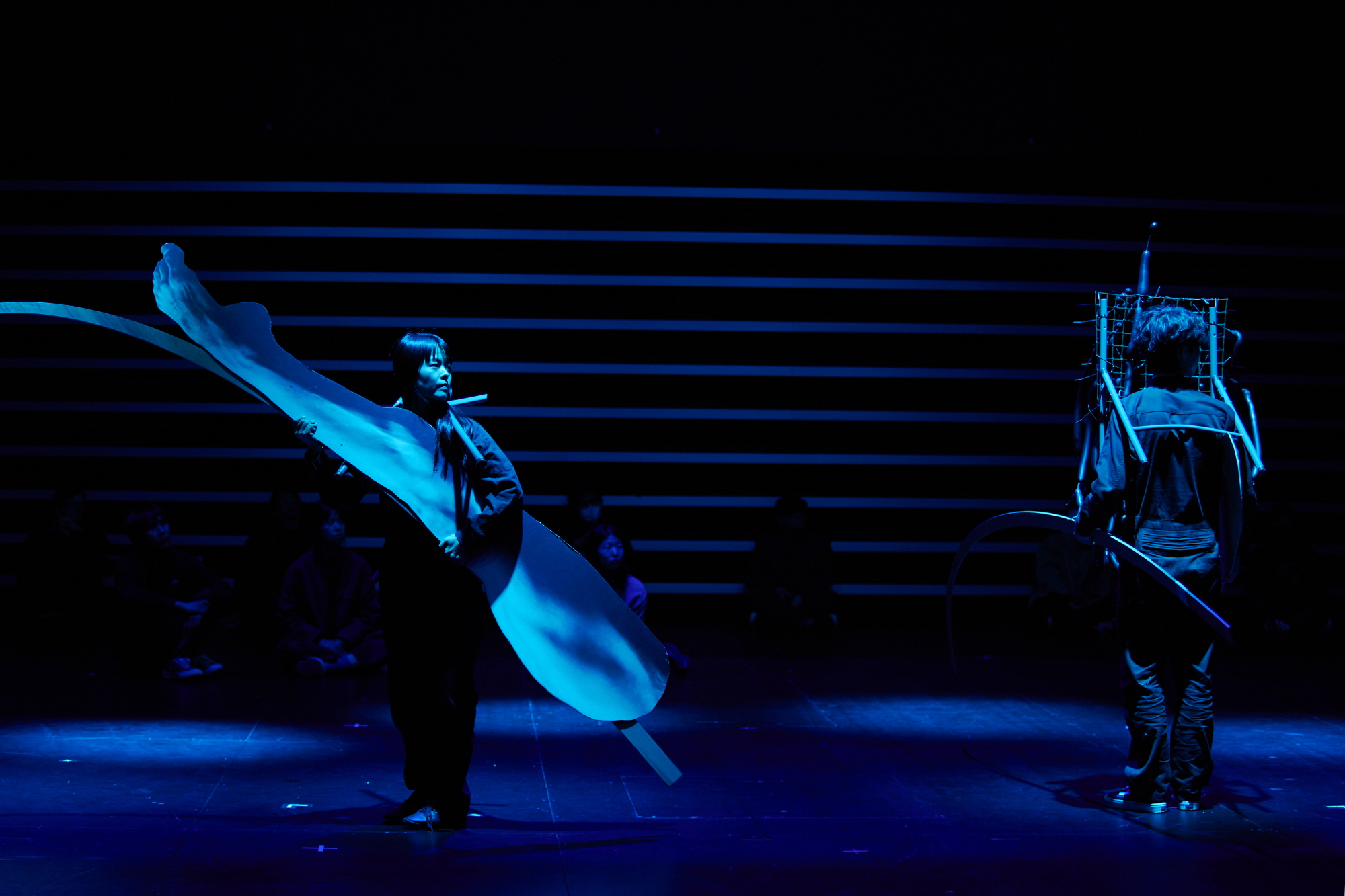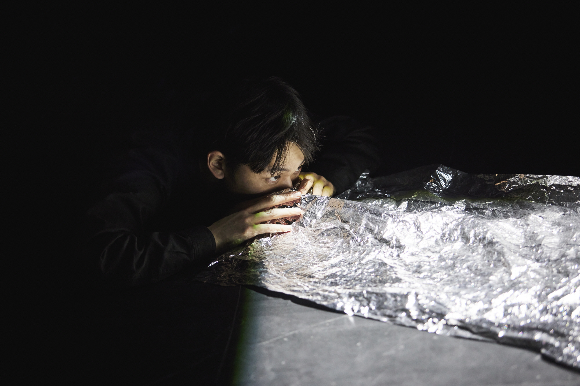 물을 다루는 2막은 가장 가벼운 오브제의 끊임없는 변용의 이미지에서 시작한다. 곧 은박지는 조명을 받으며 산란하는 물의 흐름으로 드러난다. 오브제이기도 하고 공간이기도 한 이 은박지는 신체와 맞닿으며 신체로부터 연장된다. 이어 나오는 서사에는 다페르튜토 스튜디오의 이전 작업인 〈암세포 삼형제〉의 모티브가 합성되었는데, 아버지의 암세포들이 등장하고, 무력해진 아버지 위에 천장에서 내려온 거푸집 같은 나무 틀이 씌워진다. 죽음에서 시원으로 돌아가는 아버지는 최초로 지상에 올라 인류의 조상이 됐던 순간의 모델이 되며, 이는 물과 뭍의 경계를 반복적으로 구성하는 팔굽혀펴기 형태로 나타난다. 이른바 “팔굽혀펴기 물고기”다. 정점은 해미 클레멘세비츠의 사운드 퍼포먼스로, 바닥의 진동과 공간 전체의 떨림을 통해, 공간은 더 세분화되고 쪼개지며 하나의 전체를 형성한다. 공간의 입자화와 입자화된 하나의 공간이 구성되는 가운데 무대는 비워지고 관객은 공간의 주인이 된다. 일종의 입체적인 명상의 공간과 그 공간과 합성되는 쉼이 물의 질서를 구성한다.