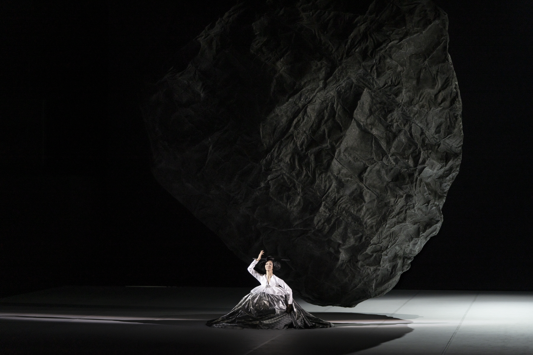 국립무용단, 〈산조〉 1막, 드레스 리허설 장면[사진 제공=국립무용단](이하 상동). 〈산조〉의 시작은 무대 전면에 달린 지름 6m의 대형 바위 구조물과 한 명의 무용수의 대칭 구도로 시작된다. 어둑한 위쪽 부분에서 조금씩 밝아진 거대한 인공 바위의 질감은 그것이 결코 실제가 아니라는 것을 알려주는 동시에 결코 무겁지 않을, 텅 빈 물질의 이미지임에도 그 부피에 대한 거대한 체감으로써 실제 흔들리는 움직임의 자장을 은폐하고 있는 것으로도 보인다. 동시에 표면적으로는 촉지적인 감각으로 움직임의 흐름을 담지하며, 무용수의 부푼 치마는 이 바위에 대한 메타포이거나, 또는 그 바위에 대응하는 확장된 부피로 자리한다.