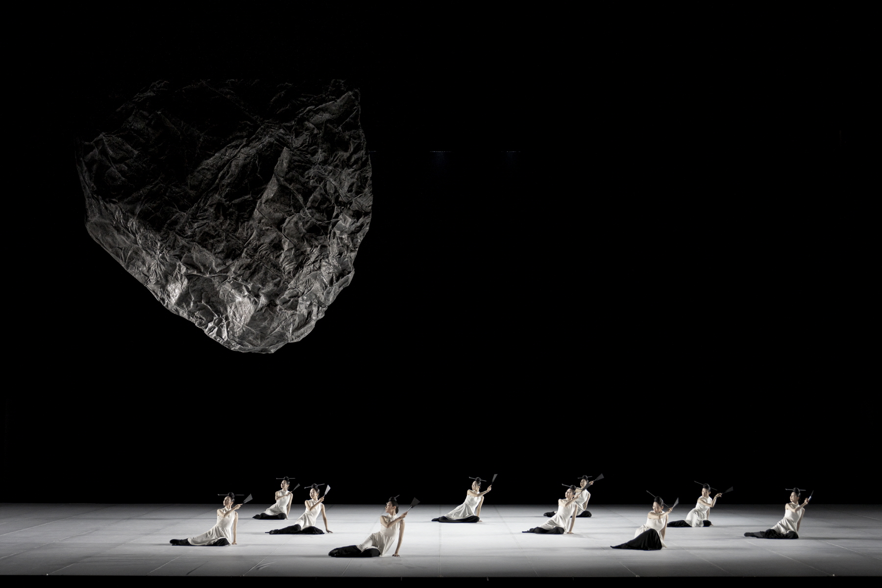 어쩌면 가장 집약적이고 온전한 방식으로 주제를 함축하는 막은 1막의 첫 부분이다. 여기서 물론 주제는 산조의 복잡도에 대한 제어와 조화로의 과정이 아닌, 이미지로서의 움직임이 갖는 힘이다. 그것은 가장 정제된 미학의 틀이다. 상대적으로 점점 무질서를 향하는 음악에 비해, 1막은 적막을 깬 장구와 거문고가 명징하게 들린다는 점에서 몰입을 강화한다. 한 명에서 군무로 확장되는 무대에서는 오히려 한 명의 존재감이 거대한 돌을 마주하며 상대하는 인상을 주는 것에서 벗어나서 온전히 거대한 질서에 순응된 방식의 몸짓을 보여주게 된다는 점에서 팽팽한 힘의 긴장은 해소되고 따라서 1막의 첫 번째 장면은 가장 압축적으로 힘을 상대하고 체현한다.