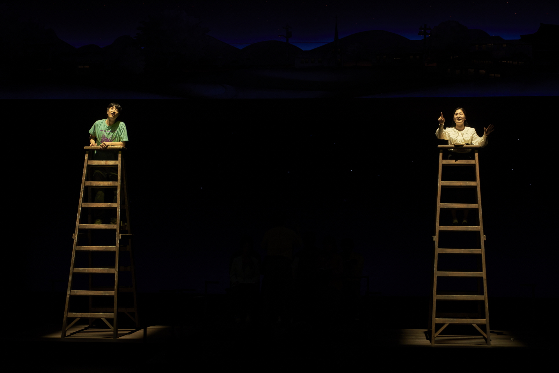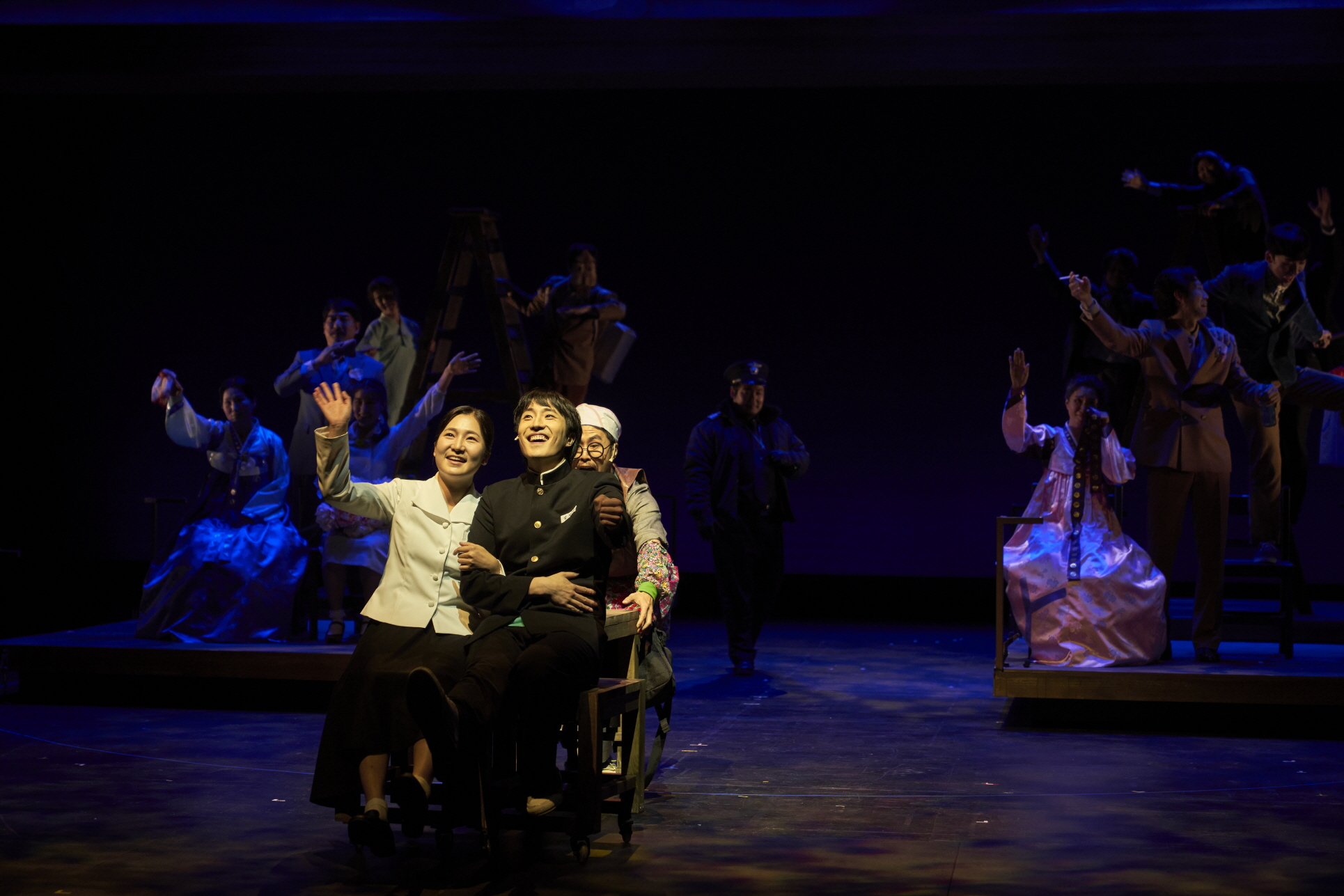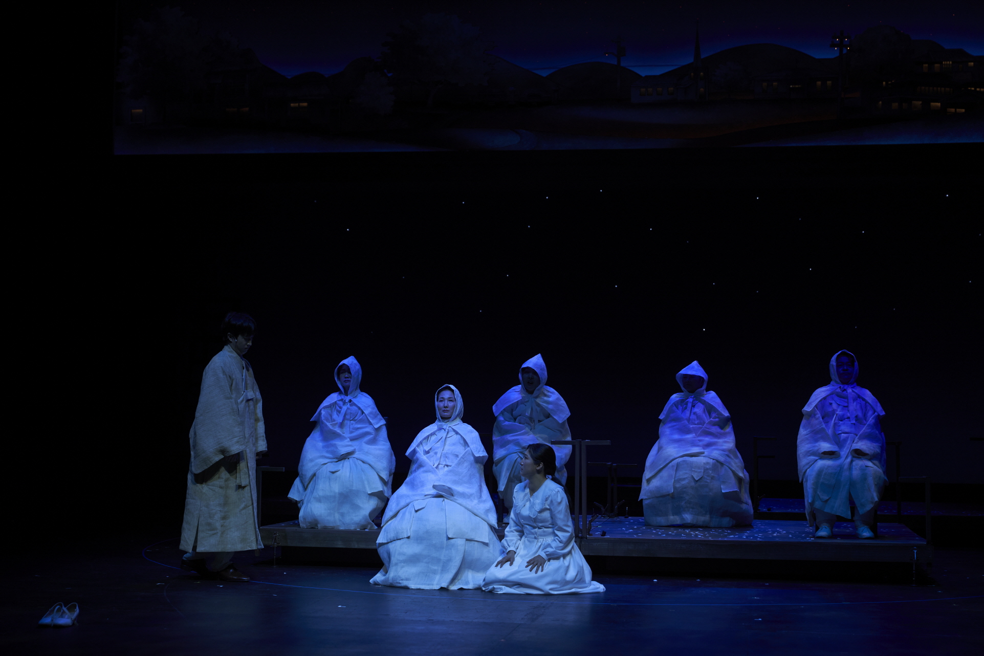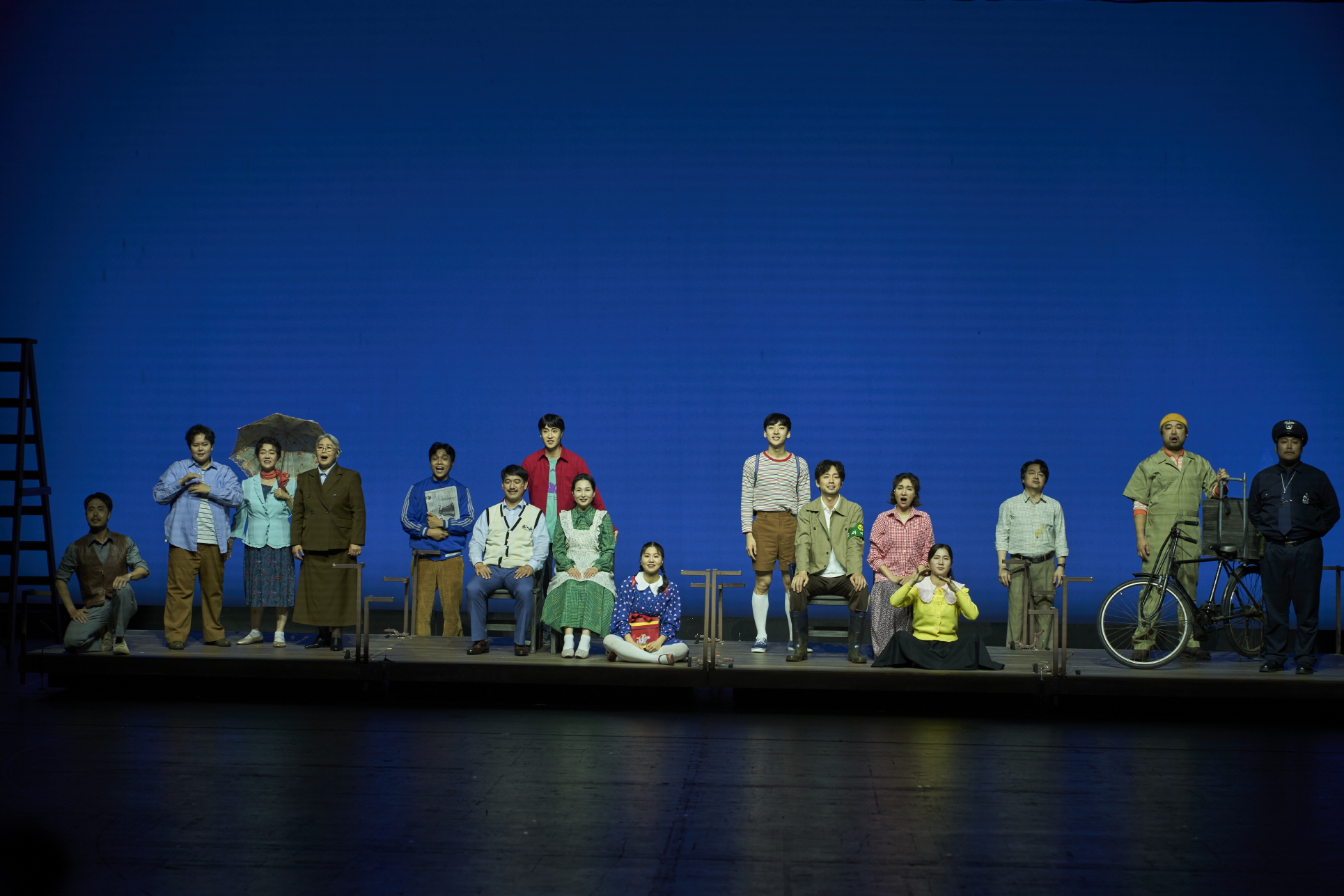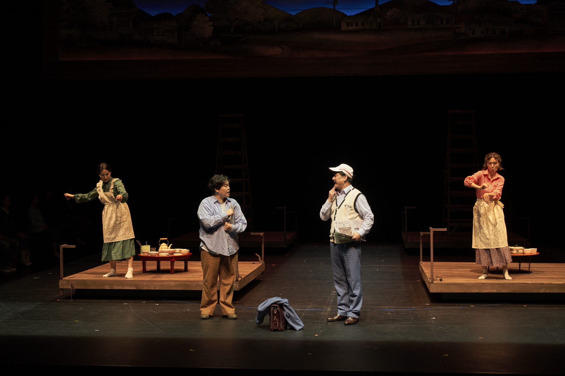 국립극장,〈우리 읍내〉 프레스콜 컷[사진 제공=국립극장](이하 상동). 〈우리 읍내〉는 원작, 손턴 와일더의 희곡 「아워 타운(Our Town)」의 1900년대 미국 뉴햄프셔주를 배경을 1980년대의 대한민국 경상북도 울진군 평해로 설정하는데, 이는 가장 비슷한 인구수를 가진 지역이라고 한다. ‘자동-결정’에 따른 이러한 설정은 표면적으로는 원작에 대한 엄밀한 고증의 명목을 띰에도 실은 원작이 가진 문화적 특성을 보여주는 것도 아니며 국내 현실에 대한 합목적적 유인 역시 있는 것은 아니라는 점에서 나이브하다. 게다가 1980년대의 현실은 오늘날의 현실과는 꽤나 거리가 있어 보인다. 여기에는 시대에 대한 재현의 과제뿐만 아니라, 재현이 향하는 이념의 새로움이 요구된다.
