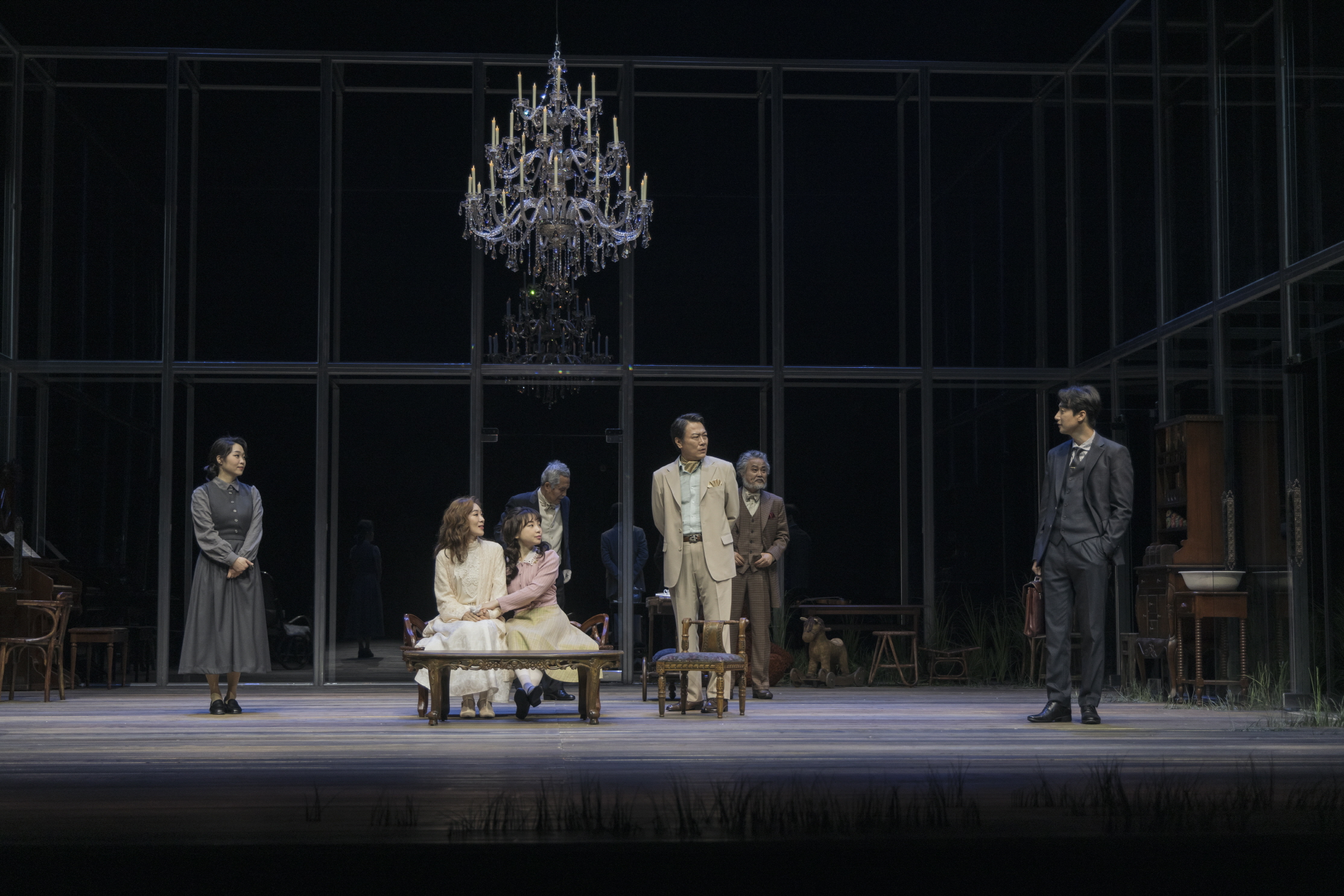 국립극단(김광보 연출), 〈벚꽃 동산〉 공연 사진[사진 제공=국립극단](이하 상동). (사진 왼쪽부터) 바랴 역 정슬기, 라네프스카야 류보비 안드레예브나 역 백지원, 피르스 역 박상종, 아냐 역 이다혜, 가예프 레오니드 안드레예비치 역 강신구, 시메오노프 피시치크 보리스 보리소비치 역 곽은태, 로파힌 예르몰라이 알렉세예비치 역 이승주 배우.