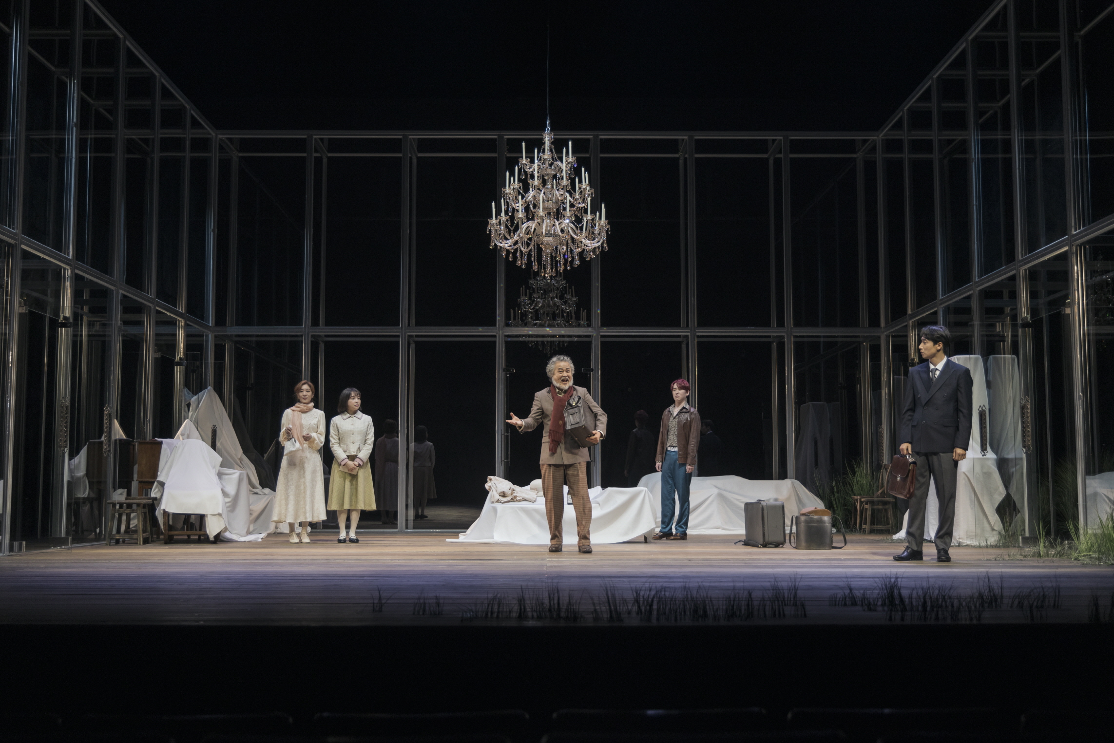 (사진 왼쪽부터) 라네프스카야 류보비 안드레예브나 역 백지원, 아냐 역 이다혜, 시메오노프 피시치크 보리스 보리소비치 역 곽은태, 야샤 역 장석환, .로파힌 예르몰라이 알렉세예비치 역 이승주 배우. 무슨 말인지 알 수 없이 웅얼거리는 하인 피르스(박상종 배우)의 등장 역시 그러하다. 그의 언어는 견고하게 인지의 틀을 비켜난다. 〈벚꽃 동산〉에는 라네프스카야를 필두로 벚꽃 동산을 떠나는 사람들과 경매를 통해 새로 벚꽃 동산의 주인이 됐지만 한동안 이곳을 떠나는 로파힌 일행까지 빈 집에 그가 혼자 남아 쓸쓸이 죽음을 맞이한다. 과거의 완전한 종식의 주인은 벚꽃 동산의 주인도 자본 시스템을 통해 이를 쟁취한 자 역시 아니다. 결국 아무것도 없다는 그의 말은 벚꽃이 지는 삶의 유한함에 대한 메시지로, 무대에 벚꽃이 떨어지는 것과 함께 서서히 사라지며 녹아내리는 듯한 그의 육신은 벚꽃 오브제 자체를 체현한다.