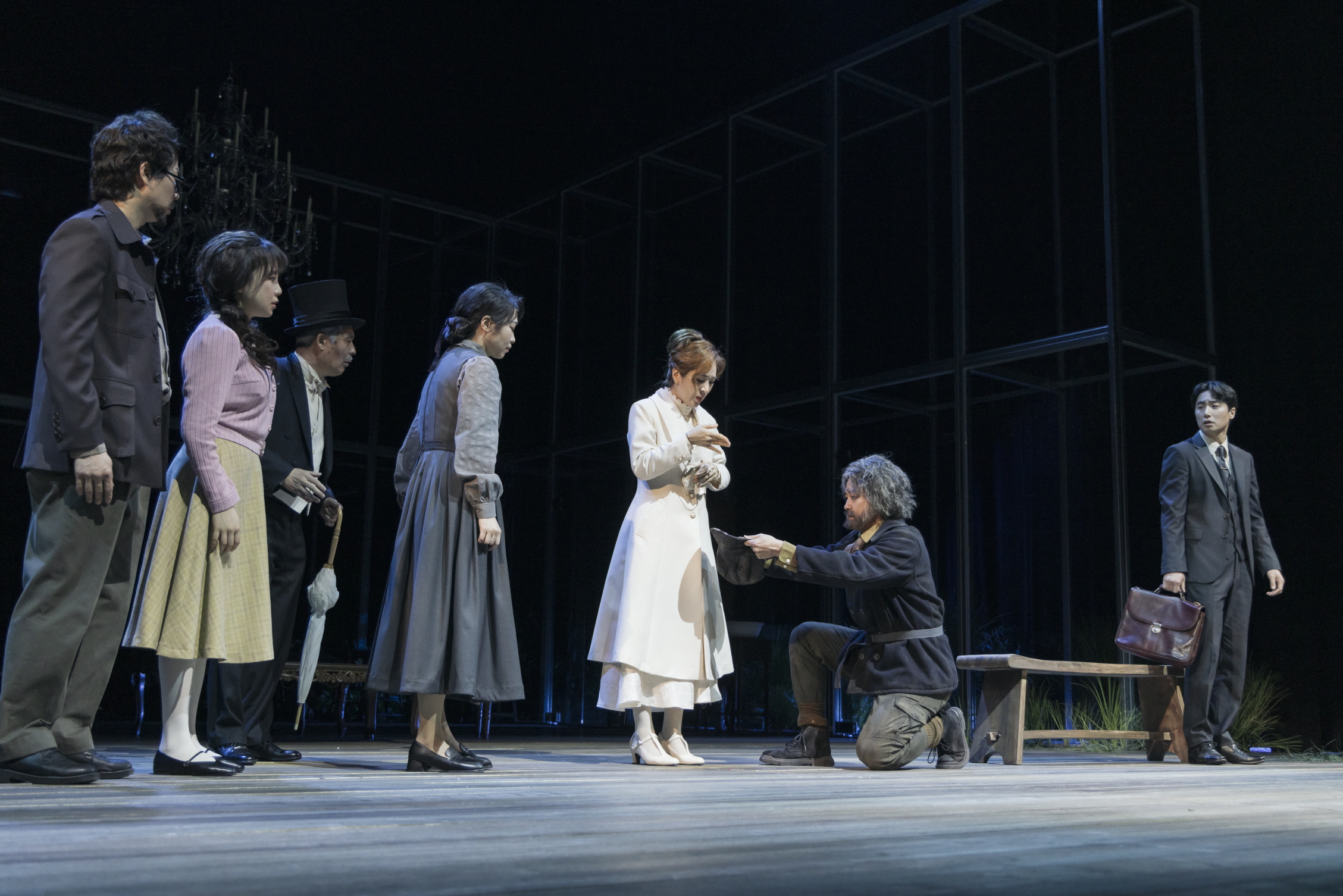 (사진 왼쪽부터) 트로피모프 표트르 세르게예비치 역 윤성원, 아냐 역 이다혜, 피르스 역 박상종, 바랴 역 정슬기, 라네프스카야 류보비 안드레예브나 역 백지원, 부랑인 역 박진호, 로파힌 예르몰라이 알렉세예비치 역 이승주 배우. 벚꽃 동산의 지주인 라네프스카야(백지원 배우)는 몰락한 귀족으로서 무대를 스치듯 지나간다. 그는 좀처럼 이 공간을 차지하지 않는다. 특히 부량인(박진호 배우)이 혁명을 이야기할 때, 과거의 영광에 사로잡혀 현재를 제대로 바라보지도 받아들이지 못하는 인물의 모습이다. 여기서 그는 마치 표피적으로 ‘시찰’하고 자리를 뜨는 관료처럼 보이는데, 우선 둘의 대비는 신분의 차이를 극명하게 드러내는 한편, 주인공인 라네프스카야에 비해 매우 짧은 등장임에도 부량인은 둘의 관계를 전복할 만큼 강렬한 인상을 남긴다.