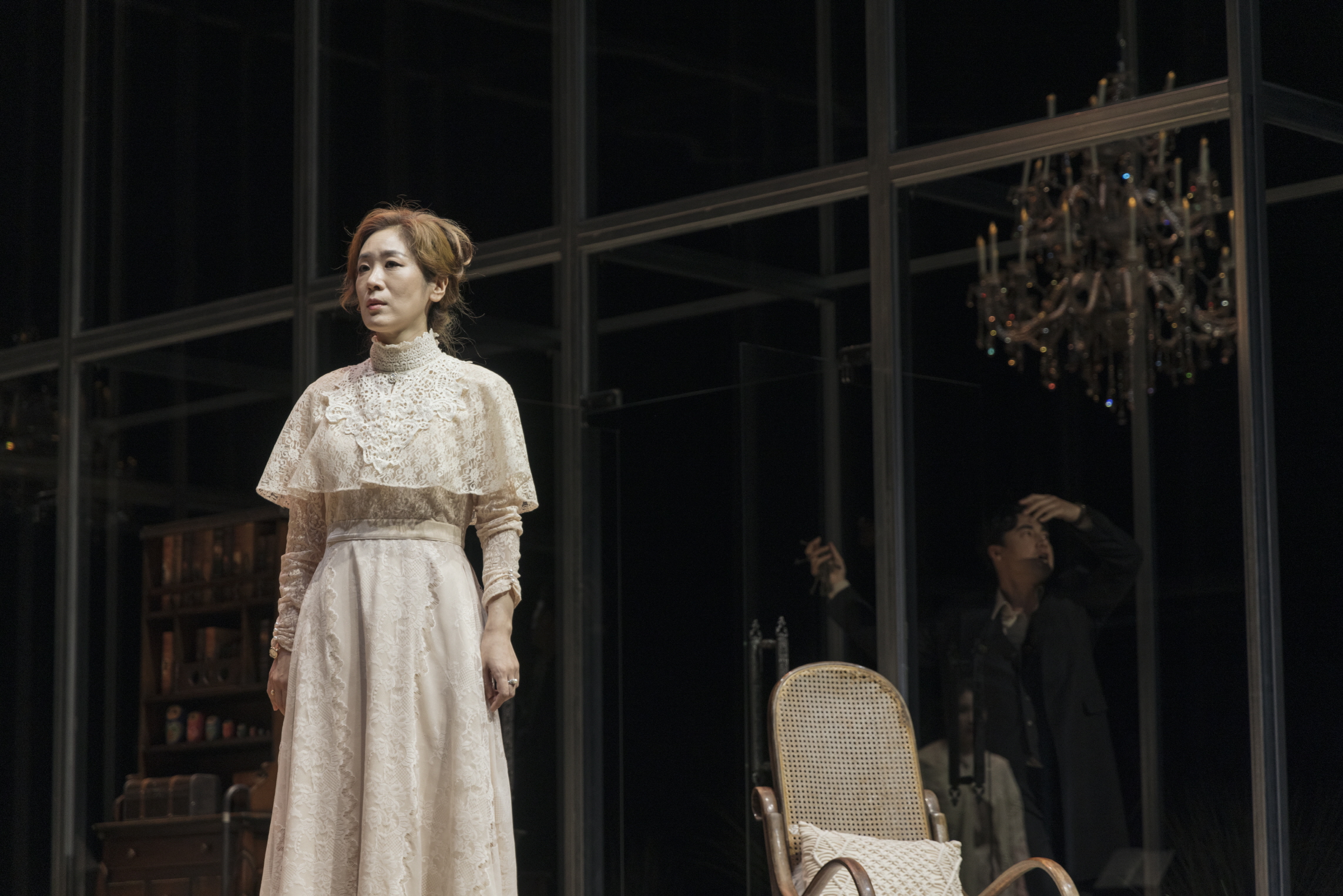 어렸을 적 라네프스카야의 방이 중앙 무대를 이루는 가운데, 이를 둘러싼 무대 안쪽의 정면과 양 옆면으로 이어지는 3면의 유리 구조물은, 진공으로 지난 기억을 현실로부터 방어한다. 동시에 현실의 환기 역시 가로막는다. 라네프스카야의 어린 아들이 자라다 죽었고 자신이 어린 시절 있었던 이 공간에서, 그 바깥의 뼈대는 그 안의 인물들을 유폐시키지만, 무대로서는 증폭된 음향과 집중을 창출한다―반면, 통로 공간은 소리의 굴절과 감축의 양상을 빚는다. 집이 경매에 들어간 상황에서 무대 정면의 커튼 뒤에 있는 뒤쪽 공간에서 무도회를 즐기는 사람들의 실루엣이 비친다.