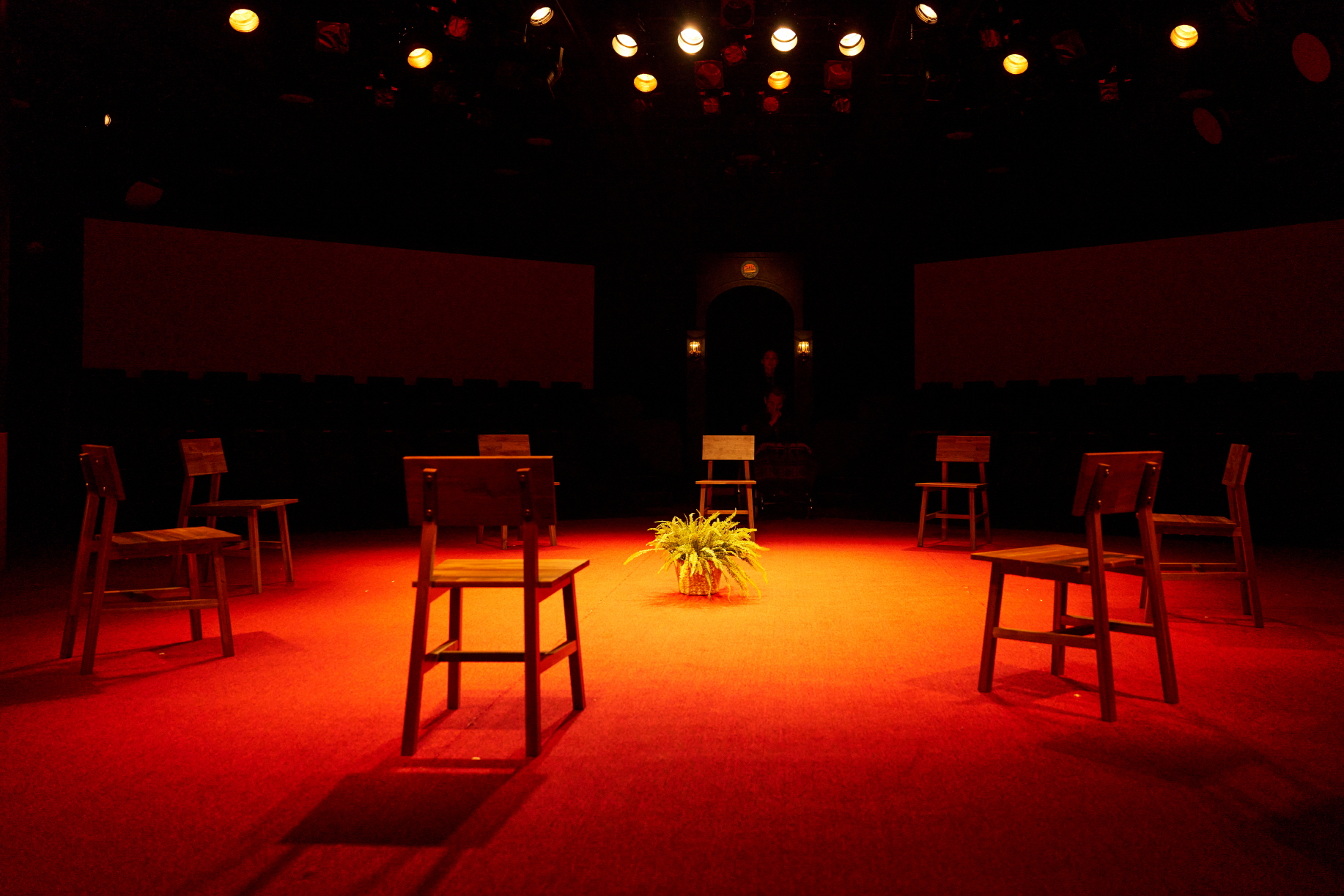 4면으로 둘러싼 무대와 이를 객석으로 연장한 극장에서 관객은 안의 무대가 바깥으로 새어나오는 또는 예기치 않게 그 속의 배우들과 마주치는 경험을 하게 된다. 반면, 음악은 바깥에서 안을 향한다. 스크린은 바깥의 경계선상에 자리한다. 음악이 사실 밈의 문화사를 환기하기 위한 정보값으로 주로 존재한다면, 영상 이미지는 독자적인 이미지 기호보다는 순전히 텍스트의 컨텍스트를 환기하기 위한 배경 차원으로 보인다.