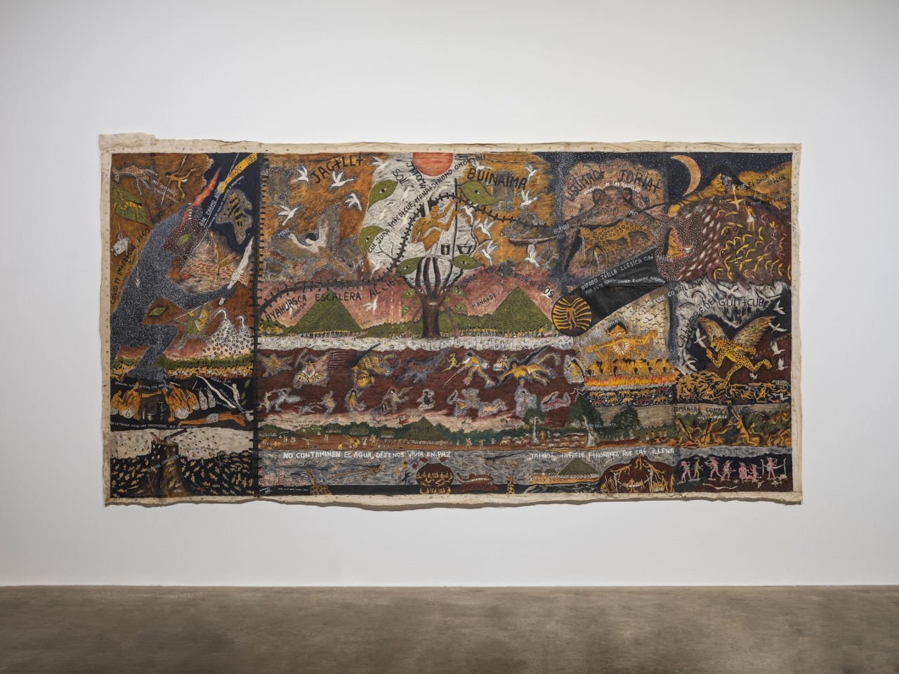 앙헬리카 세레(Angélica Serech)의 〈내 두 번째 피부에 말의 씨앗을 뿌리다〉(2023, 페달 직기, 수직 직기, 나무 바늘 자수, 250×700cm.)는 “과테말라 산후안 코말라파의 칵치켈 민족 선조들의 전통 직조 기법”을 활용하며, 긴 하나의 레이어로 구성돼 있고, 그 안에 비선형적인 구조들, 겹겹이 맺히고 비정형적으로 연결되는 이미지로 압축돼 있다. 전시장 벽 바깥쪽에서 볼 때 순간적인 빛과 그 밑에 드리우는 그림자 무늬들 역시 인상적이다.