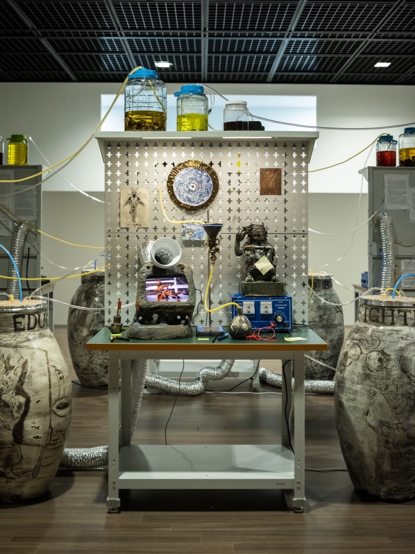 캔디스 린(Candice Lin)의 〈리튬 공장의 섹스 악마들〉(2023. 관리자 플랫폼, 도자기, 목재, 금속 작업대, 연구, 실험실 스탠드, 애니메이션, 사운드, 전자 제품, 해킹된 교반기, 사무용품, 알루미늄 및 플라스틱 덕트 및 튜브, 양각 동판, 자석, 그림, 인쇄 종이, 유리, 플라스틱, 액체, 판, 가변크기.)ⓒ글림워커스[사진 제공=광주비엔날레] 아무래도 가장 재미있는 작업은 주제관이 아닌, 국립광주박물관 기획전시실에서 열린, 캔디스 린(Candice Lin)의 〈리튬 공장의 섹스 악마들〉(2023. 관리자 플랫폼, 도자기, 목재, 금속 작업대, 연구, 실험실 스탠드, 애니메이션, 사운드, 전자 제품, 해킹된 교반기, 사무용품, 알루미늄 및 플라스틱 덕트 및 튜브, 양각 동판, 자석, 그림, 인쇄 종이, 유리, 플라스틱, 액체, 판, 가변크기.)로, 여기서 사물과 인간은 네트워크 차원에서 세계의 일부로서 접속되어 있다는 공통점을 갖고 있다. 사물과 인간은 신화적 서사 차원에서 또한 만난다. 곧 인간 너머의 서사는 사물의 지위를 복권하며 종래의 인간의 (인간 너머의) 서사가 지닌 계층성, 또는 그것의 구태의연함을 가로지른다. 쓰인 재료는 매우 다양하며, 3D 모델링과 애니메이션, 도자 항아리 제작은 협업의 결과이다. 기본적으로 여섯 개의 금속 작업대에 놓인 사물들은 도자 외에도 전자 제품, 동판, 그림, 인쇄 종이 등 다양한 매체와 재료로 구성되며 공산품을 포함한다.