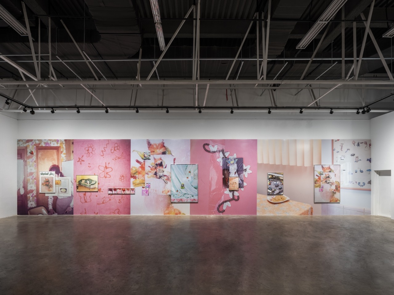 파라 알 카시미(Farah Al Qasimi)의 〈특별한 날들을 위한 편지〉(2023. 시트지에 라텍스 출력, 367×1660cm., 2021. 아카이벌 잉크젯 프린트, 작가 제작 알루미늄 액자 에디션 1/5, 2 AP, 101.6×73.7cm.)ⓒ글림워커스[사진 제공=광주비엔날레] 파라 알 카시미(Farah Al Qasimi)의 〈특별한 날들을 위한 편지〉(2023. 시트지에 라텍스 출력, 367×1660cm., 2021. 아카이벌 잉크젯 프린트, 작가 제작 알루미늄 액자 에디션 1/5, 2 AP, 101.6×73.7cm.)는 사진 이미지의 물리적, 매체적 확장을 통한 공간 설치―“커다란 벽지 이미지 위에 표구한 사진이나 납작한 모니터”―가 인상적인데, 이는 작품과 관람객을 사진 이미지의 확장된 주거 공간으로 연장하기 때문이다. 2021년 초 “서구로의 이주 기록을 담은 오래된 가족 앨범을 참조해 자신이 가족과 함께 사는 집의 실내 공간과 주변”을 담은 사진은 “꽃무늬 식탁보와 옷, 벽지, 실내장식 등”에 주목하는데, 이러한 “사적 아카이브”가 지닌 자국 문화의 무의식적 지층이 갖는 유형학적인 부분은 사적이지만은 않다.