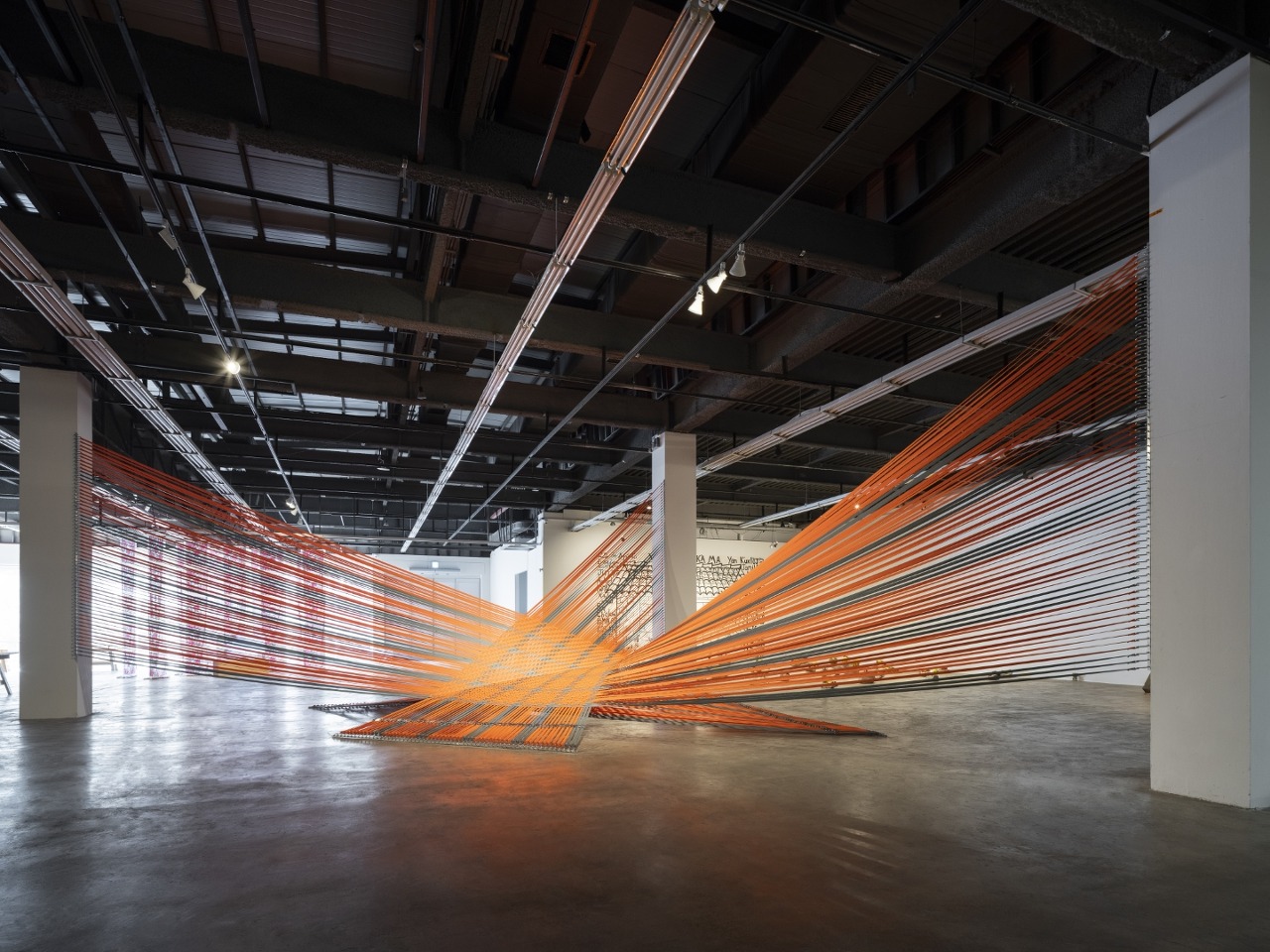 마타아호 컬렉티브(Mataaho Collective)의 〈투아키리키리(Tuakirikiri)〉(2023. 폴리에스테르 직조, 가변설치.)ⓒ글림워커스[사진 제공=광주비엔날레] 마타아호 컬렉티브(Mataaho Collective)의 〈투아키리키리(Tuakirikiri)〉(2023. 폴리에스테르 직조, 가변설치.) 역시 지역 전통에서 착안하며, 신화적 상징과 전통 직조 기술을 활용하지만, 재료의 요소는 화물 고정끈이라는 현대적인 요소를 가져온다. 팀명에서 ‘마타아호’는 “특정한 대상에 초점을 맞추거나 주목하는 뷰파인더”를 뜻하는데, 이는 리서치나 연구로부터 작업이 시작됨을 전제한다. “마오리 사회에서 아기나 식료품, 자원 등을 운반할 때 사용되는 ‘카웨’“라는 전통의 원형은 X축으로 교차된 힘의 배분을 통해 역동적이고 뒤틀린 힘의 자장을 드러낸다.
