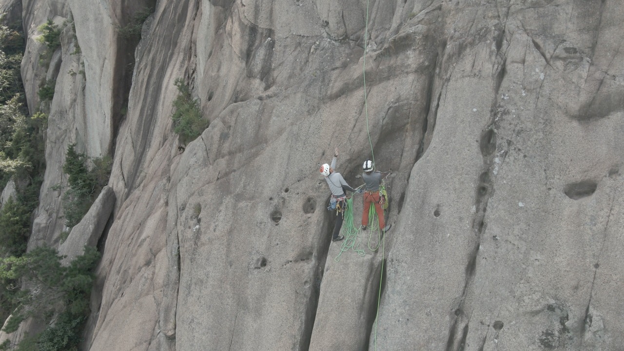 홍이현숙의 〈지금 당신이 만지는 것 - 월출산 시루봉〉(2023. 단채널 영상, 컬러, 사운드, 7분 34초.)[이미지 제공=홍이현숙] 무각사 공간에 놓인, 홍이현숙의 〈지금 당신이 만지는 것〉(2023. 단채널 영상, 컬러, 사운드, 17분 48초.)은 북한산의 커다란 ‘마애여래좌상’을 카메라로 훑는데, 여기에 붙는 작가의 내레이션의 언어는 일견 그것의 ‘살아있는 느낌’을 전하는 데 초점이 맞춰져 있는 듯하지만, 묘사와 재현의 방식은 일종의 비평의 언어에 가까워진다. 카메라의 매개는 클로즈업과 이동을 통해 대상과의 거리를 극복하며 가이드의 언어와 대상을 일치시킨다. 반면 더듬어 가는 카메라의 촉지적 시각은 매끄러운 이동에 그치지 않고 자신을 드러낸다. 작가는 발가락 사이 홈이 수직으로 파인 것이나 아래 움푹 파인 것 같은 미소한 것들에 주목한다. 곧 “이보다 디테일할 수 없다.”라는 작가의 말을 자신에게 되돌려줄 수 있을 것이다. 〈지금 당신이 만지는 것 - 월출산 시루봉〉(2023. 단채널 영상, 컬러, 사운드, 7분 34초.)은 등산을 하는 모습을 거칠게 보여주는데, 신체에 대한 육감 어린 묘사와 “너의 손을 나에게 줘”와 같은 상대를 상정하는 말투로써 암벽을 오르는 자와 암벽의 어떤 초월적인 접촉의 상태를 종용한다. 곧 대상과 누군가의 무의식의 지층을 합성한다.