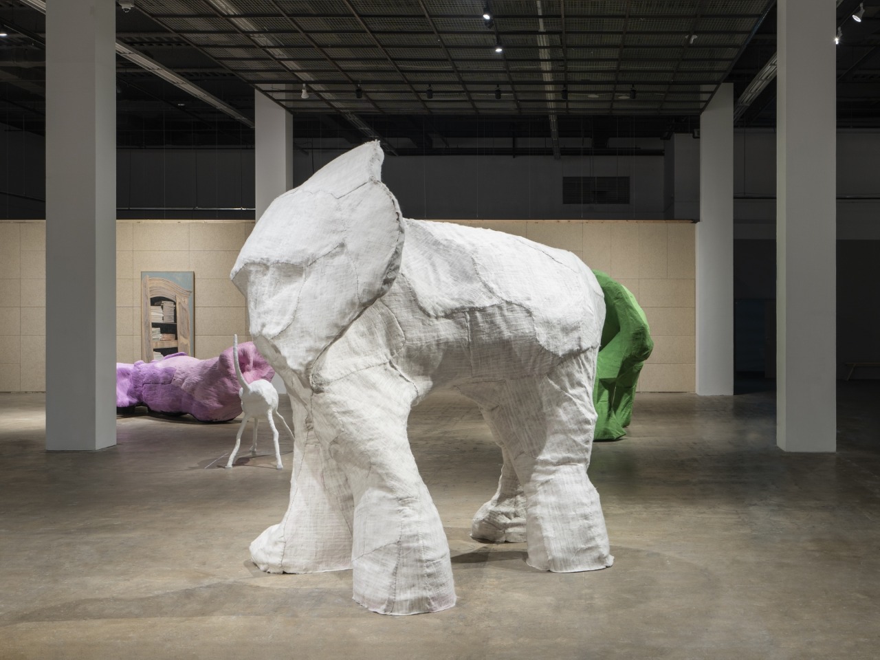 엄정순의 〈코 없는 코끼리〉(2023. 철판, 양모, 천, 300×274×307cm.)ⓒ글림워커스[사진 제공=광주비엔날레] 엄정순 작가는 “약 600여 년 전 인도네시아, 일본을 거쳐 한반도에 처음으로 들어온 코끼리가 전라도 끝 장도로 유배되는 수난의 여정을 따라가는 작업”에서, “그 경로선상의 도시에 사는 시각장애 학생들과 프로젝트를 진행”하면서, “시각장애 학생들이 청각과 촉각, 후각으로 느낀 코끼리를 표현한 조형물을 재해석하고 실제 코끼리의 크기로 대형화한 설치”인 〈코 없는 코끼리〉(2023. 철판, 양모, 천, 300×274×307cm.)를 비롯한 다양한 코끼리 작업들을 선보였다. “코가 사라진 코끼리 형상들”은 “기형과 원형 사이를 넘나드는 형태”로서, 타자의 체험에서 온 원형적 아이디어의 합성을 구현하는 과정―“철 파이프 골조 위에 수천 장의 철판 조각으로 조립한 뒤, 130개의 섬유 조각으로 외피를 감싸는 방식으로 완성”―과 실제 만져볼 수 있도록 한 전시의 결과까지 코끼리는 촉각적 대상이 되며, 작가의 이전과 이후의 세계의 연결이라는 키워드를 구성하며, 연속적인 역사의 토대를 만든다.