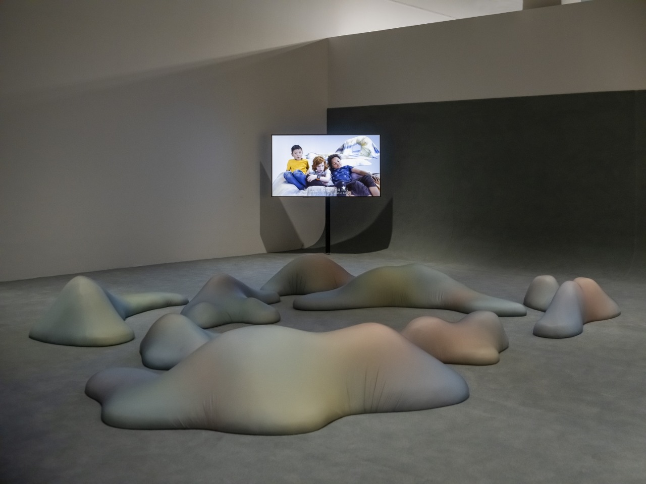 멜라니 보나조(melanie bonajo)의 〈터치미텔〉(2019. 단채널 영상 설치, 24분 27초.)의 경우, 바닥의 신체 지지대 기능을 하는 다양한 유선형의 오브제들을 통해 커다란 요철로서의 공간을 만들고 그와 연동해서 영상에서 그것을 활용한 지침을 수여한다. 이 작업은 “6~8세의 아이들 한 무리와 함께” “서로를 밀고 끌어안고 색칠하고 쓰다듬으면서” “자기 자신의 몸, 타인과의 신체적 접촉을 경험하는 방식을 살펴”본다. 가족 단위의 참여, 일종의 명상과 같은 과도한 몰입을 끌어내는 작업이다. 곧 〈터치미텔〉은 의식 너머의 감각, 언어 이전의 신체를 구성하는 하나의 이상이자 방법론이 된다.