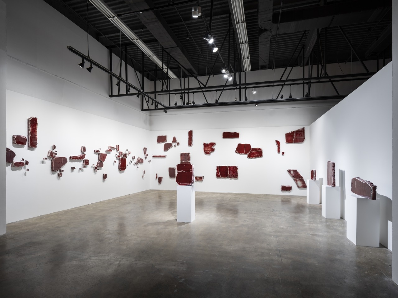 류젠화(Lou Jianhua)의 〈흔적의 형태〉(2016-2022. 자기, 가변크기.)ⓒ글림워커스[사진 제공=광주비엔날레] 류젠화(Lou Jianhua)의 〈흔적의 형태〉(2016-2022. 자기, 가변크기.)는 ‘전 세계의 박물관 소장품에서 영감을 얻었으며’ 유물의 흔적처럼 파편으로서의 도자 작업들로 구성된다. 이는 매끄럽고 광이 나는 표면과 거친 옆면의 결을 대조적으로 보여주며, 그 경계에서의 윤곽선을 뚜렷하게 보여주며, 파편으로서의 유동적인 형상을 매끈한 드로잉의 미감으로 마감한다.