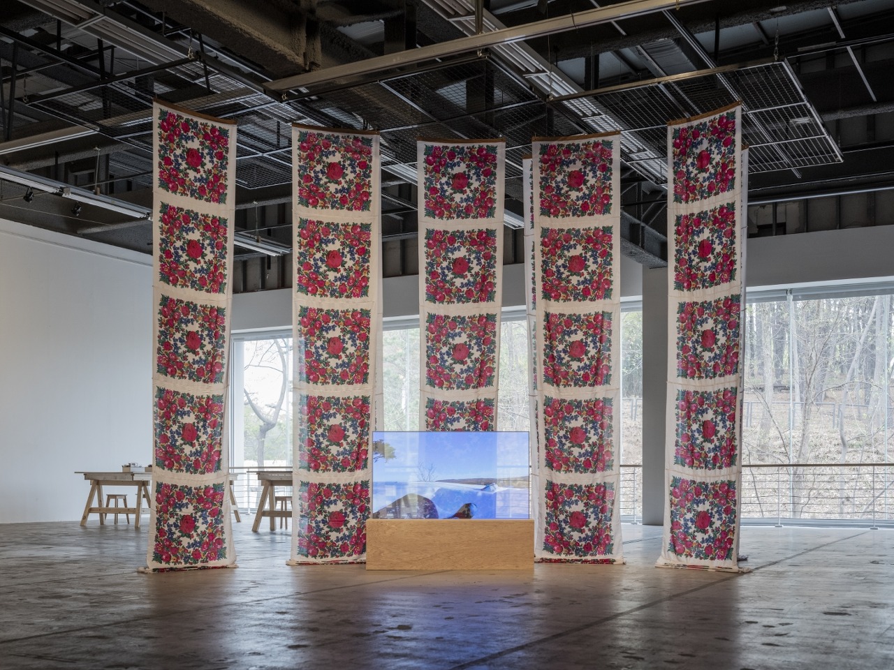 타냐 루킨 링클레이터(Tanya Lukin Linklater)의 〈겨울을 느끼다, 차가 숨가 목구멍을 대울 때〉(2023. 영상 설치 및 스카프와 돌, 가변크기.)ⓒ글림워커스[사진 제공=광주비엔날레] 그런 차원에서 타냐 루킨 링클레이터(Tanya Lukin Linklater)의 〈겨울을 느끼다, 차가 숨가 목구멍을 대울 때〉(2023. 영상 설치 및 스카프와 돌, 가변크기.)의 경우, 전통과 현재의 거리를 퍼포먼스로 매개하는 중간적 작업이다. “코디액군도의 아포낙과 포트 라이언스에 위치한 선주민 마을의 알루틱족 출신”의 작가가 “주민들의 생활 경험, 소속 체계, 지식 전수에 영향을 준 역사”를 “북아메리카 선주민 여성들이 착용하는 코콤 스카프”의 설치로 이전하며, 그 앞에서 제목과 같이 눈밭에서 행위를 하는 작가의 퍼포먼스를 영상으로 상영하는데, 이러한 기이한 병치는 화려하지만 어떤 기성품의 이미지가 단지 하나의 이미지에 그치거나 비판받지 않기 위한 몸부림쯤으로 보이기도 한다. 사실상 그보다는 전시장 안에서 축소되는 퍼포먼스의 아이러니를 필사적으로 보여주는 작업처럼 보인다. 이 지점이 곧 ‘비엔날레’의 가능성과 한계일 것이다.