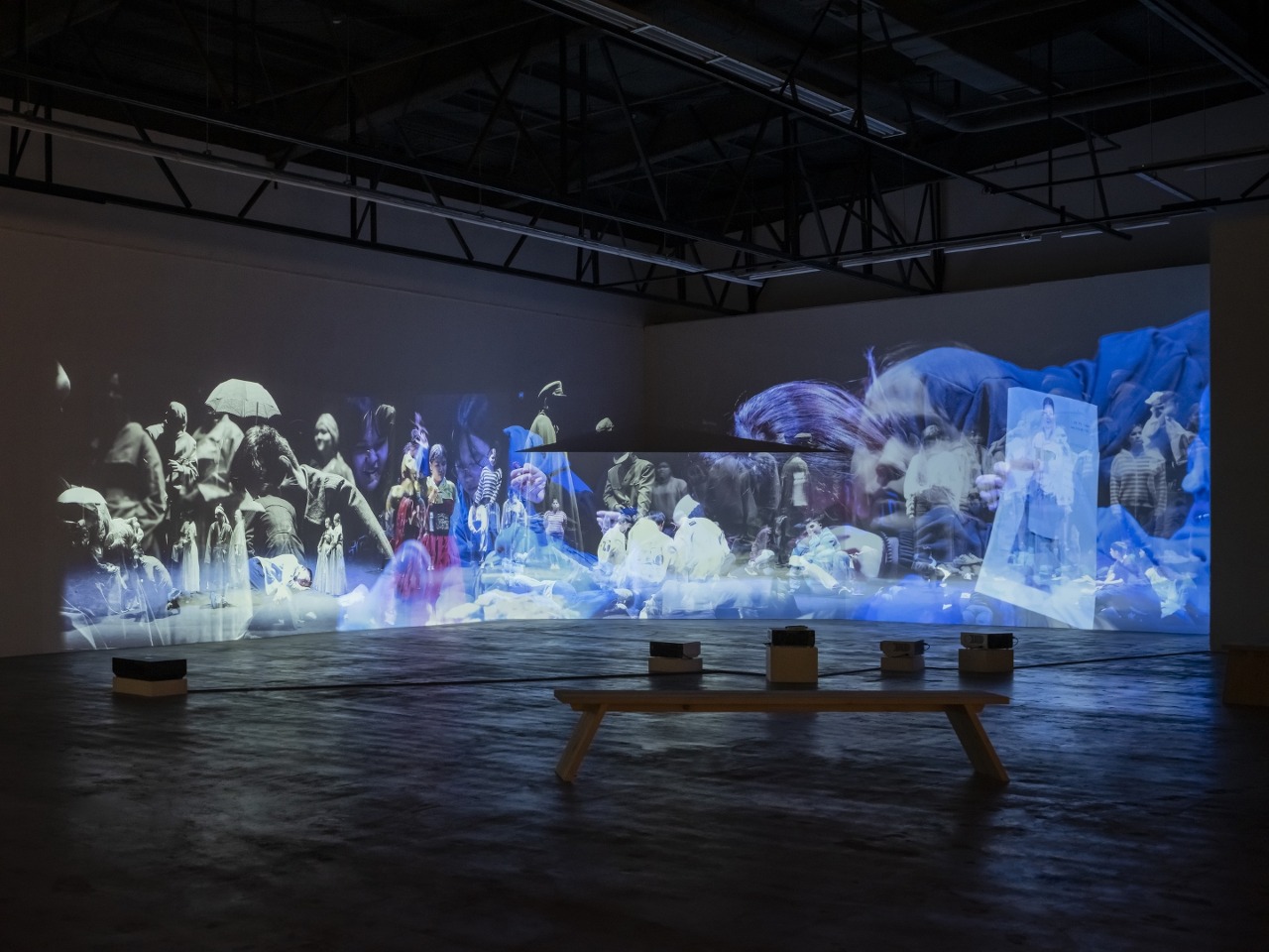고이즈미 메이로(Meiro Koizumi)의 〈삶의 극장〉(2023. 5채널 영상 설치, 가변크기.)ⓒ글림워커스[사진 제공=광주비엔날레] “일시적 주권”을 주제로 하는 제4 전시실은 탈식민주의나 식민주의 이전을 다룬다. 고이즈미 메이로(Meiro Koizumi)의 〈삶의 극장〉(2023. 5채널 영상 설치, 가변크기.)은 광주 고려인마을의 15명의 청소년들이, 작가가 주최한 이틀간의 워크숍을 통한 “1932년에 설립된 카자흐스탄의 고려극장”의 사진 기록물을 가지고 “의례와 역할 놀이”(니콜라이 예브레이노프)를 수행한 장면을 입체적으로 겹치게 편집한 영상 작업이다. 여기서 자신의 정체성을 확인하기보다 수행하며 변화시키는 과정은 뭉친 시각적 덩어리로 나타나는데, 시간과 존재의 양상은 민주주의적인 고른 분배의 형식을 따른 과도한 합산으로 흩어지고 사라지며 꽉 찬 유령적 스펙터클로 증발한다. 연기하는 순간의 표정 등을 포착한다면 진실이 거기 있지만, 이는 짧은 설명을 위해 최소한의 정보로 감축된 결과이다. 이것은 예상과 달리 전혀 연극적이지 않다.