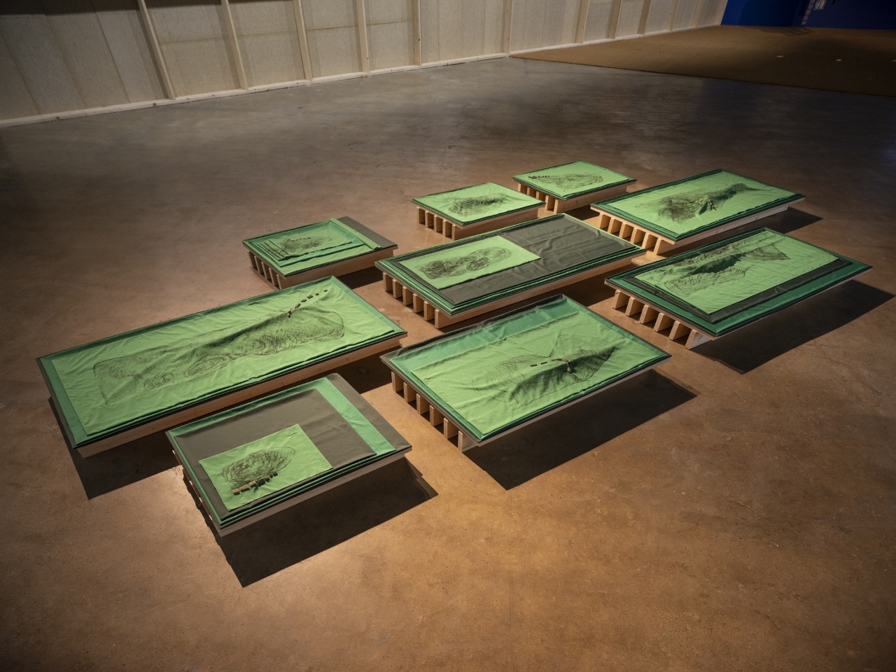 헤라 뷔욕타쉬즈얀(Hera Büyüktaşcıyan)의 〈속세에서 속삭이는 자들〉(2023. 천에 흑연과 융단, 가변설치.)ⓒ글림워커스[사진 제공=광주비엔날레] “신화와 건축물”의 “변화하는 양상”을 “관찰”해 나가는 헤라 뷔욕타쉬즈얀(Hera Büyüktaşcıyan)의 〈속세에서 속삭이는 자들〉(2023. 천에 흑연과 융단, 가변설치.)은, 평평하지 않은 초록색 융단 위에 흑연으로 그린 거시의 지형 위에 미시적인 건축의 모형을 배치한 작업이다. 이는 “콘월의 ‘아홉 처녀들’ 석상과 한국의 고인돌에서 영감을 받”은 작업으로, “켈트족의 전설”에서의 “안식일에, 노래를 했다는 이유로 석화”된 “아홉 처녀들”과 “제2차 세계대전 동안 군사기지와 민간 건물들을 가리기 위한 카모플라주를 숨죽여 만들었던 세이트아이브스의 크리세드 실크 방직공장 여성 노동자들”을 겹쳐 놓는다. 놀랍게도 권력의 압살에 사라진 존재들의 계보라는, 역사적 형상이 축소되며 뚜렷해진 조망의 재현은 바로 권력의 지점과 맞물리면서 신화의 애도를 현재로 계승한다. 일종의 지형을 수학적으로 옮겨놓는 부분은 나이자 칸(Nalza Khan)의 〈깊은 정복〉(2023. 잉크젯 프린트, 종이에 수채, 종이에 콘테 및 목탄, 가변크기.)의 작업에서도 찾아볼 수 있다. “대영제국의 일부러 카라치항에 건설되었던 댐과 운하 식민지의 역사를 다루”는 데 있어, ‘카라치항의 확장에 따른 생태계의 영향’을 “인도양의 이산화탄소 수치와 분포”라는 일종의 수학적 도표로 재현한다. 이러한 표현은 “종이 표면에 흐르고 맺히는 물감의 농도”로써 조율된다. 따라서 이러한 회화는 몇 번의 번역을 통해 미지의 형상을 향하고, 매개의 언어를 인지하기 전에는 파악할 수 없게 된다.