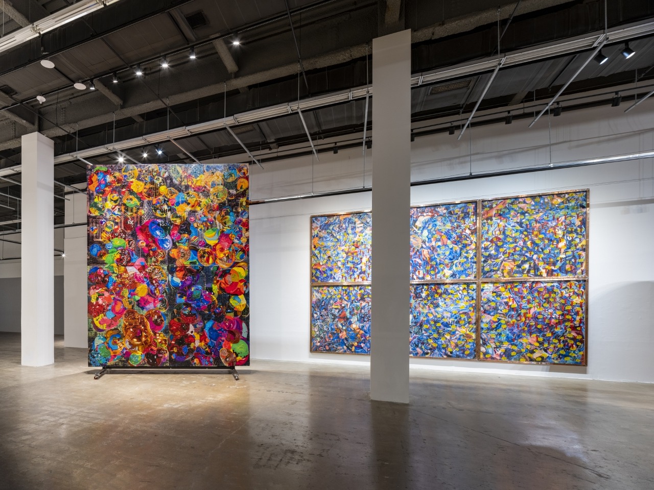 타스나이 세타세리(Thasnai Sethaseree)의 〈거품탑〉(2022. 승려복에 종이 콜라주 8점, 각 250×200cm., 2022. 종이에 오일파스텔, 구리 액자 6점, 각 200×200cm., 2022. 승려복에 종이 콜라주 4점, 각 지름 350cm, 넓이 175cm.)ⓒ글림워커스[사진 제공=광주비엔날레] 타스나이 세타세리(Thasnai Sethaseree)의 〈거품탑〉(2022. 승려복에 종이 콜라주 8점, 각 250×200cm., 2022. 종이에 오일파스텔, 구리 액자 6점, 각 200×200cm., 2022. 승려복에 종이 콜라주 4점, 각 지름 350cm, 넓이 175cm.)은 크기와 부피 차원에서 압도적인 느낌을 주는데, 보색 대비의 강렬한 색채감과 반복적으로 찍힌 또는 그려진 형태들의 강박적인 제스처는 거대한 회화 구조물을 과포화상태로 지지한다. 이는 자율적인 표현에 의한 배치보다는 의식적인 주술의 성격을 띠는 행위 자체에 방점이 찍히는 듯 보이지만, 자세히 보면, 이러한 패턴의 기호들 아래 현실의 이미지들이 중간 중간 눈에 띄는데, 이로써 이미지가 작동하는 세계 너머의 진실을 역사―가령 흑백으로 된 얼굴들―로 연장시킨다. 곧 작가는 “태국에서 권력과 부패가 국가와 상업적 상상에 뒤섞이는 방식에 관심을 갖”고, “냉전 이후 이미지가 정치적 사건과 맺는 관계를 탐구”하며, 권력이 작동하는 세계 속에 기록되어야 할 것들을 미약하게 새어나오게끔 배치한다.