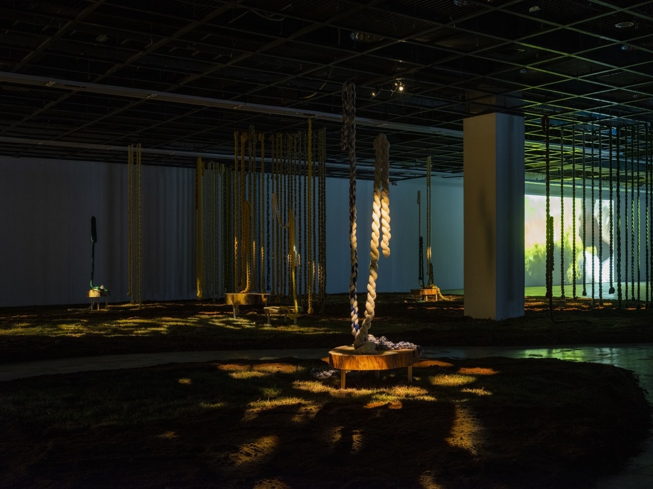 불레베즈웨 시와니(Buhlebezwe Slwanl)의 〈바침〉(2023. 양모실, 흙, 풀, 나무, 조명, 가변설치.)ⓒ글림워커스[사진 제공=광주비엔날레] 2022 부산비엔날레가 비좁고 결과적으로 불편한 환경 제공했다면, 2023 광주비엔날레는 어찌 됐건 공간이 작품과의 유격을 적절하게 또는 그 이상으로 확보한다―둘은 일 년의 간격을 두고 서로를 마주한다. 이는 큐레이팅의 차원보다는 어느 정도 아웃소싱된 설치의 영역에서 기인하는 것일 수도 있겠지만, 조금 더 흥미로운 건 그러한 전시 환경이 발전된 도시와 상대적으로 낙후된 도시 환경을 체현한다는 것이다. 부산비엔날레가 도시에 대한 은유, 그것도 무의식적인 차원이 응결된 것이라면, 광주비엔날레는 기조성된 광주비엔날레관 전시관이든 무각사와 같은 문화유산이든 갖춰진 하드웨어에 적절한 관람 환경의 동선을 확보했다.