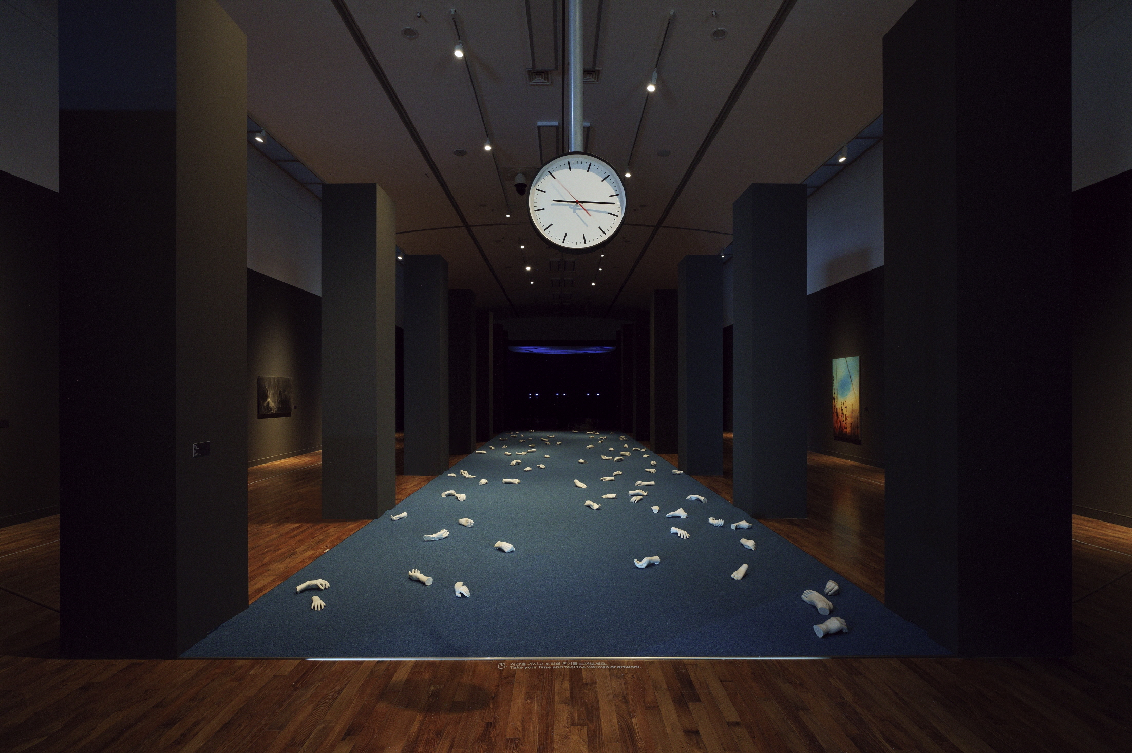 전시 《슬픈 나의 젊은 날》: 세계와 접면하는 현존재들REVIEW/Visual arts 2023. 8. 13. 15:13《슬픈 나의 젊은 날》은 부산 지역 출신의 작가 세 명이 참여한 전시로, 물론 부산이라는 지역의 언어와 직결되지는 않는다. 곧 다른 범주가 요청된다. 이를 묶는 건 큐레이팅의 언어(안대웅 학예연구사)이자 그것의 감각적이고 물리적인 설치로의 구현이다. 세 명의 작가에 맞춘 전시장은 “가속”, “에너지 흐름”, “인상”의 키워드와 함께 세 공간으로 구획되었고, 작가의 작업은 어느 정도 섞이며 조정환, 김덕희, 오민욱의 순으로 이어진다. 인상적인 건 핸드아웃을 대신하는 서문과 모든 개별 작품의 캡션과 설명을 담은 팸플릿이다. 그런 차원에서 어쩌면 《슬픈 나의 젊은 날》은 큐레이팅의 이념을 분명하게 언어화하고 그 주체를 투명하게 만들며 매개의 몫을 이전하지 않으려는 독특한 전시일 수 있다, 그것이 드물다고 생각되는 차원에서. 그럼에도 전시는 좀처럼 명확해지지 않는데, 세 명의 빽빽한 ‘맞세움’이 그것과의 거리 두기를 불가능하게 하는 부분도 있지만, 어떤 수렴의 접점을 찾기에는 세 작가의 작업이 연관되기보다는 더 이지러지기 때문이다. 곧 큐레이터는 세 작가에게서 공백을 가설하여 연결의 세계를 만드는 또 하나의 작가가 되었음에도 작품들에 대한 개별적인 종착점을 파악하는 것이 우선의 과제로 남게 된다. 이는 제목에서도 어느 정도 예상되는 부분인데, “슬픈 나의 젊은 날”이라는 제목은 배창호 감독의 청춘 영화 〈기쁜 우리 젊은 날〉의 패러디인 『슬픈 우리 젊은 날』이라는 1980년대 대학가에서 유행했던 낙서를 엮은 시집 제목을 전유한 것으로, 일종의 밈의 계보를 있는 것이기도 하다. 이 슬픔을 “우리”가 아닌 “나”가 느끼는 것으로 치환하는 가운데, 세 명의 작가가 대하는 세계로 초점이 옮겨 가게 된다.  《슬픈 나의 젊은 날》 전시 전경[사진 제공=부산시립미술관] 조정환 작가의 회화는 불길한 미래 세계와 그와 마주한 존재의 무의식에 대한 탐구를 보여준다. 첫 번째 공간에서 가장 먼저 들어오는 그의 네 개의 ‘레드얼럿’ 연작은, 주요하게 빨강과 노랑에서 시작된 보색 대비를 강렬하게 드러나는 작업이다. 아래로부터 시작되는 이 같은 불길의 내용은 가장 큰 작업에서는 위쪽으로 가며 붓질의 형식과 공존한다―〈레드얼럿〉(2021. 캔버스에 유채, 390.9×193.3cm.). 반면 붓질의 자유로움은 이 작업의 하단 이미지를 확대해서 그린 〈레드얼럿〉(2021. 캔버스에 유채, 80.3×80.3cm.)에서나 〈레드얼럿〉(2021. 캔버스에 유채, 130.3×193.3cm.)에서는 불길이라는 내용을 앞지르기에 이른다. 불길은 붓질로 치환되고, 추상화된 회화에 이른다. 이러한 특질은 어떤 기대감을 부르지만, 실은 전시에서 자율적인 질서의 회화로의 가능성을 보여주는 유일한 구간에 속하며―또 하나의 예외라면, 이케아 매장의 일화에서 착상된 〈IKEA Wave〉(2020. 캔버스에 유채, 112.1×145.5cm.)로, 반절을 덮는 바다에 들이닥친 쓰나미에 대한 재현으로서 노란색 붓질은 이상하게도 다분히 유희적이고 스타일적이다.―, 나머지는 디스토피아와 거기서 나타나는 존재에 대한 재현의 성격이 짙다. 곧 서사로서의 내용이 회화의 형식을 초과할 때 회화는 핍진해지는 듯 보인다. 그럼에도 “검은 기둥이 위태로운 모습, 화염이 불타고 파편이 낙하하는 모습을 연구한 결과”로서, 앞선 가장 작은 〈레드얼럿〉(2021. 캔버스에 유채, 80.3×80.3cm.)은 독특하게도 뒤이어 보여줄 고층 빌딩들과 그보다 크게 면적을 차지하는 불길한 하늘로 드리워진다. 곧 노랑과 빨강이 형태적으로 도시의 한 장면으로 분화되고 있다는 점에서 흥미롭다. 가령 〈Call It a Day〉(2022. 캔버스에 유채, 227.3×162.1cm.)의 화면을 과도하게 뒤덮은 “붉은색의 무거운 구름”과 “비석 같은 폐허”로서 “대규모 아파트 단지”의 절대적인 대비를 예기한다. 그리고 마지막 〈레드얼럿〉(2021. 캔버스에 유채, 80.3×100cm.)은 추상회화의 가능성 대신 구체적인 세계 구축을 또한 예비한다. 어둡고 불그스름한 하늘 아래 버스와 승용차 위의 두 사람이 대립하는 장면을 그리고 있다. 이 네 개의 ‘레드얼럿’은 수직의 방향성을 강조한 각목들의 직조로 된 구조물에 걸려 있다―김덕희의 〈누군가의 사각형〉(2021. 시멘트, 히터, 스피터(사운드 루프 재생), 20×4×21cm.)은 검붉은 ‘레드얼럿’ 속에서 그냥 지나치게 되거나 이상한 회화쯤으로 여겨지며 이후의 작업을 예고한다. 이러한 설치 방식은 회화를 어느 정도 일정한 신체 기준에 맞추지 않고 위태롭고 불편하게 회화를 보게 하는 대신에 집약적이고 포화된 상태로 회화들을 압축한다. 그리고 이러한 임시 가설이 은유하는 세계는 마침내 이 전시장을 한 바퀴 돌고 나서 마주하는, 역시 이 구조물에 붙은 오민욱 작가의 〈철길, 건축물, 부지, 화분〉(2017. FHD, 무음, 2분.)에 이르러 실제의 현장으로 체현되며 완성된다. 이는 공사작 가림막의 재현이 유동적이고 임시적이어서 ‘불완전한’, 폐허의 결말을 예기하는, 조정환의 상상력이 제목, 〈떠다니는 미래〉(2022. 캔버스에 유채, 72.7×50cm.)로 치환된 작업에