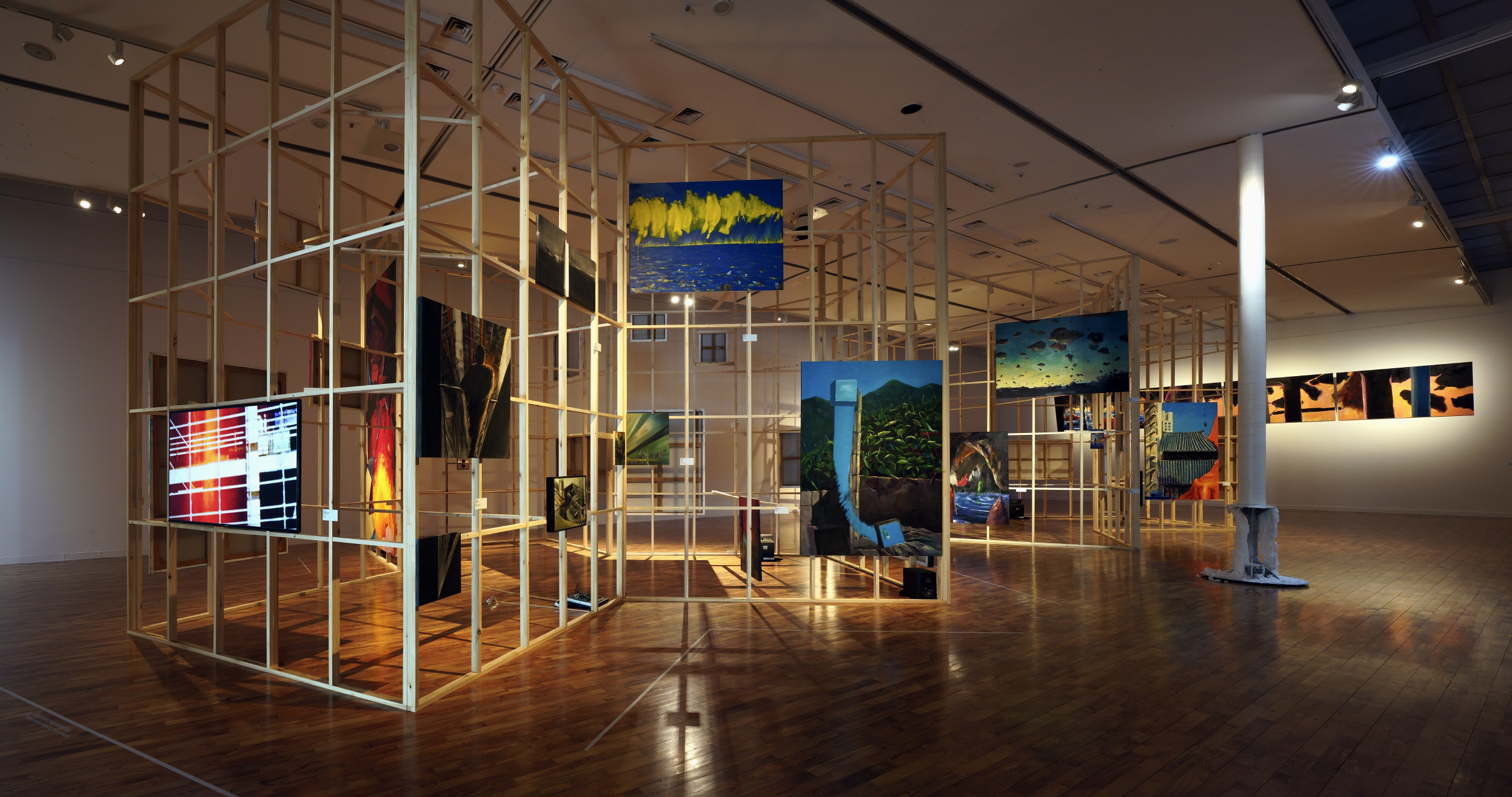 가령 〈Call It a Day〉(2022. 캔버스에 유채, 227.3×162.1cm.)의 화면을 과도하게 뒤덮은 “붉은색의 무거운 구름”과 “비석 같은 폐허”로서 “대규모 아파트 단지”의 절대적인 대비를 예기한다. 그리고 마지막 〈레드얼럿〉(2021. 캔버스에 유채, 80.3×100cm.)은 추상회화의 가능성 대신 구체적인 세계 구축을 또한 예비한다. 어둡고 불그스름한 하늘 아래 버스와 승용차 위의 두 사람이 대립하는 장면을 그리고 있다. 이 네 개의 ‘레드얼럿’은 수직의 방향성을 강조한 각목들의 직조로 된 구조물에 걸려 있다―김덕희의 〈누군가의 사각형〉(2021. 시멘트, 히터, 스피터(사운드 루프 재생), 20×4×21cm.)은 검붉은 ‘레드얼럿’ 속에서 그냥 지나치게 되거나 이상한 회화쯤으로 여겨지며 이후의 작업을 예고한다. 이러한 설치 방식은 회화를 어느 정도 일정한 신체 기준에 맞추지 않고 위태롭고 불편하게 회화를 보게 하는 대신에 집약적이고 포화된 상태로 회화들을 압축한다. 그리고 이러한 임시 가설이 은유하는 세계는 마침내 이 전시장을 한 바퀴 돌고 나서 마주하는, 역시 이 구조물에 붙은 오민욱 작가의 〈철길, 건축물, 부지, 화분〉(2017. FHD, 무음, 2분.)에 이르러 실제의 현장으로 체현되며 완성된다. 이는 공사작 가림막의 재현이 유동적이고 임시적이어서 ‘불완전한’, 폐허의 결말을 예기하는, 조정환의 상상력이 제목, 〈떠다니는 미래〉(2022. 캔버스에 유채, 72.7×50cm.)로 치환된 작업에서 역시 그렇다.