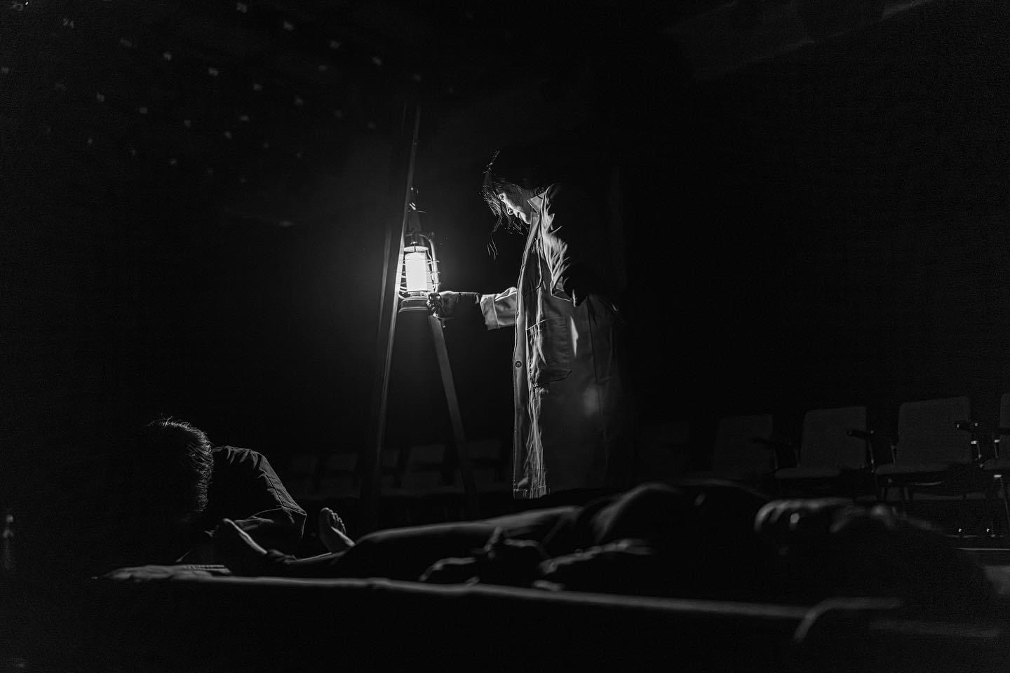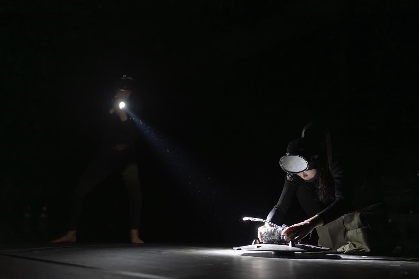 마이클 커비 작, 김우옥 연출, 〈혁명의 춤〉ⓒ최용석[사진 제공=더줌아트센터](이하 상동). 1장: 손전등과 파도 소리. 〈혁명의 춤〉은 혁명의 이념을 혁명의 이미지로 대체한다. 여기서 혁명의 이미지는 작품 전체의 이미지는 아니다. 짧은 대사들, “이쪽이야!”, “뭐지?”, “기다려!”, “들려?”, “그들 거야!”, “누가 오고 있어” 등, 위치를 지정하는 지시 대명사, 하나의 동사이거나 두세 개의 단어로 이뤄진 구문은, 상대방과의 관계를 맺으며, 각기 다른 여덟 개의 장면으로 반복된다. 이 여덟 개의 장면에서 엄밀히 혁명의 이미지를 수여하는 건 마지막 단계 직전에 이르러서이며, 그 전의 이미지들이 혁명을 위한 모종의 단계로 적용되는 것 역시 아니다.
