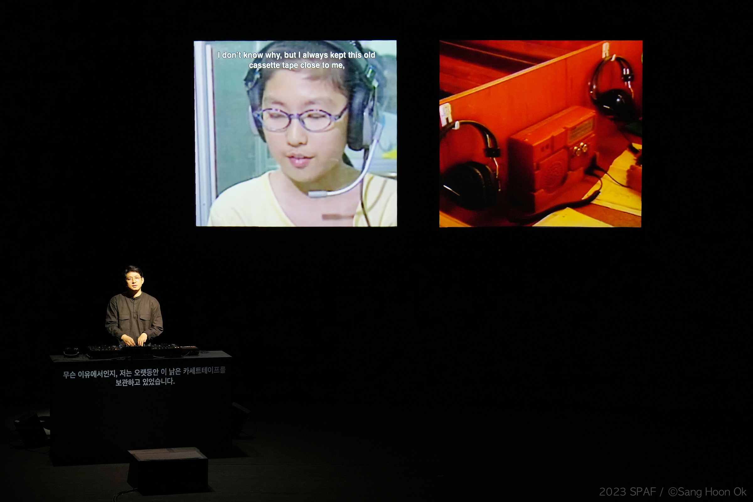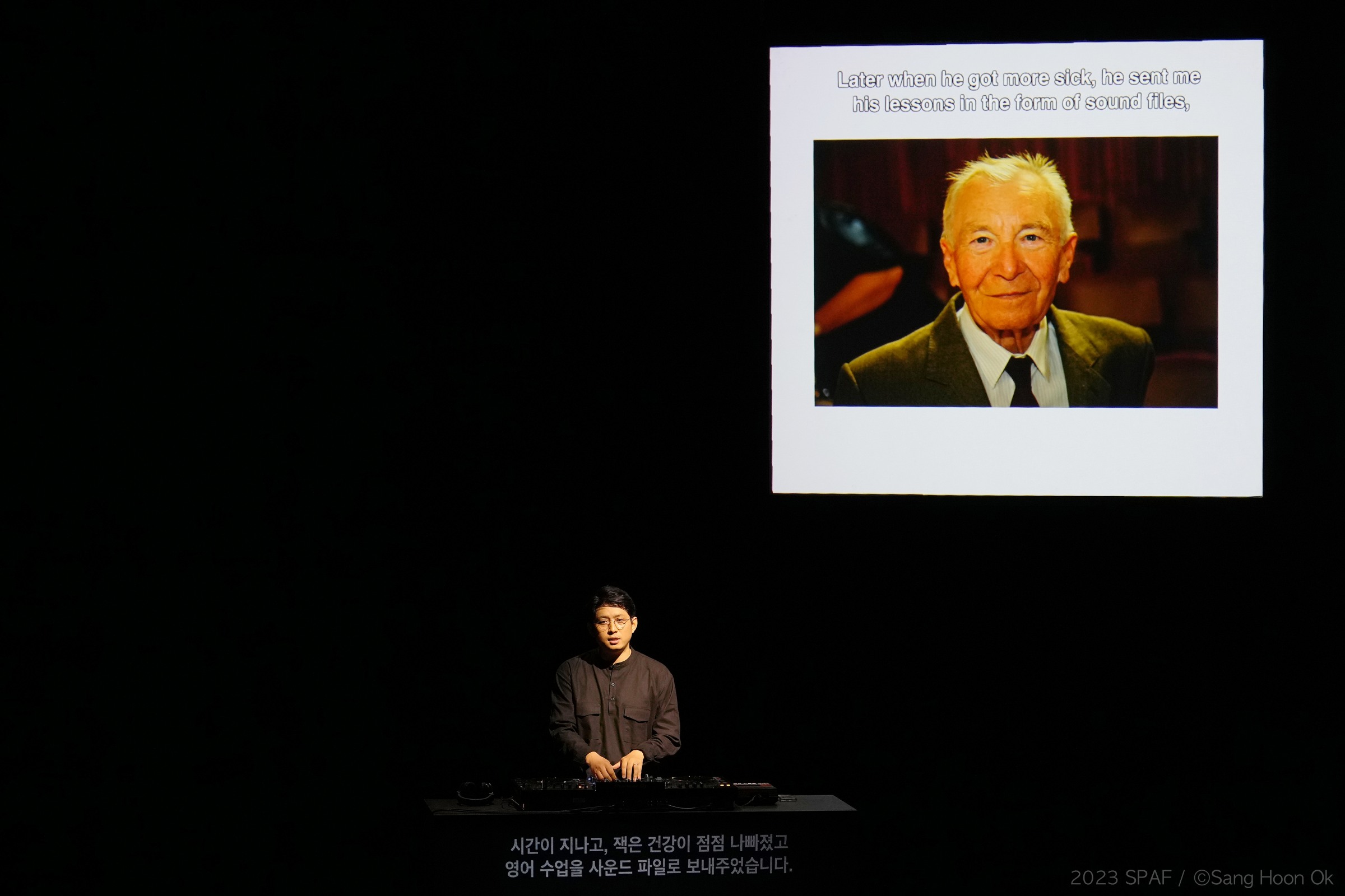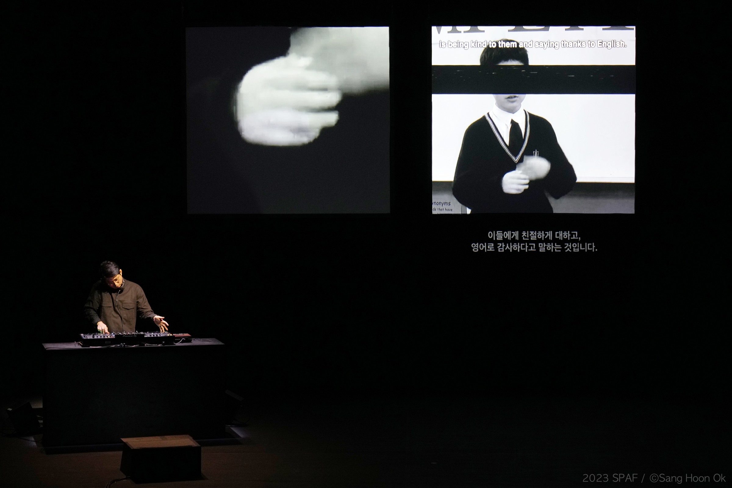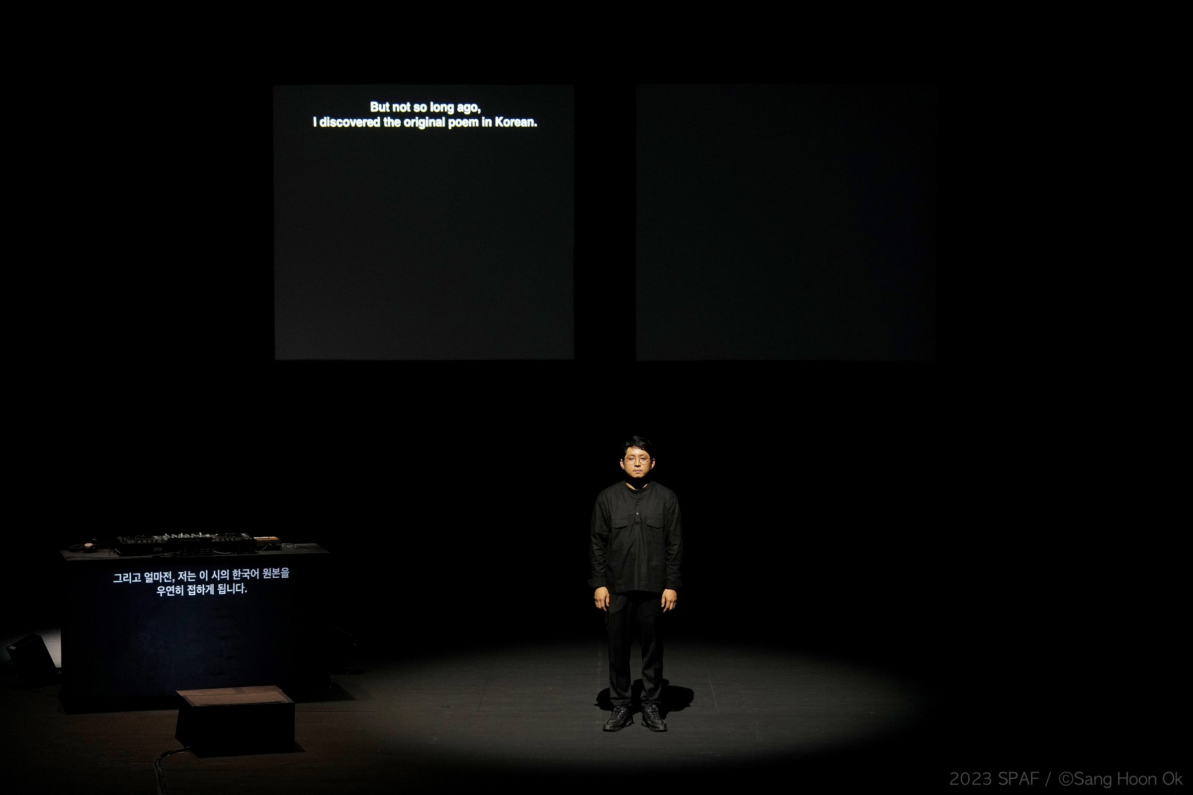 구자하, 〈롤링 앤 롤링 Lolling and Rolling〉 2023 SPAF ⓒ Sang Hoon Ok(이하 상동). 〈롤링 앤 롤링〉은 한국 사회에 자리한 영어 교육 강박이라는 무의식을 포착한다. 이는 직접적인 사회 비판이나 풍자로 부상하기보다는 사적 이야기의 맥락 아래 가라앉는다. 후자를 성립시키는 건 자못 비장하고 우울한 구자하의 퍼포머로서의 태도이다. 유럽에 갔을 때 첫 번째 자신의 영어 선생과의 격의 없는 친구와도 같은 관계는 구자하의 경험이다. 이러한 부분은 사실상 미시적이고 잉여적인 부분으로 보이며, 나아가 극의 주제로 보기는 어렵다고 보이지만, 실은 그것이 주는 안온함은 영어 강박을 앓는 한국인의 의식을 대체한다.
