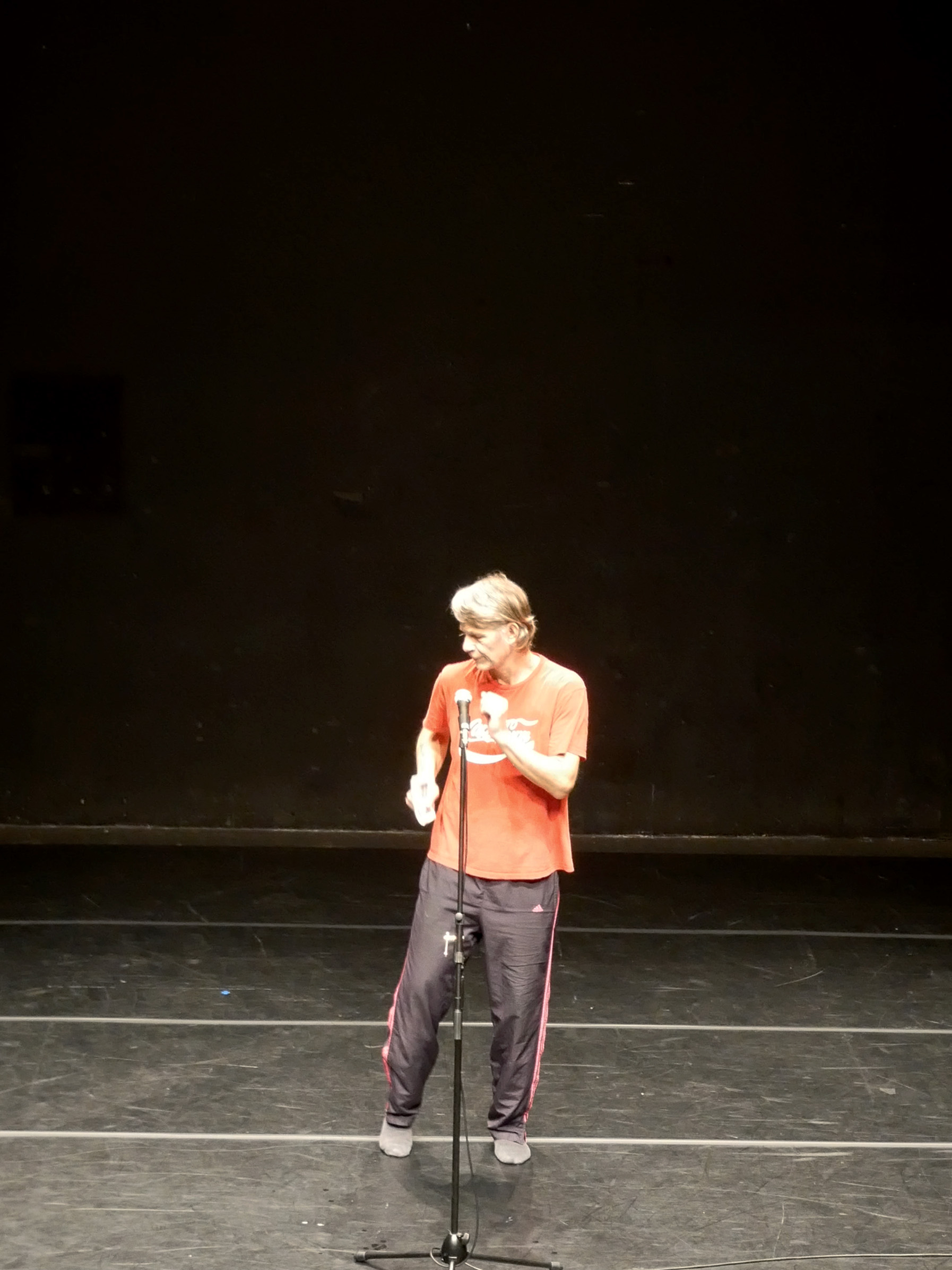 마텐 스팽베르크, 〈감정으로부터 힘을 얻다〉© 옵신페스티벌 제공(이하 상동). “감정으로부터 힘을 얻다”에서 “감정”은 작품에서 직접 언급되는 단어는 아니지만, 주요한 매체로서 확인된다. 사실이라면, 그것은 “힘”을 추동한다. 이는 움직임의 어떤 프로세스를 지시한다. 마텐은 움직임의 형태가 아닌, 재현 체계의 질서를 드러내고자 한다. “바흐 《골드베르크 변주곡》에 춤을 추는 스티브 팩스턴을 담은 발터 베르딘의 영상의 춤”에서 “‘부에나 비스타 소셜 클럽’의 노래들”로 분기되는 텅 빈 무대는, 일관된 보여주기를 실천한다. 이에 따라 퍼포머의 역량 자체가 재고의 대상이 된다. 실제, 음악이 입혀지는 움직임이 아니라, 음악에 맞춰 춤을 추는 것이 드러난다. 곧 약간의 오차―음악의 박자를 살짝 늦게 체현하는 움직임, 누구라도 출 수 있을 거 같은 뻣뻣한 관절의 적은 가동 범위, 움직임을 실패하거나 음악과 어긋나며 내뱉는 탄식 등 무대와 존재는 완전히 화합하지 않는다.