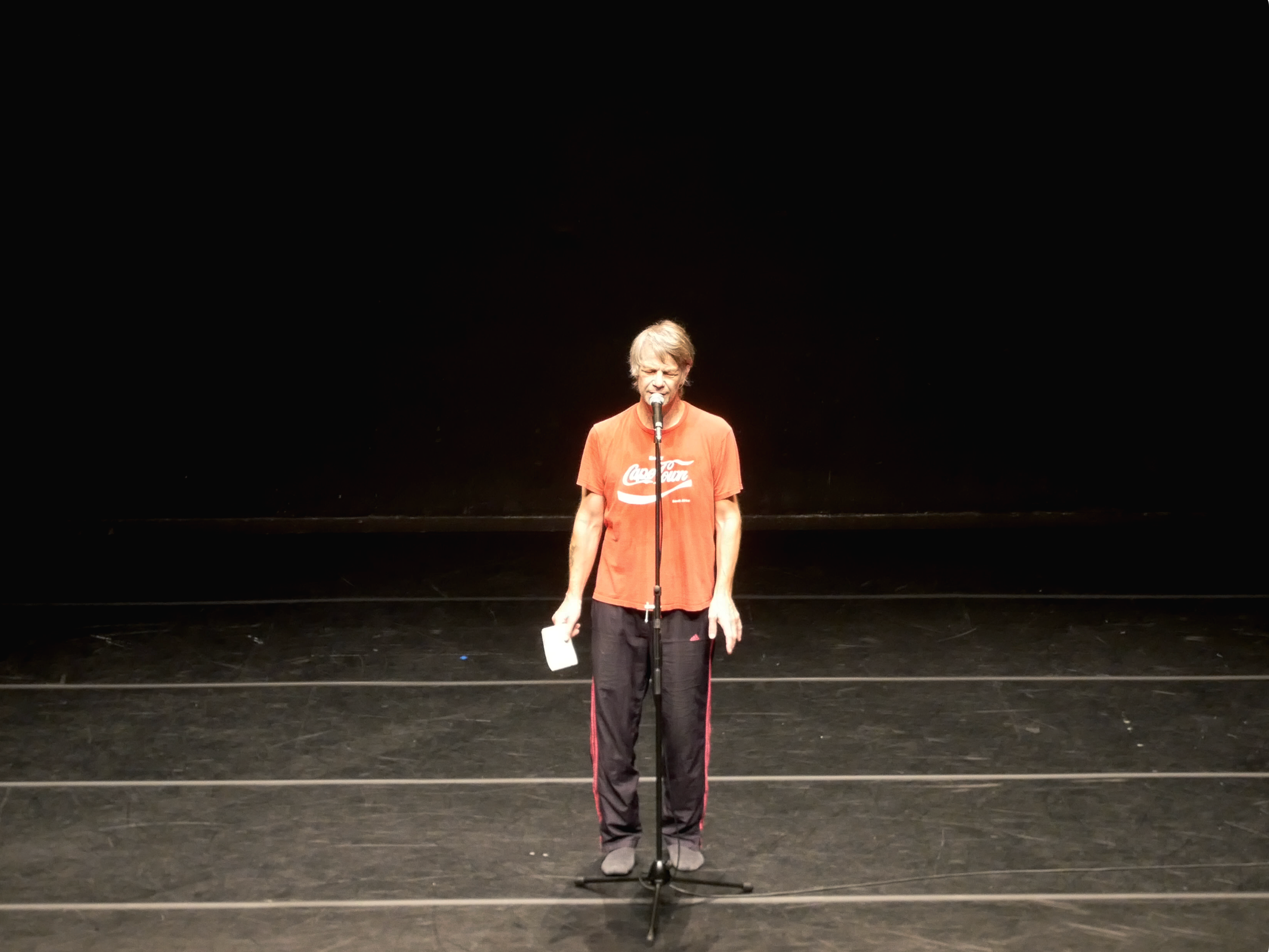 마텐 스팽베르크, 〈감정으로부터 힘을 얻다〉© 옵신페스티벌 제공(이하 상동). “감정으로부터 힘을 얻다”에서 “감정”은 작품에서 직접 언급되는 단어는 아니지만, 주요한 매체로서 확인된다. 사실이라면, 그것은 “힘”을 추동한다. 이는 움직임의 어떤 프로세스를 지시한다. 마텐은 움직임의 형태가 아닌, 재현 체계의 질서를 드러내고자 한다. “바흐 《골드베르크 변주곡》에 춤을 추는 스티브 팩스턴을 담은 발터 베르딘의 영상의 춤”에서 “‘부에나 비스타 소셜 클럽’의 노래들”로 분기되는 텅 빈 무대는, 일관된 보여주기를 실천한다. 이에 따라 퍼포머의 역량 자체가 재고의 대상이 된다. 실제, 음악이 입혀지는 움직임이 아니라, 음악에 맞춰 춤을 추는 것이 드러난다. 곧 약간의 오차―음악의 박자를 살짝 늦게 체현하는 움직임, 누구라도 출 수 있을 거 같은 뻣뻣한 관절의 적은 가동 범위, 움직임을 실패하거나 음악과 어긋나며 내뱉는 탄식 등 무대와 존재는 완전히 화합하지 않는다.