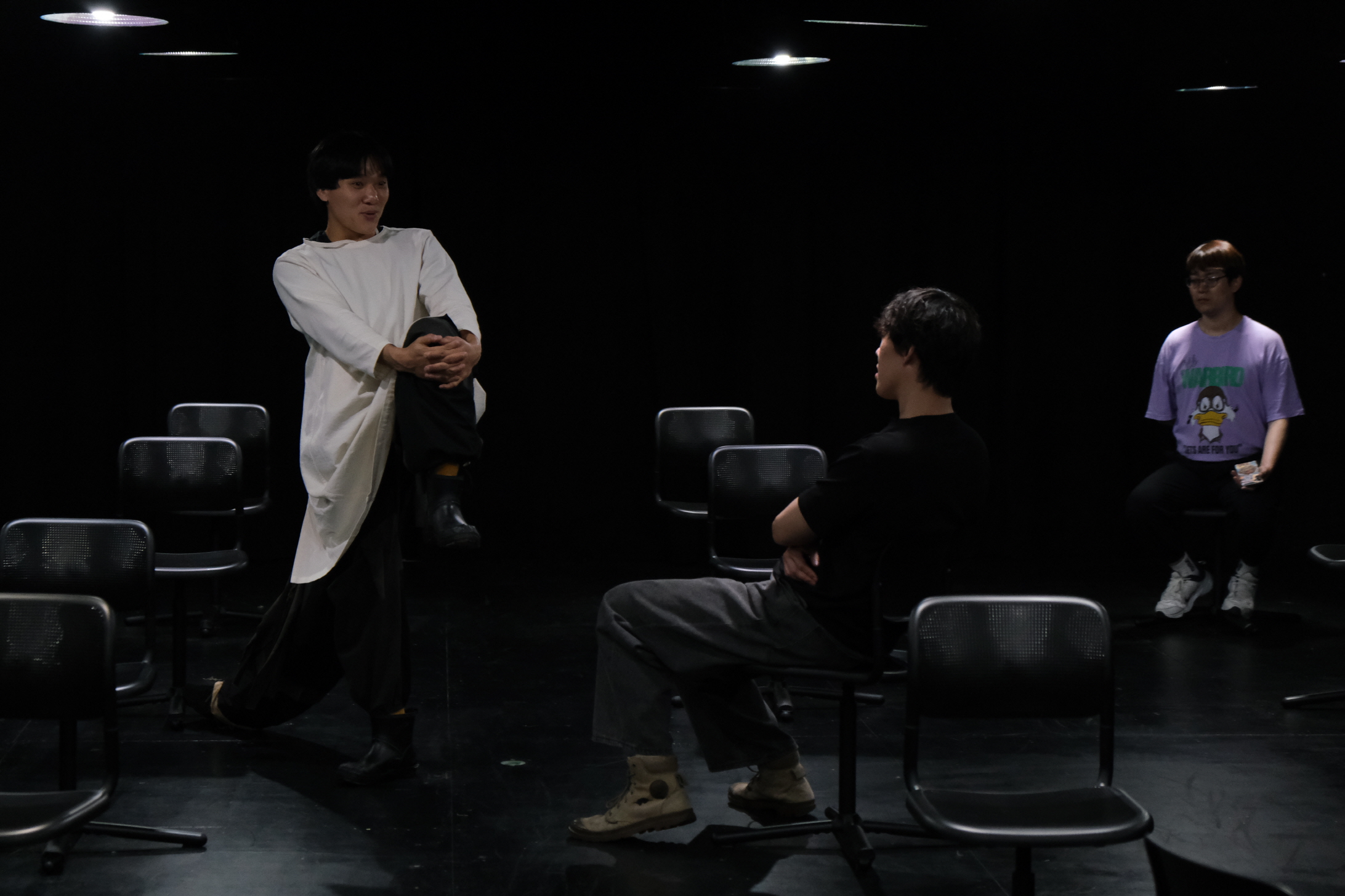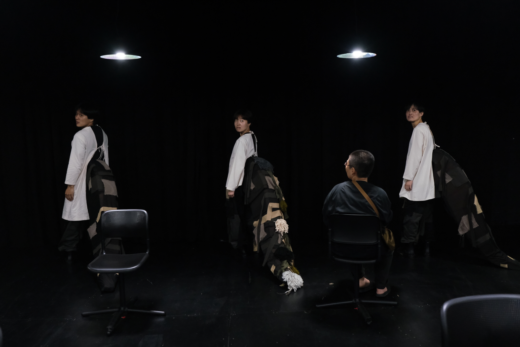 성다인 작·연출, 연극 〈beingbeingbeing〉[사진 제공=성다인](이하 상동). 연극 〈beingbeingbeing〉은 극장의 입구를 끊임없이 더듬는다, 극장이 시작되고 다시 시작됨을 끊임없이 자각하도록 만들며 출구를 부정하는 지시를 통해. 작업은 극장에 대한 탐문으로 자리한다. 이념적인 차원에서 메타-극장을 만드는 것만은 아니다. 거기에는 극장에 갇힌, 또는 닫힌 극장에 놓인 인격들의 무한 반복의 관념과 상념이 또한 있다는 점에서, 해소되지 않은 원환 감정의 고리를 이루는, 일종의 부조리극에 등장하는 캐릭터들이 자리하는 극장을 보여주는 한편, 인격들은 극장 관계자이자 극장 바깥의 역할을 가진 사회적 존재로 연장된다는 점에서, 제도적 차원의 메타포 역시 소환한다.
