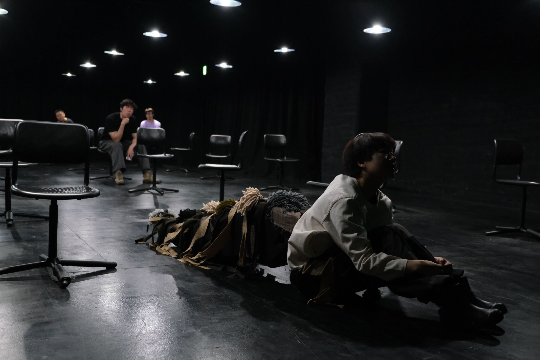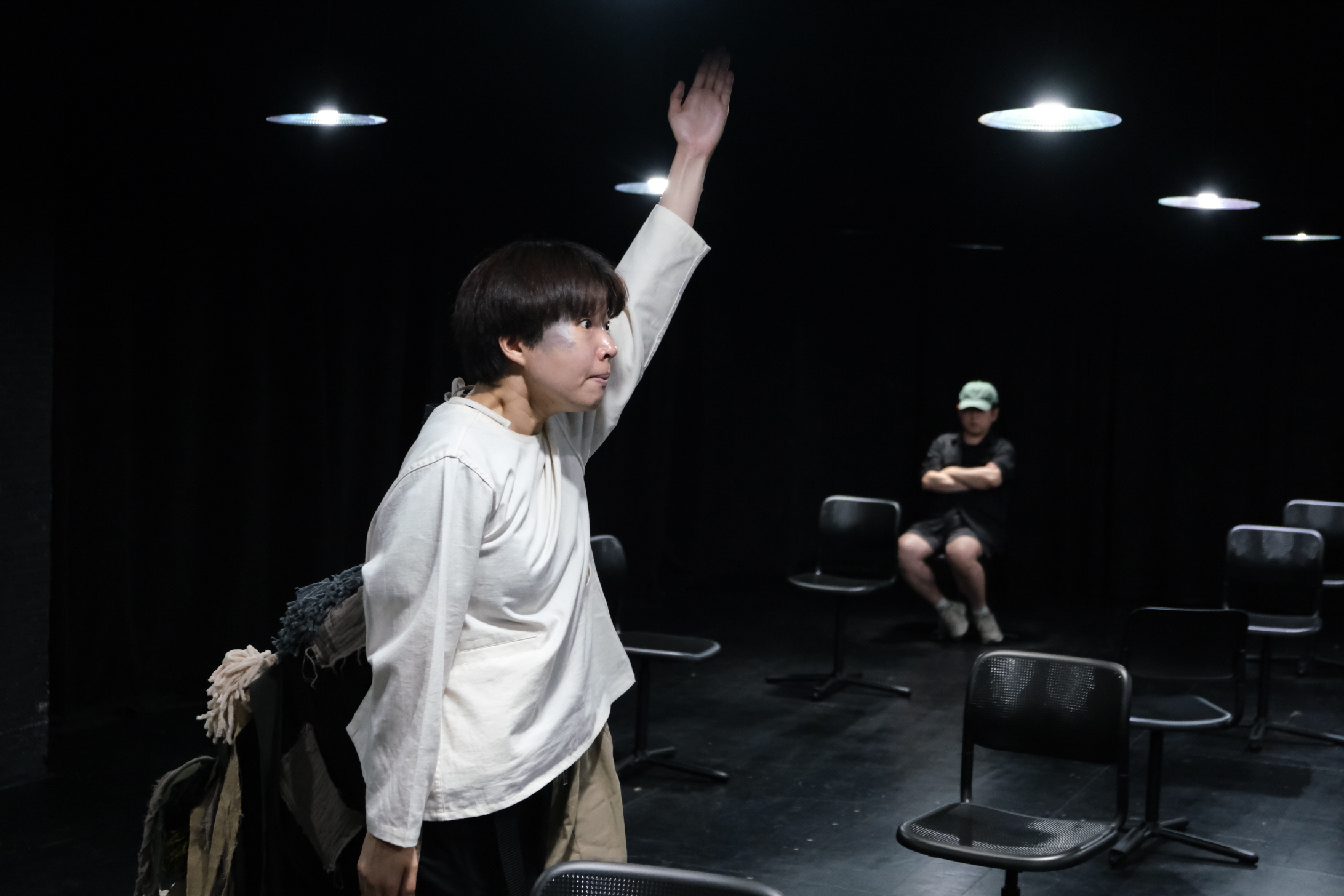 결과적으로 이 셋, 아리(박하늘 배우), 마지(이우람 배우), 사키(백소정 배우)은 무형적이고 유령적인 캐릭터로 읽히지만, 연극계의 구성원이라는 보편적 정서를 가져온다. 보이지 않는 역할, 스스로를 “극장”으로 명명하는 극장(정슬기 배우)은 객석이 아닌, 계단 위의 오퍼석으로부터 들려오며, 이곳이 플라톤의 동굴이었음을 주지한다. 중단을 통해 보이는 것이 어떤 효과들이었음을 드러낸다.