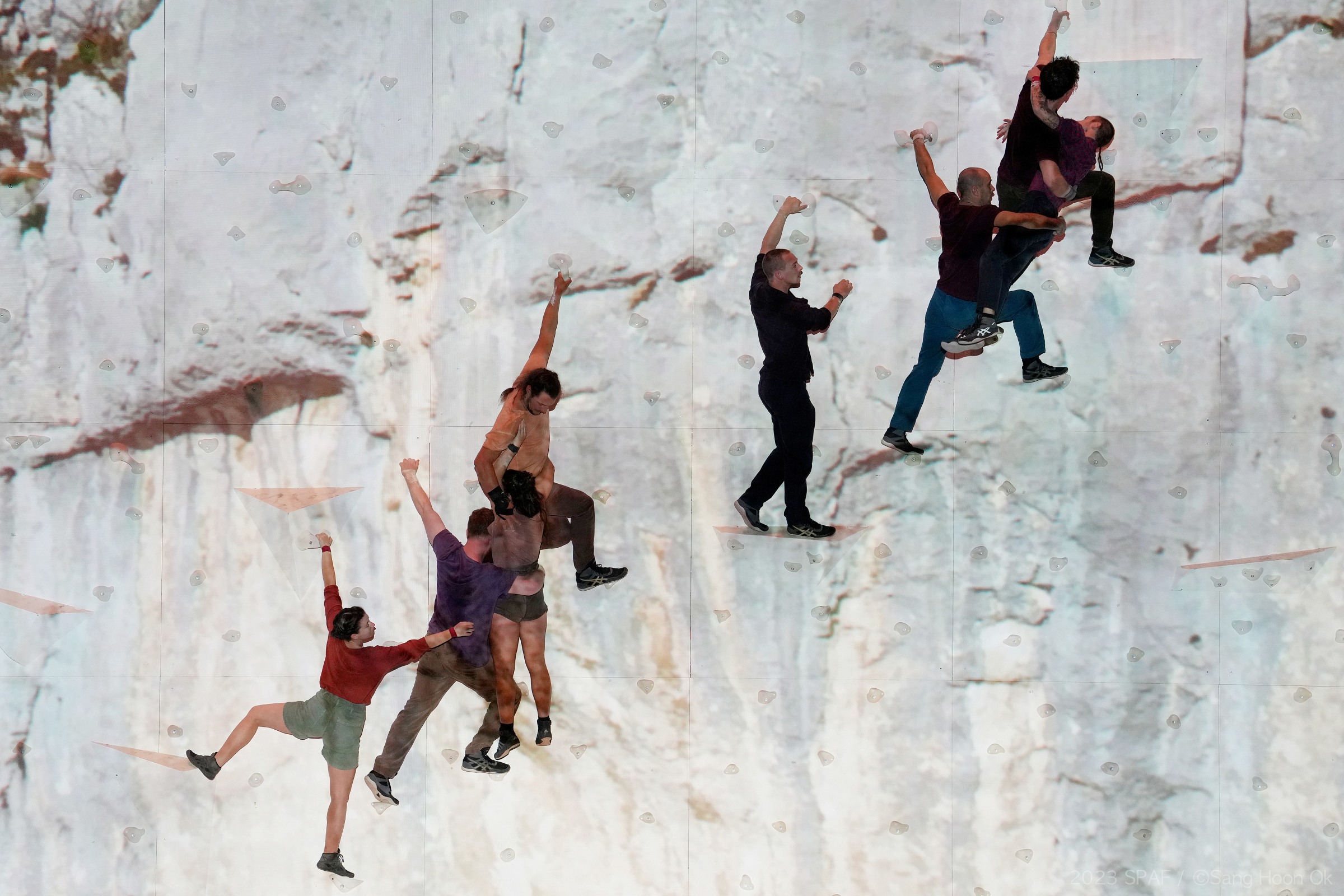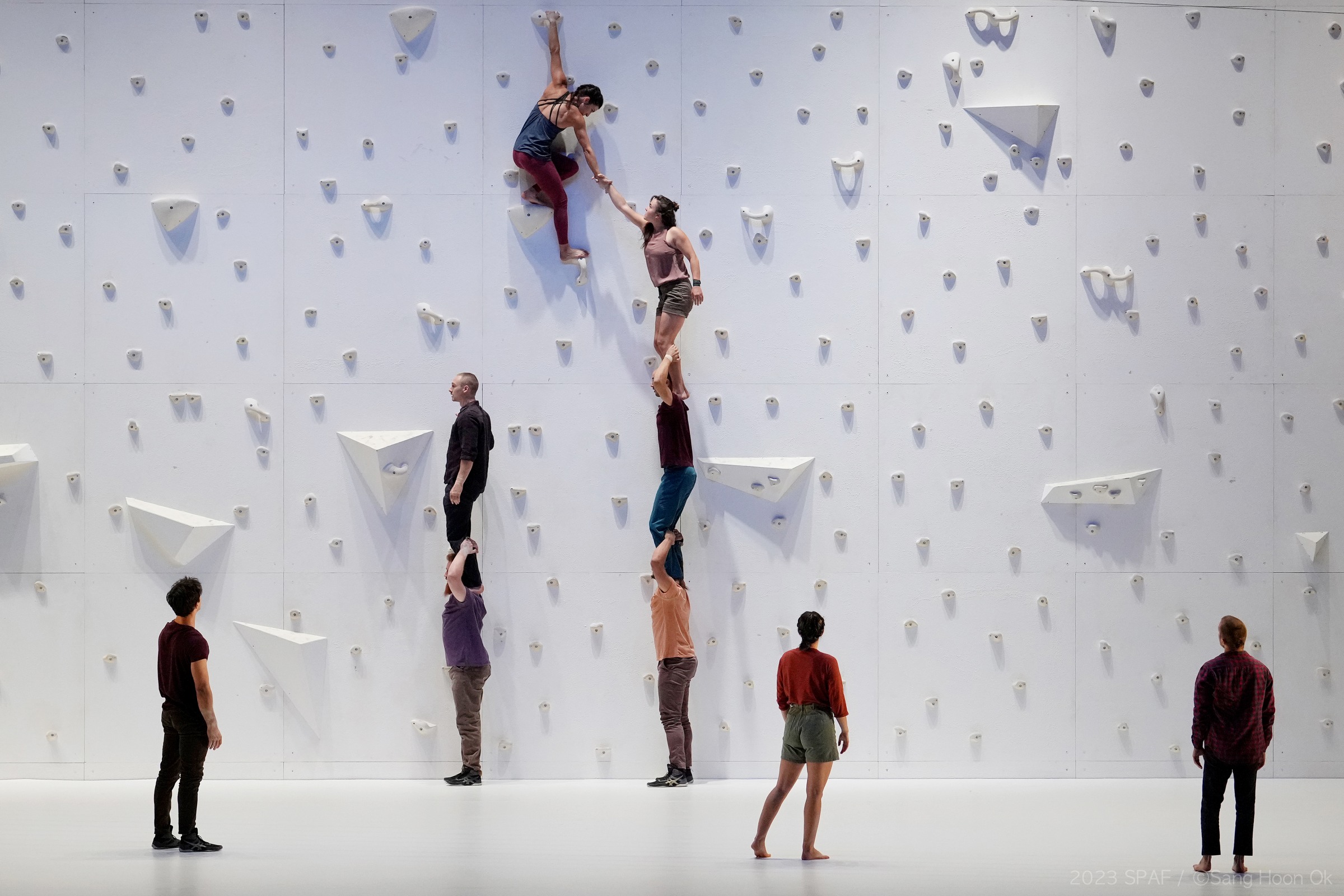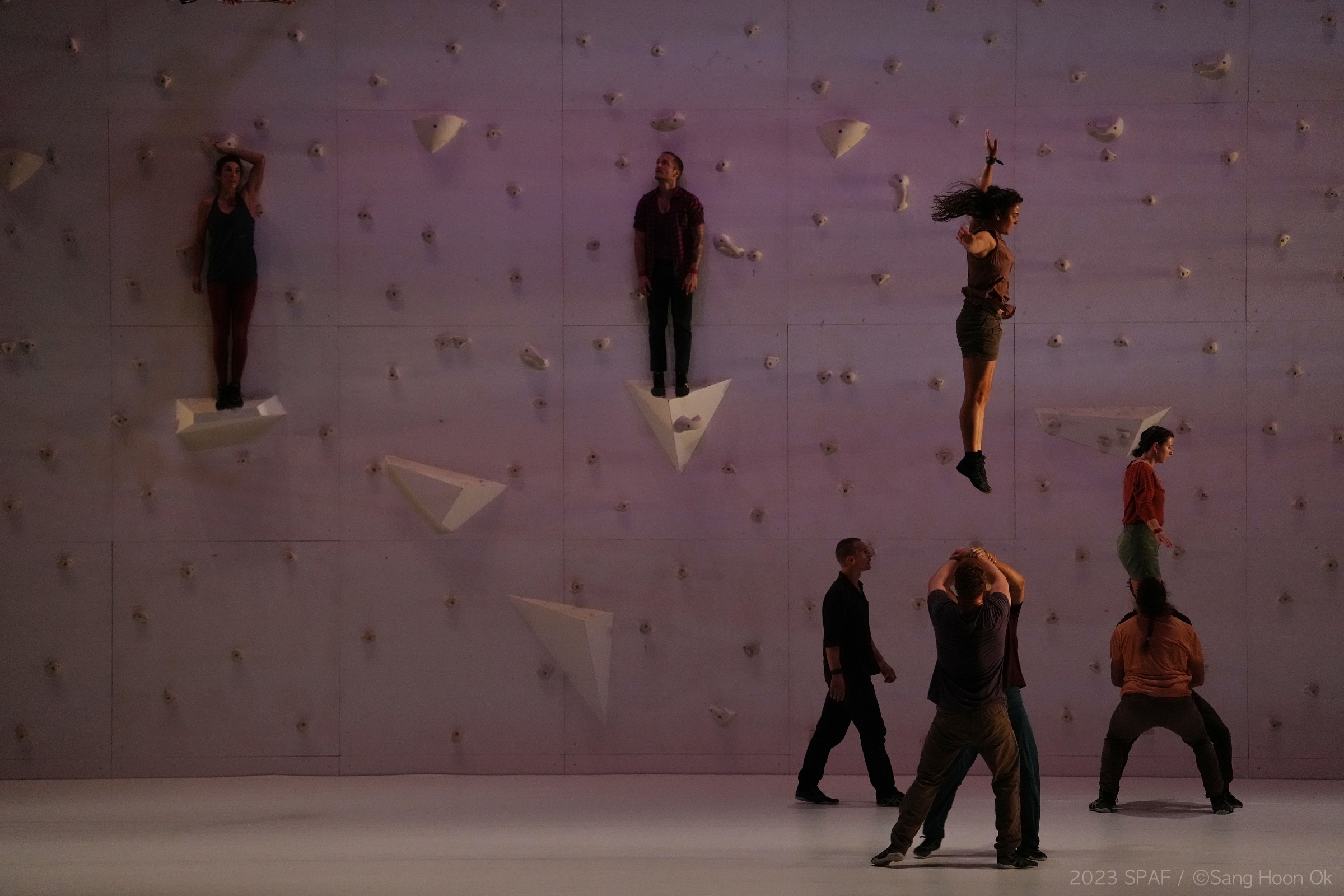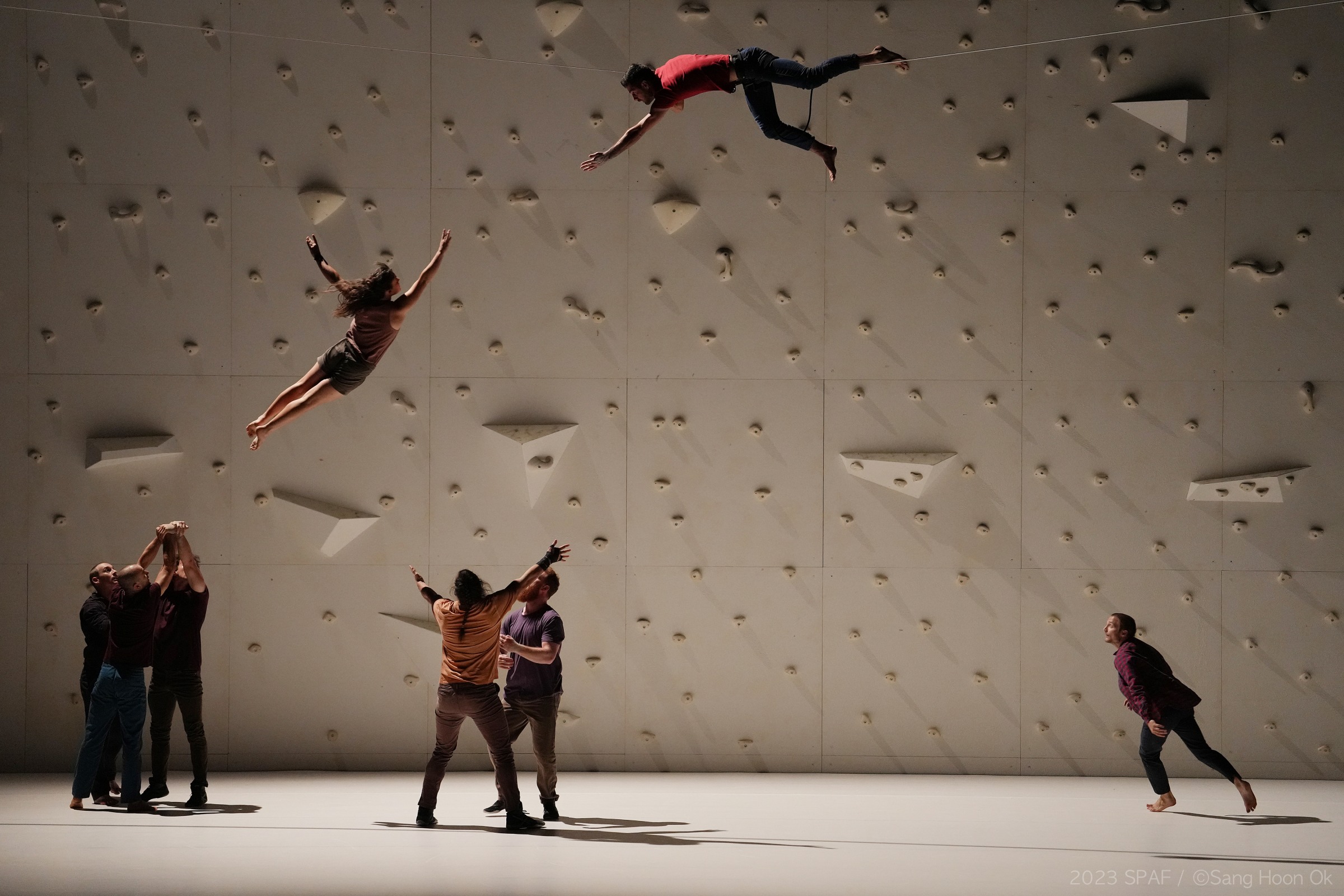 샤요 국립무용극장, 〈익스트림 바디〉, 2023 SPAF ⓒ Sang Hoon Ok(이하 상동). 〈익스트림 바디〉는 무대 바깥의 존재를 무대로 끌어오는 것으로써 작업을 제작해온 라시드 우람단의 콘셉트에서 시작되었으며, 프랑스의 줄타기 선수 나단 폴린(Nathan Paulin)과 스위스 클라이밍 선수 니나 카프레즈(Nina Caprez) 외 8명의 곡예사가 나오는 무대는, 현존과 재현의 간격을 새롭게 쓰는 것과 함께 인지적으로 확장된 무대 공간을 구성한다. 줄타기와 클라이밍의 수행은 두 다른 인물의 서사와만 결부되지만, 무대에는 중첩되어 제시된다. 허공에 매달려 있는 나단의 손에 다른 퍼포머들의 손이 닿으려는 찰라, 또는 간발의 차로 닿지 못하는 모습으로 두 수행의 공간이 겹침으로 인한 시공간의 제약 또는 또 다른 가능성을 시험하고 연기한다.