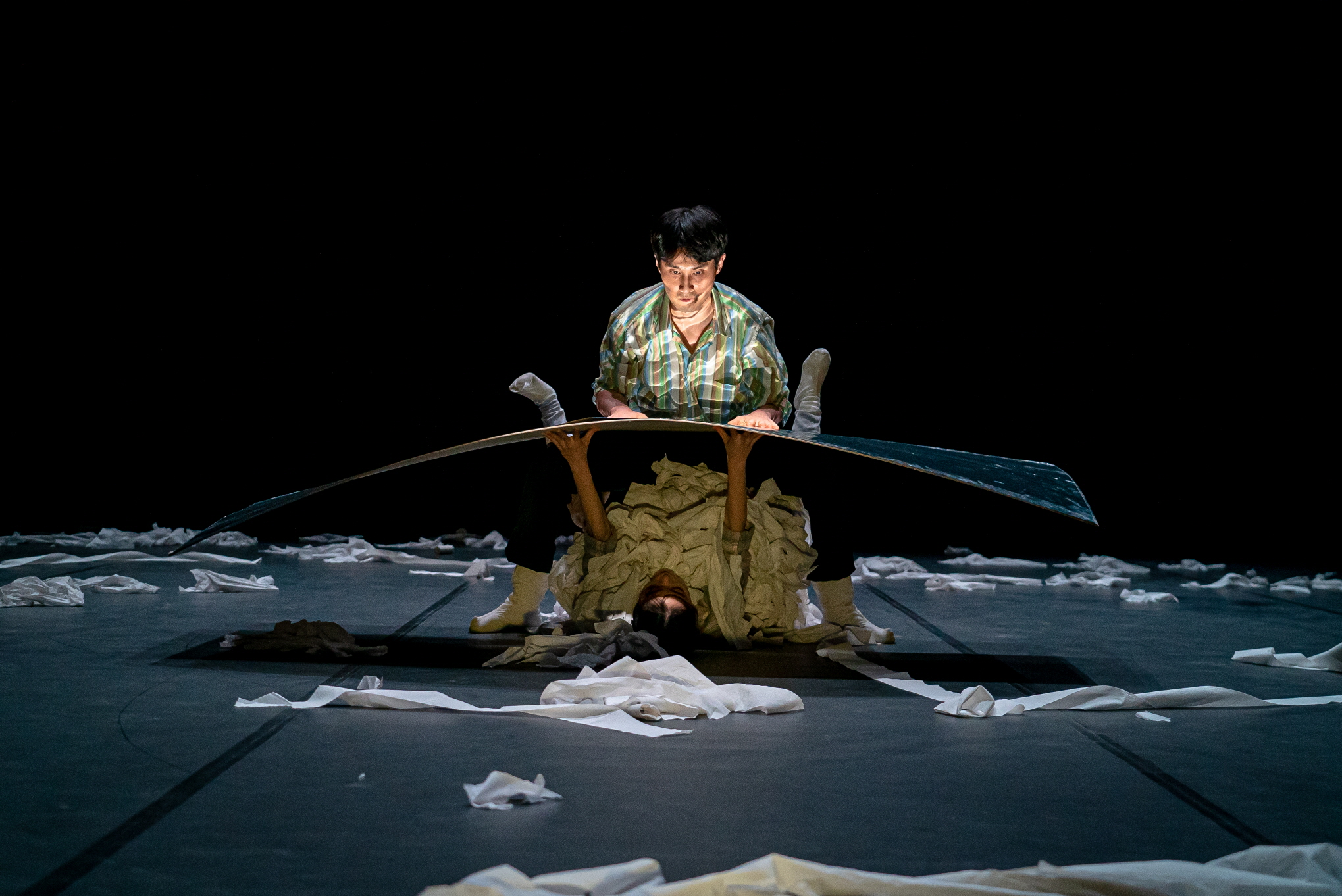 바닥에 놓인 거울지(mirror-紙)에 휴짓조각이 들어차고, 거울지는 신체 기관의 은유가 된다. 더 정확히는 그와 공간에서 접면하는 존재의 신체들이 대등한 신체, 곧 조작 가능한 잠재적 신체로 변환한다. 존재들은 그 안에 들어가 눕기 때문이다. 대상은 신체의 확장이 아니라, 신체의 기관을 재구성한다. 대상은 신체의 외부가 아니라, 신체의 내재화를 구성한다. 이 신체의 뒤틀림은 빛의 확장된 뒤틀림으로 이어진다. 여기에는 다소 긴 적막이 따르고, 이는 공연이 끝났다는 인상과 약간의 소요 비슷한 동요를 불러일으킨다. 그리고 무대 중앙에 커다란 두 눈으로 거울지에 재접지된 신체 양상이 드러난다.