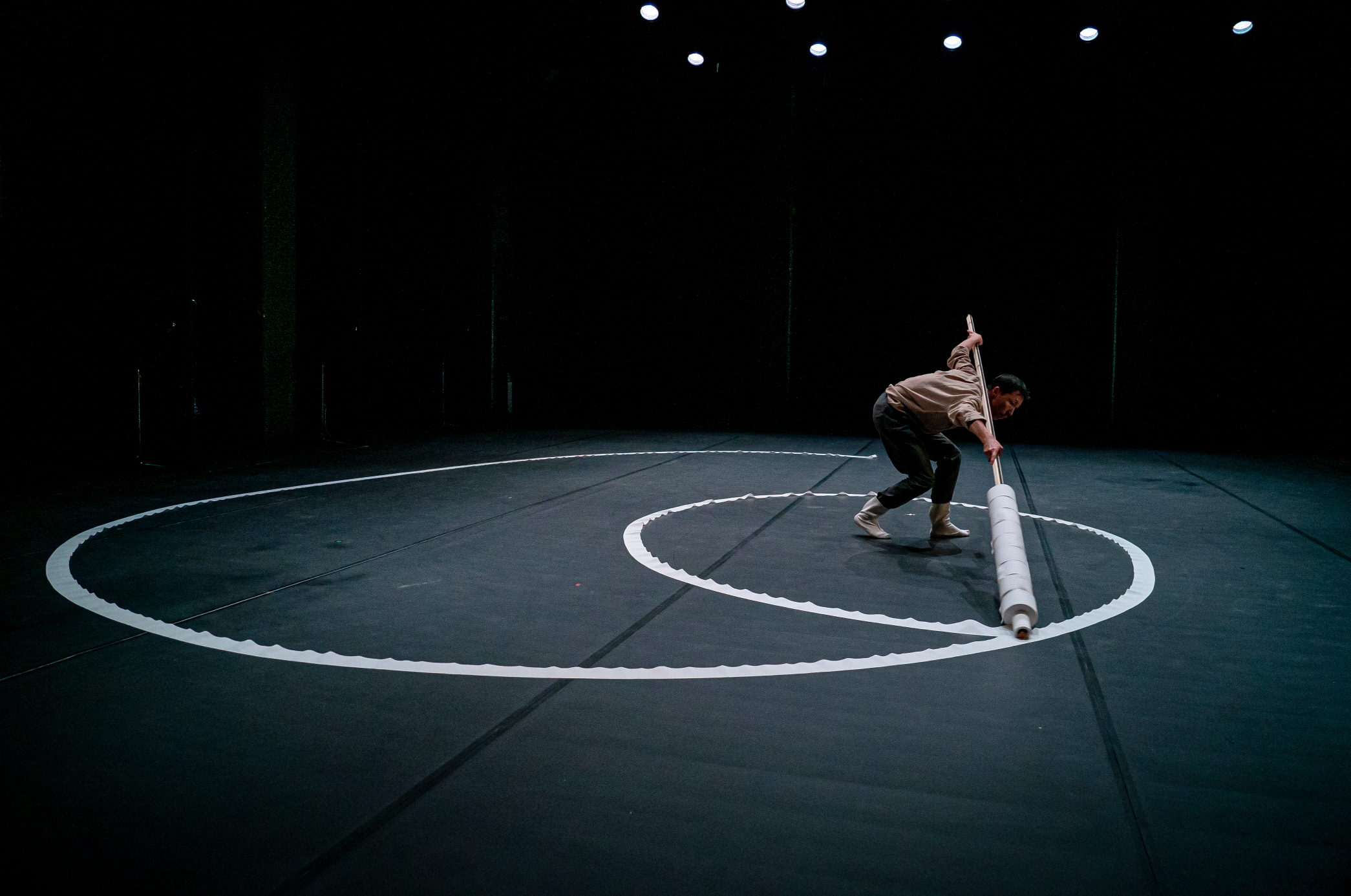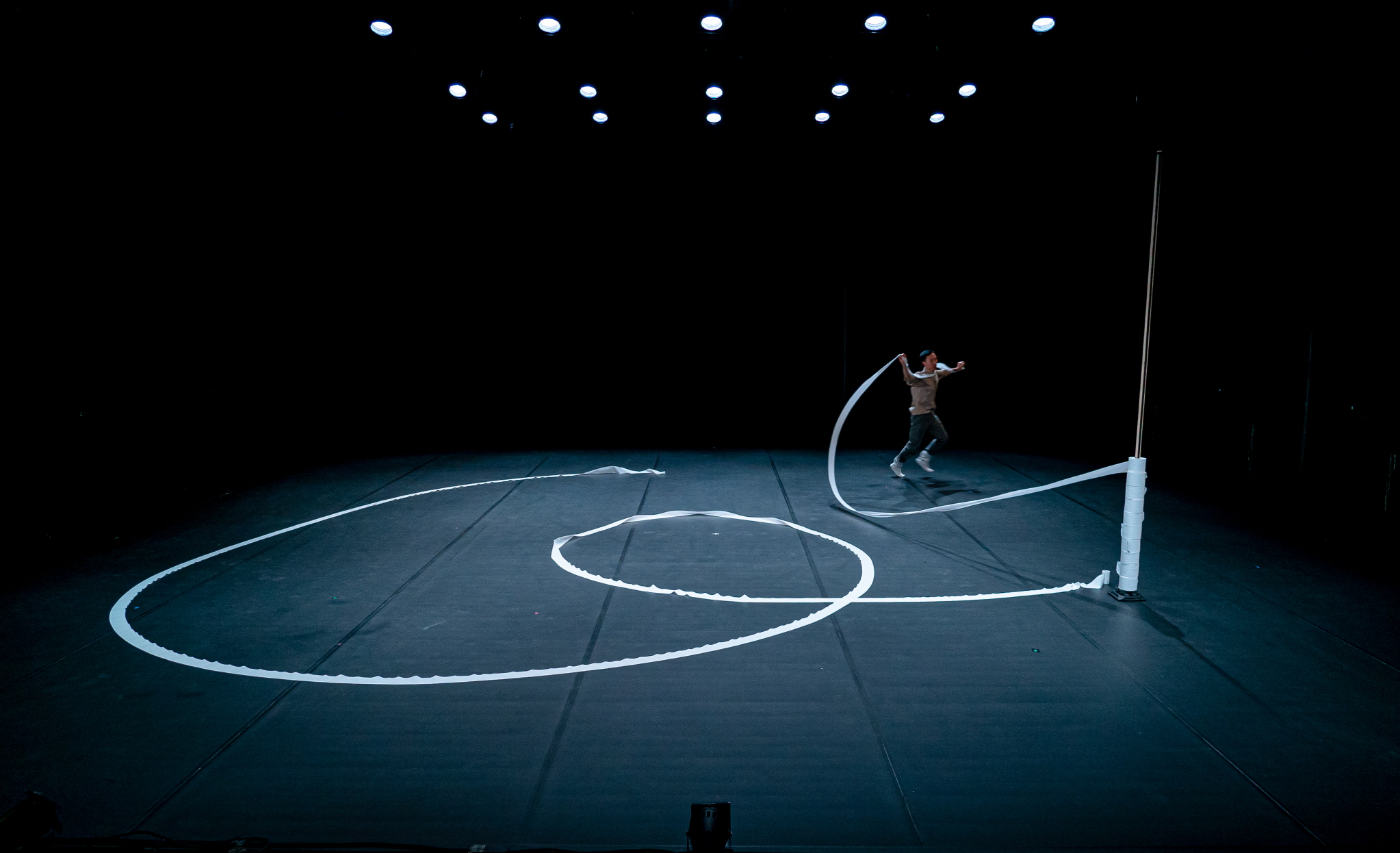 이후 등장한 금배섭은 커다란 장대로 천장에 달린 두루마리 휴지를 따고 장대로 스르륵 통과시킨다. 사물이 풀려나가는 해제는 보이는 대신 소리로 남는다. 이 소리 연속체의 총체가 극장을 관통하고 극장에 대한 관통을 추동한다. 장대에 꽂힌 휴지가 덜거덕거리는 소리는 미소하고 급격하게 작은 공간의 사이를 유동하며 나는, 작지만 거대한 실재일 것이다. 두 사람이 붙잡은 장대 사이를 오가는, 두루마리 휴지가 두 사람의 관계 안의 장력에서 벗어나, 극장을 선회하는 움직임과 함께 풀려나가는 것은, 비예측적인 파편들의 물결이라는 의도된 그림을 구성하는 것으로 향해 간다. 이러한 ‘물결’은 공중에 뜬 하나의 이미지의 고착과 흩날림의 경계 너머 지연 작용을 일으킨다. ‘하얀’ 사물을 비추는 조명은 스트로보 조명 효과와 같이 드러난다.