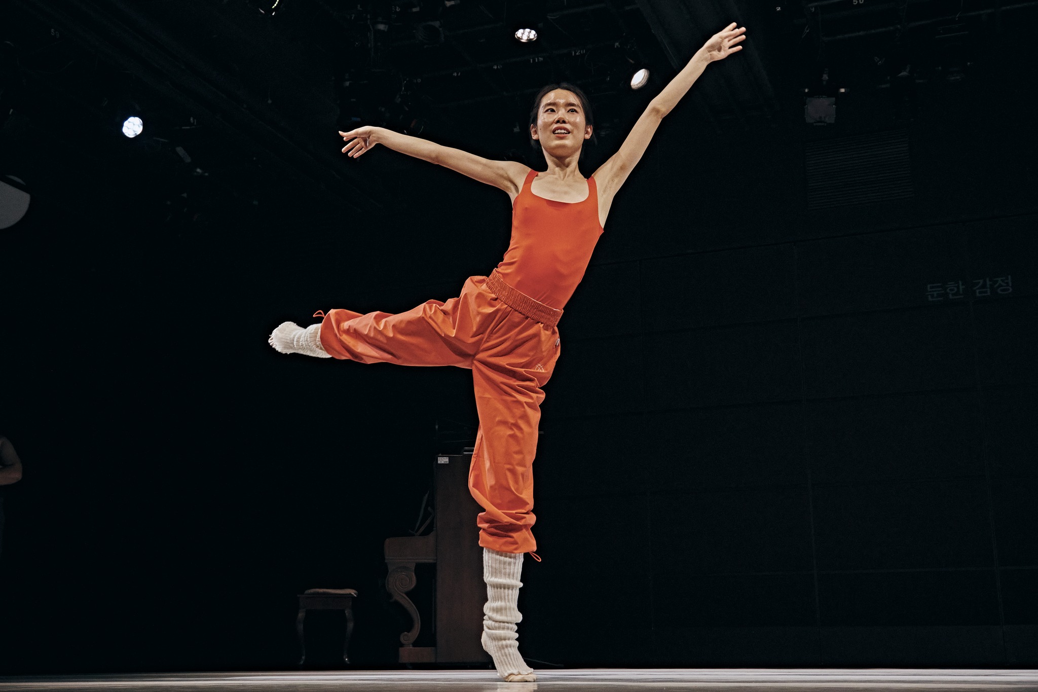 예컨대 그것은 형용사다, “게으른 파세”(파세: 한 다리로 서서, 다른 다리의 발끝을 선 다리의 무릎까지 끌어올린 자세)와 같이. 심미적인 것과 대별되는, 일상적인 태도나 의식이 들어오기 시작한다. 그것은 발레가 준별해 온 의식 바깥의 틈을 최대한 허용하고자 한다. 뭔가 성의 없거나 심드렁한 태도들이 밀려오다가 화를 내는 것과 같이 히스테리한 것의 폭발로 이어지기도 한다. 물론 이는 자막에 따른, 발레의 창조적 타협의 사례들일 뿐이다―자막은 형용사를 번역하지 않았다는 점에서 다른 발레는 곧 발레라는 것을 지시한 것으로도 볼 수 있을 것이다.