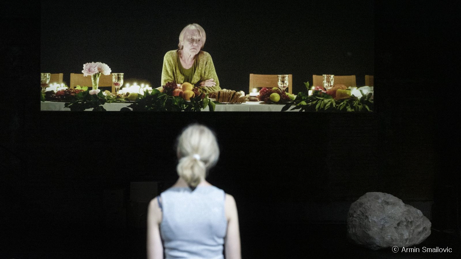 밀로 라우, 〈에브리우먼〉[사진 제공=국립극장] ⓒArmin Smailovic(이하 상동). 〈에브리우먼〉은 무대에 홀로 현존하는, 배우 우르시나 라르디의 전적인 매개의 위치를 상정하며, 스크린의 영상을 병치시키되 이 역시 라르디의 신체를 경유하여 재생한다. 〈에브리우먼〉은 휴고 폰 호프만스탈의 『예더만』을 가져오되(“예더만”은 ‘모든’과 ‘사람’이 합성된 하나의 단어로서, ‘누구든지’, ‘모두 다’라는 이 단어에서 영어로 man에 해당하는 부분을 woman으로 바꾼 제목이 〈에브리우먼〉인 셈이다.), 헬가 베다우라는 시한부 선고를 맞은 현재적 인물을 겹쳐 놓음으로써 죽음이라는 알레고리를 도덕적인 교훈극이 아닌, 하나의 수행사적인 효과를 창출할 수 있는지를 시험하고자 한다.