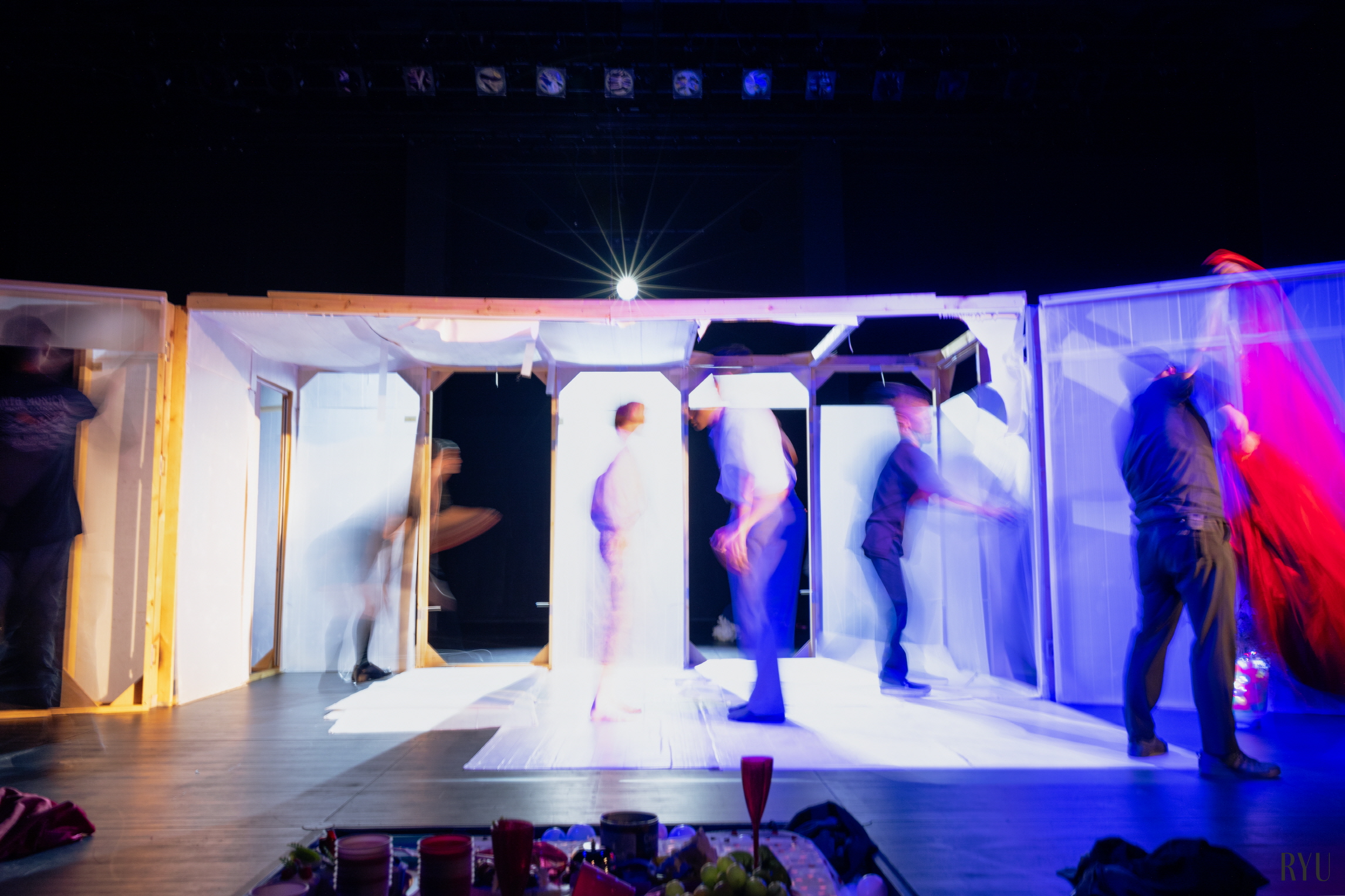 이가영 안무, 〈비수기〉ⓒ류진욱(이하 상동). 〈비수기〉는 현실 공간의 전유와 문화 양식의 참조를 통해 완성된다. 이는 무대가 실존적 주체의 무정형적 터전이 되는 대부분의 공연과 다르게, 무대가 현실의 변형이거나 변환이라는 차원에서 출발함을 의미하는 한편, 현실 공간이 극장을 다른 세계의 입구로 지정하고 있음을 또한 의미한다. 그 변환은 이 공간에서라기보다 이 공간 내에서 이뤄짐으로써 가능해진다. 두 남녀가 앞쪽의 테이블을 항하여 바닥이 파인 중앙의 자리에 앉고 정면의 스크린을 응시하는 첫 번째 장은, 병풍과 같은 무대가 반쯤 옆으로 펼쳐지는 데 이어 마지막으로 비닐막이 걷히고 완전히 확장된 세트 아래서 종결된다.
