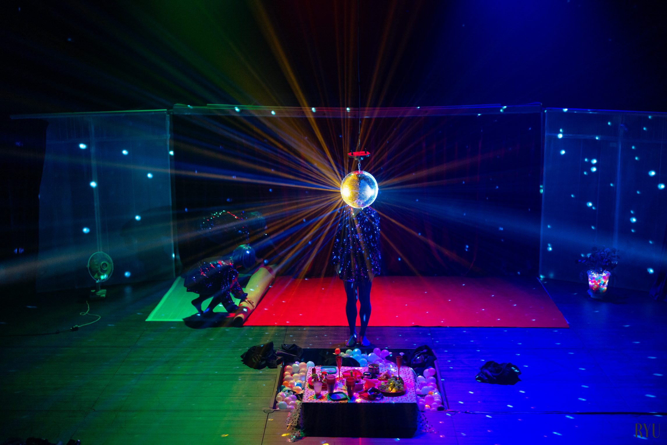 이 장(면)은 〈비수기〉에서 유일하게/예외적으로 춤의 정면성을 벗어나며 무대로의 직접적인 가시화가 아닌 전략을 취한다. 결과적으로 장소 ‘위’에서의 춤, 장소를 무대화하며 추던 춤은 장소 자체의 춤, 장소가 지시하는 현실에서의 춤으로 전환된다. 이러한 장소는 인테리어의 현실에서, 스튜디오로의 전환으로 연장된다. 가장 처음 남녀가 앉았던 자리 아래에는 갖가지 볼이 있었고, 테이블에는 포도알이, 위에는 미러볼이 있었다. 구의 도상으로 연합되는 환경은 임시적 무대를 위한 디자인의 영역이기도 하다. 앞서 언급한, 남녀의 춤이 지속되는 가운데, 뜯고 변형되는 스튜디오로서의 장소적 지시는 춤 자체보다는 춤이 놓이는 조건을 반향한다.