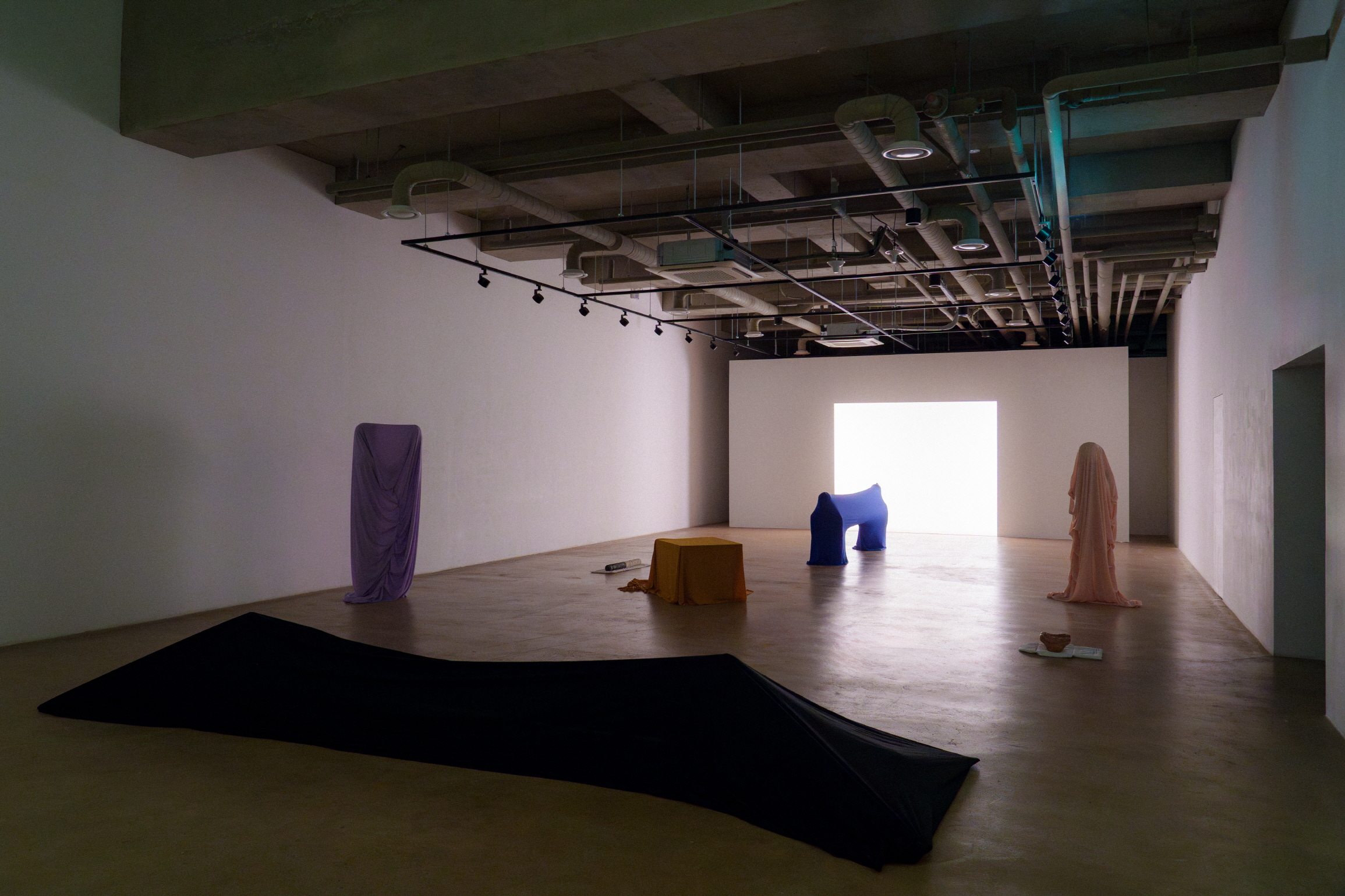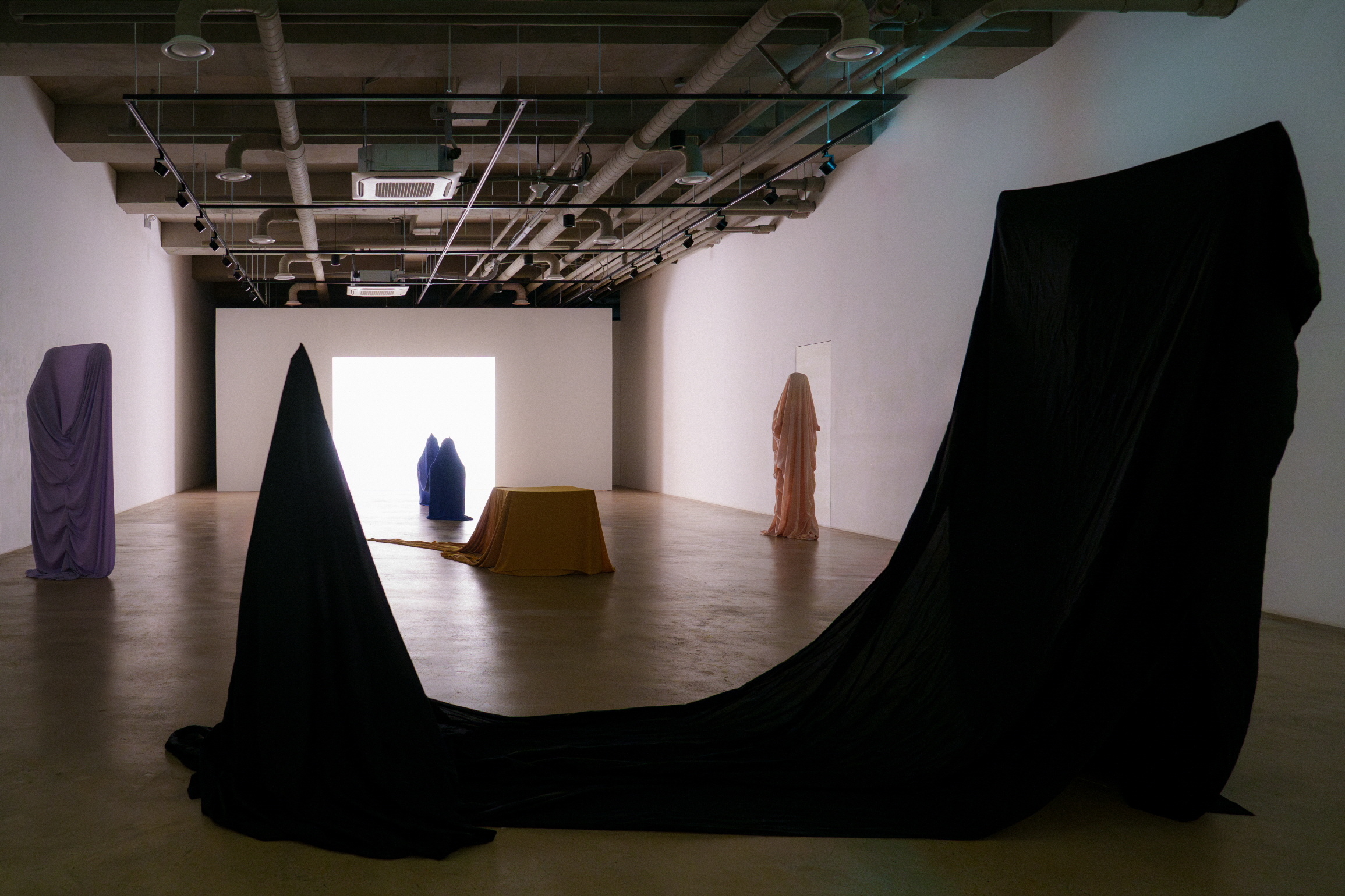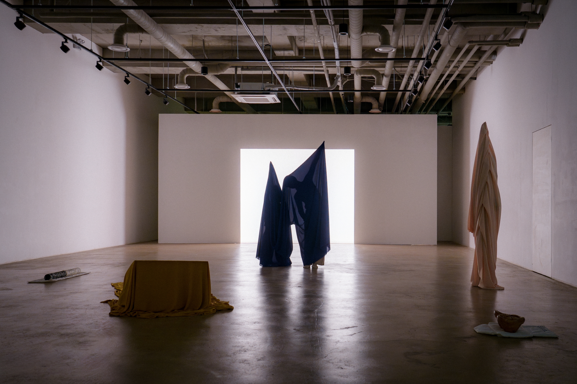 원단을 걸친 다섯 개의 조각 〈히포로히〉(2024. 파란색 쉬폰 원단, 면실, 가변크기, 러닝타임 50분.), 〈로삭〉(2024. 검은 아사 원단, 면실, 가변크기, 러닝타임 40분.), 〈위-스-톨치-주〉(2024. 라벤더색 쉬폰 원단, 면실, 가변크기, 러닝타임 38분.), 〈위-스-톨치-우〉(2024. 살구색 쉬폰 원단, 면실, 가변크기, 러닝타임 38분.), 〈루투투무오〉(2024. 머스타드색 쉬폰 원탄, 면실, 가변크기, 러닝타임 35분.)은 주요한 퍼포먼스의 체현 대상으로, 여기서 일종의 영화와 같은 스크리닝의 형식이나 퍼포먼스를 포함한 상연 형식에 해당되는 용어인 러닝타임이 각기 다르게 적용되고 있음이 특이한데, 실제 그 다섯 대상은 시간의 차이에 따라 더 빠르게 등장하고 뒤늦게 퇴장하는 대상과 그 반대의 대상 간의 순차적인 등장과 퇴장이 적용된다.