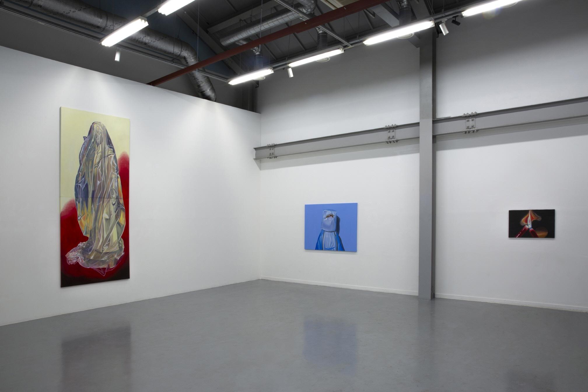 ▲ 희박. 《썩지 않는 금은 없다》 전시 전경, (사진 왼쪽부터) 〈Prussian〉(2025. 캔버스에 유채, 325×130.3cm.), 〈Pink to Purple〉(2025. 캔버스에 유채, 325×130.3cm.), 〈Butter〉(2025. 캔버스에 유채, 325×130.3cm.)[사진=작가 제공]. 희박 작가의 《썩지 않는 금은 없다》는 일곱 점의 회화로 구성되며, 작은 큐브의 공간으로 높은 천장고에 상응하는, 비닐에 싸인 바뇌의 성모를 그린, 세 개의 대형 작품과 상대적으로 작고 다양한 주제의 네 작품이 있다. 중심 도상인 성모를 비롯한, 하나의 공통된 토대는 배경이다. 배경에는 어떤 사물도 없고 일정한 톤을 형성한다―〈축하 케이크 Celebratory Cake〉(2025. Oil on canvas, 65.1×90.9cm.)는 그 예외이며, 예외성은 또한 전시장 바깥의 윈도우에 따로 전시되었다는 것으로 발현된다. 배경은 첫 번째로 피사체가 자리한 현실을 지우거나 축소하거나 은폐하며, 두 번째로 그 현실이 자리한 시간성을 소거한다.