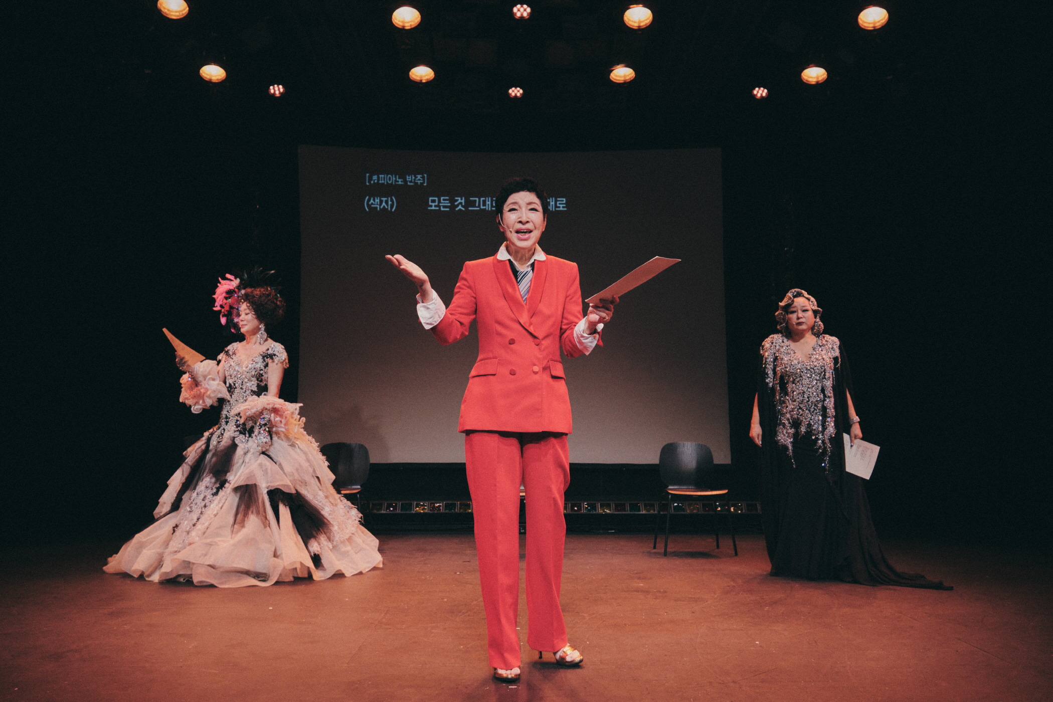 미란의 최신 발표곡도 라이브로 연출되는 한편, 마지막 무대는 프랭크 시나트라의 〈My Way〉를 개사해 유일하게 셋이서 부른다. 가사가 적힌 종이를 받아들고 부르는 유일한 장면이기도 한 이 무대는, 이들의 고유성의 발화가 무대 위의 배우가 행하는 가장이 아니라 존재론적 수행임을, 그 존재의 고유한 발현을 기꺼운 운명으로 수용하며 ‘나의 길’을 가겠다는 의지와 정념, 셋의 공통됨으로부터 파생되는 또 다른 세계의 구축에서 오는 정동을 함께 드러낸다.