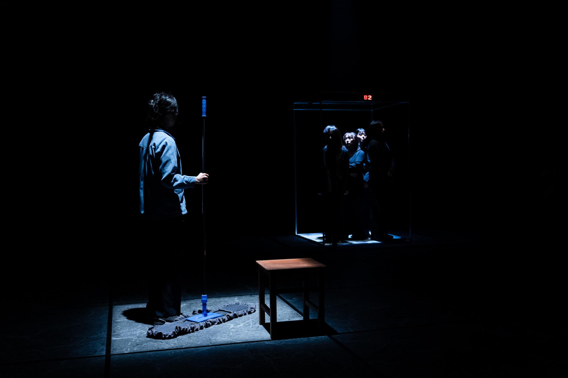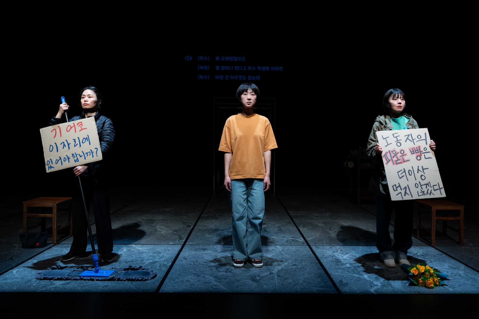이예본 작가, 극단Y: 〈로비: 기어코 그 손을 잡고〉 © 이미지작업장 박태양 (이하 상동). 〈로비: 기어코 그 손을 잡고〉(이하 〈로비〉)는 청소노동자의 노동 행위와 산재 사고로 죽음을 맞은 이의 유가족의 팻말 시위가 겹쳐지는 하나의 지대를 로비로 제시한다. 이는 중앙의 직육면체의 프레임 안에 숫자를 표시하는 상단의 LED 문자가 엘리베이터 공간으로 확장되는 것과 함께, 고층 건물의 수평적, 수직적 차원에서의 직선의 선분이 각각 펼쳐지고 확산되는 것으로 상상된다. 또한 로비는 일종의 인트로에 해당하는, 〈로비〉의 등장인물들이 무더기로 지나가는 짧은 장면으로써 무정형의 사람들이, 보통의 바쁜 현대인이 냉랭하게 또는 생기 없이 지나가는 특색 없는 통로를 나타내며, 무엇보다 이를 생계의 차원으로 전유하는 복희(한혜진 배우)의 존재가 이곳을 가장 먼저 그의 삶의 일부로서 주요하게 점유한다.