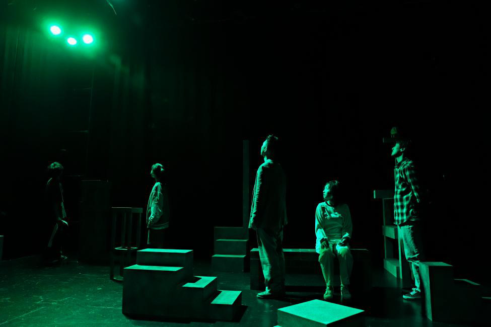 김상훈 작, 박해성 연출, 〈러브미투마로우〉상상만발극장 ©옥상훈(이하 상동). 〈러브미투마로우〉에서 과잉된 무대 장치, 곧 무대 위에 놓인 비석 구조물들은 복잡한 지형지물의 한 전경으로 묶이는 대신, 편재된 비동시성의 동시성 아래 각각의 자리로 할당된다. 이 하나의 터전 아래 상응되는 유사성의 한 계열들―구조물들―은 하나의 매끈한 장면으로 처리되기에는 과포화된 상태로서 무대를 가로막고 제한하고 있으며, 인물들은 그 일부를 일시적으로 점유하고 거주하며, 그 구조물들로부터 발화하며 생성된다(는 점에서 그것들은 물론 제약 조건이 아니며 결과적으로 창발의 노드들에 가깝다).