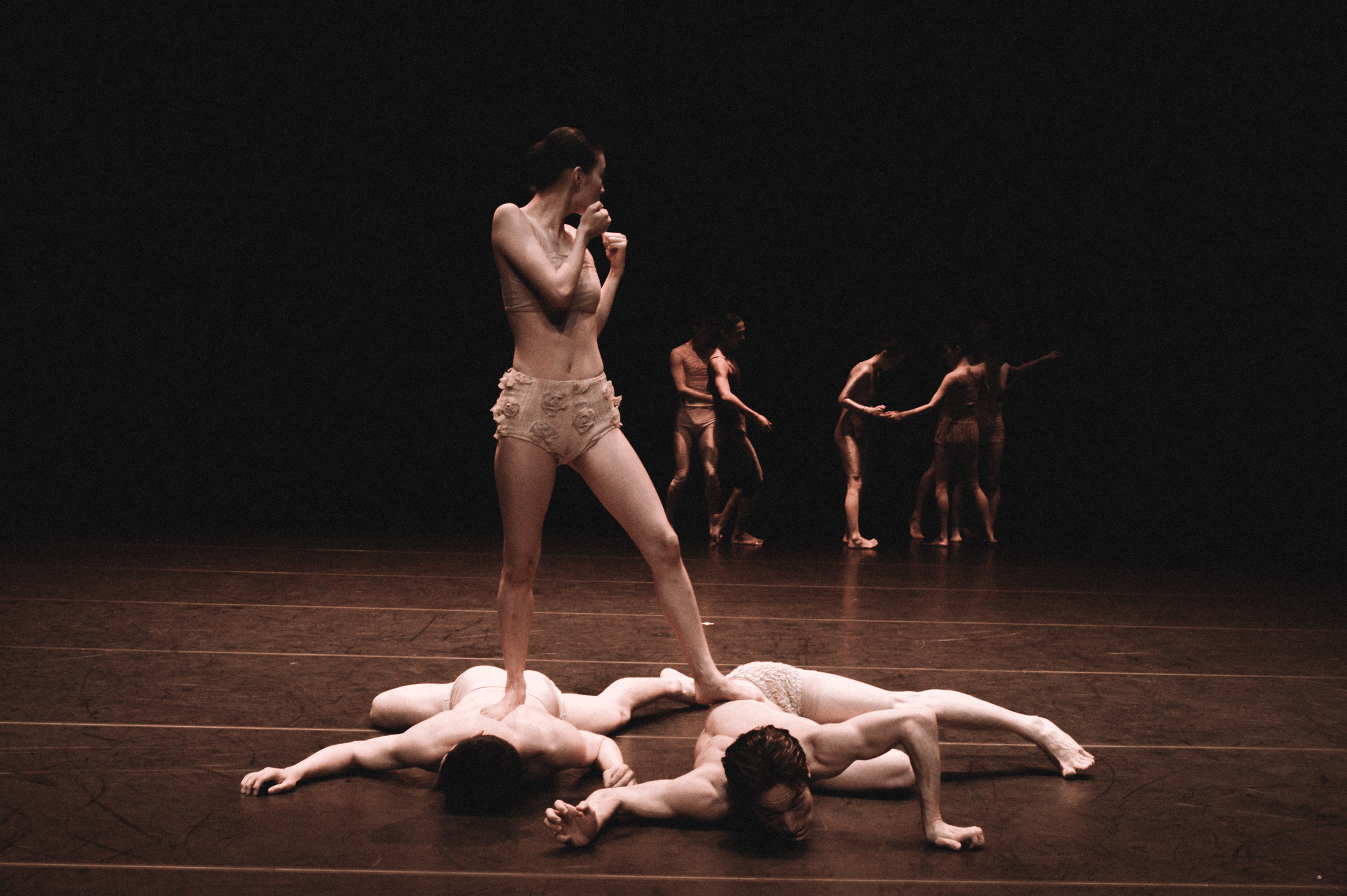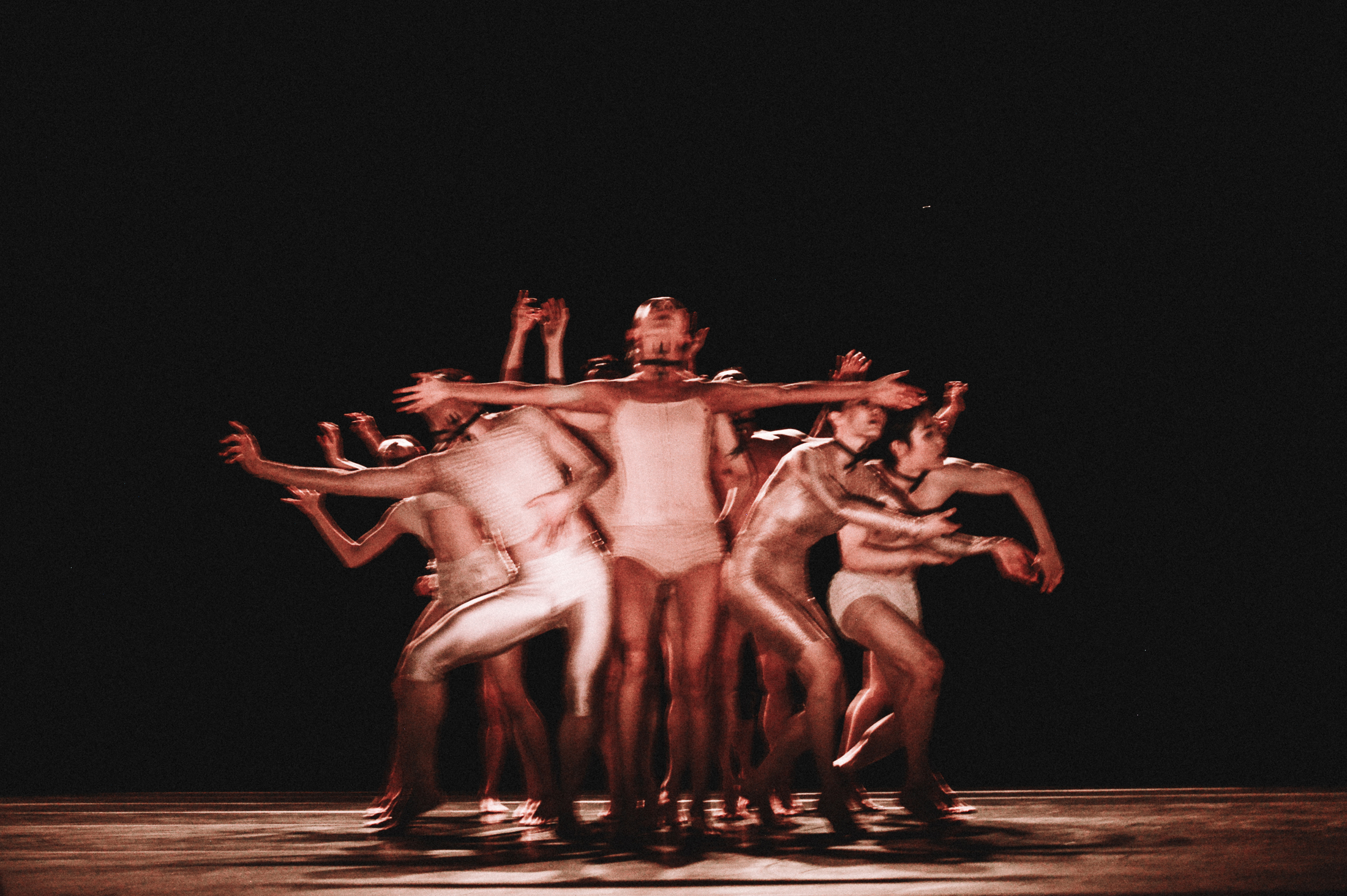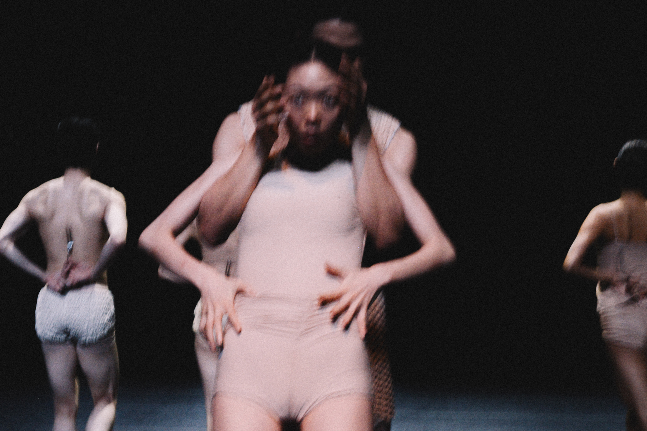 이러한 입속 모양을 오브제 없이 옮기는 예외적 존재인 배진호의 좌측 바닥 위의 조명을 사선으로 받으며, 뒷걸음질과 좌우 방향 전환과 반복으로 이어지는 고독한 몸짓에서 집단적 움직임으로 확장되면서부터 형상은 자신을 지정할 준비를 갖춘다. 오른쪽으로 기울어진 몸의 축을 유지한 채 세부만을 초점화하는 대략적인 움직임의 개요는, 앞선 더딘, 묘연한 대기를 극단적으로 그렇지만 압축된 긴장 아래 그야말로 ‘조용하게’ 폭발시키는 것과 같은데, 절단된 분출, 또는 아슬아슬하게 균형 잡힌 몸의 토대에서 세부로의 이행은 짧은 순간 흩어진 형상의 잔해들을 완전히 동결시킨다.